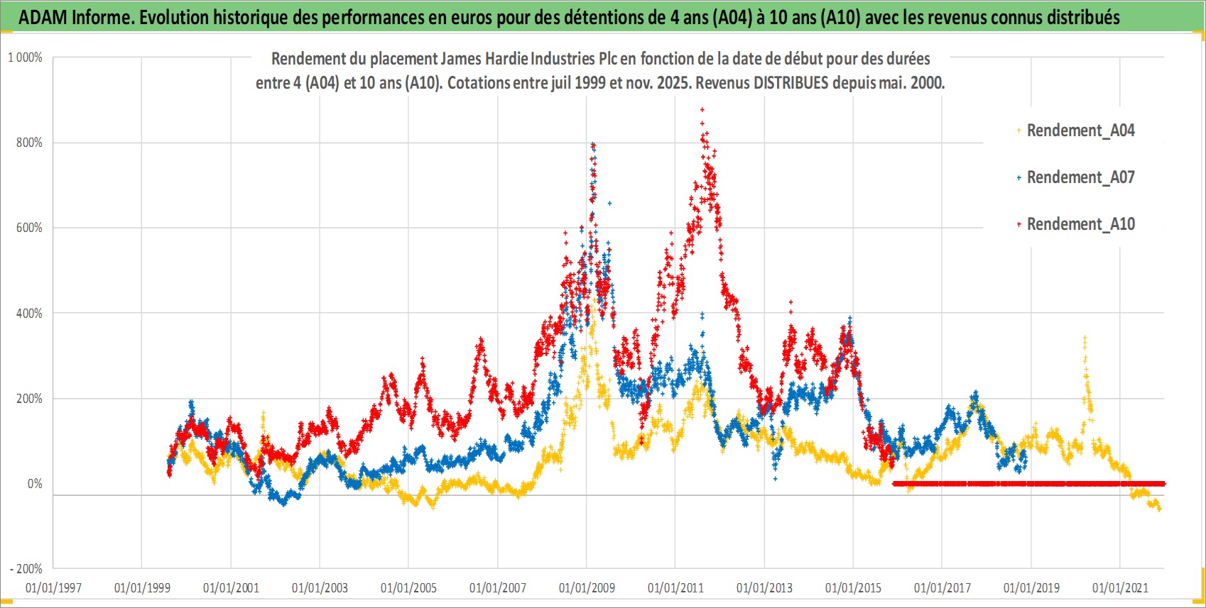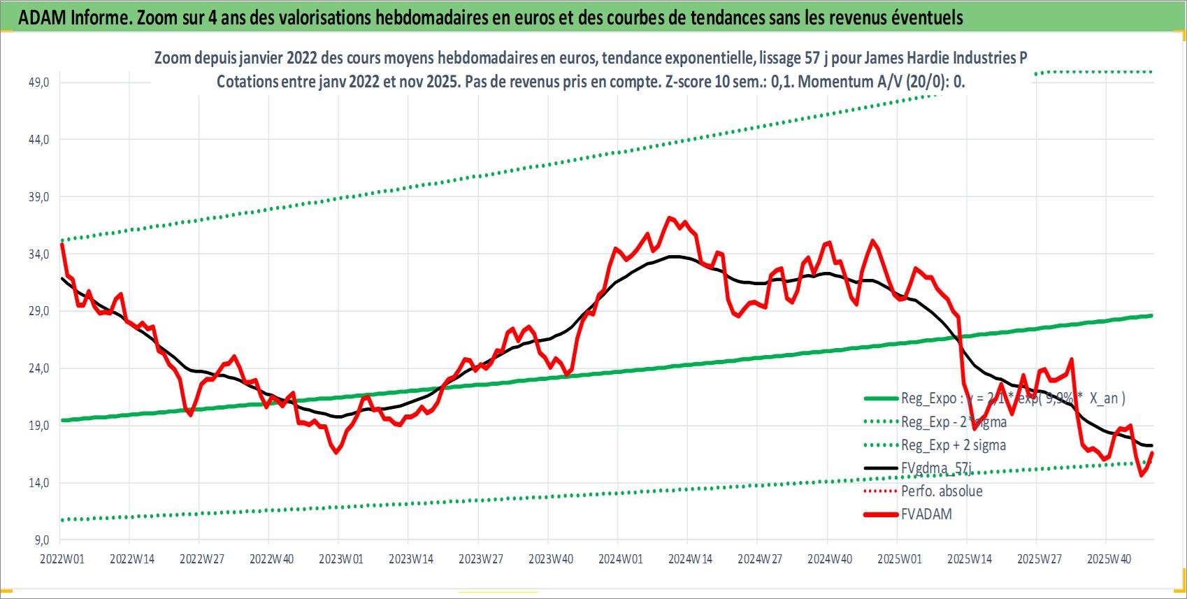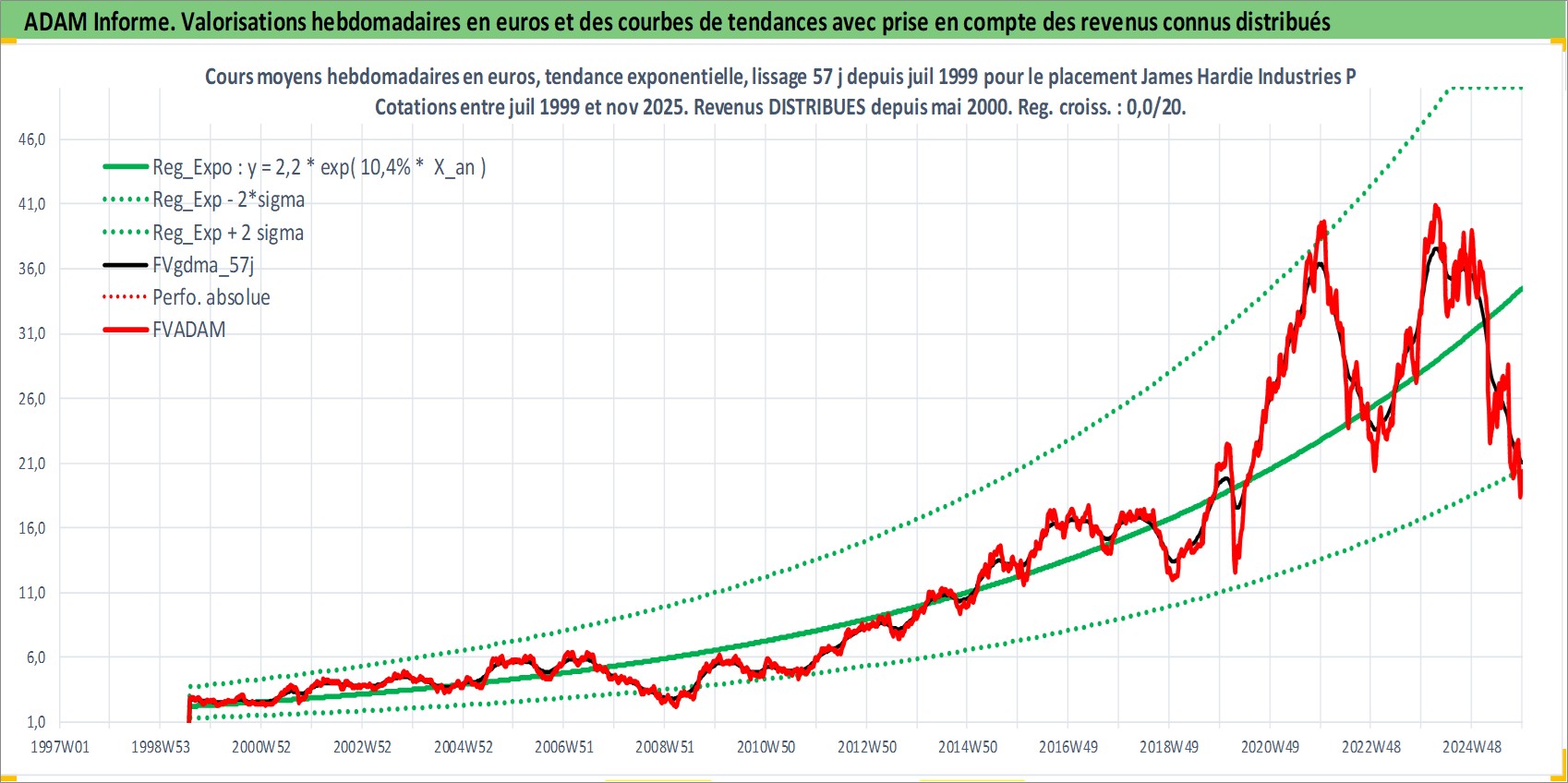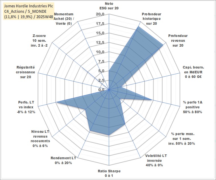 Site dédié aux investisseursPage dédiée sur site financeAnalyse des valorisations hebdomadaires de l'action James Hardie Industries Plc. Cet actif est cote en AUD. Les valorisations sont en contrevaleur EURO et couvrent les semaines 1999W30 a 2025W48. Les revenus de cet actif financier sont pris en compte depuis la semaine 2000W21. La note globale ESG de cet actif est estimee a 5.0 (apres rebasage entre 0 et 20).