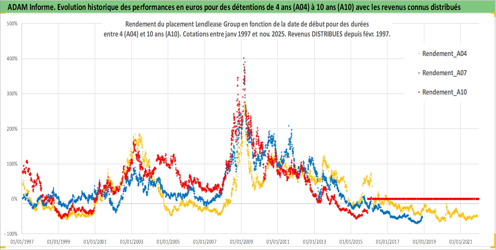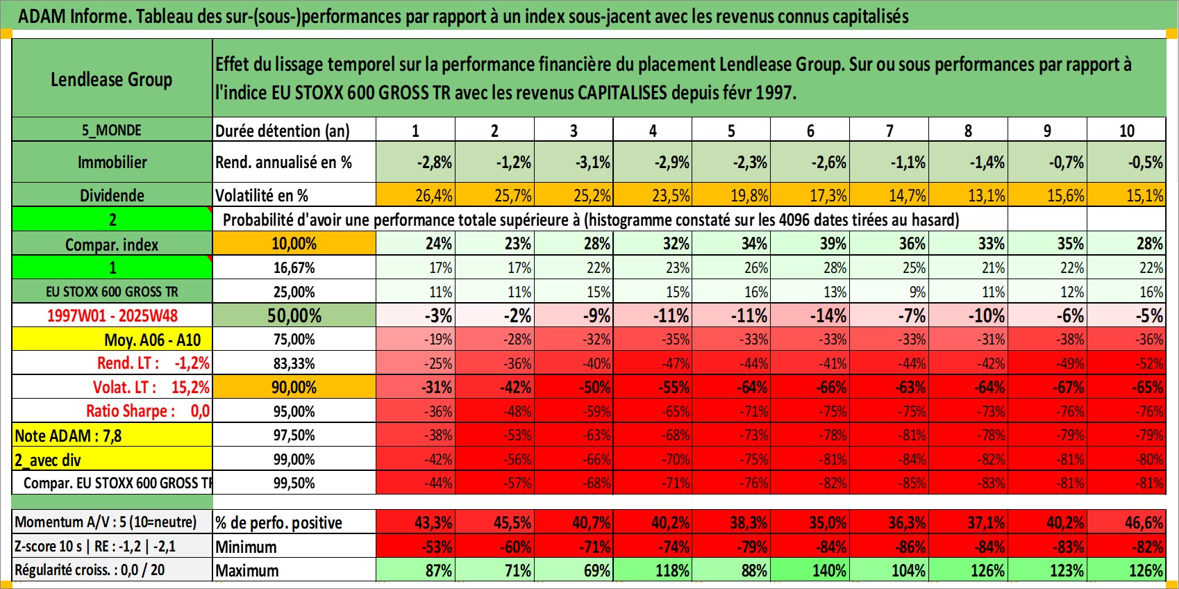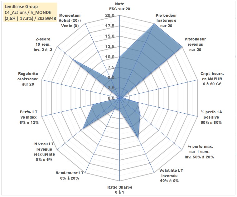 Site dédié aux investisseursPage dédiée sur site financeAnalyse des valorisations hebdomadaires de l'action Lendlease Group. Cet actif est cote en AUD. Les valorisations sont en contrevaleur EURO et couvrent les semaines 1997W01 a 2025W48. Les revenus de cet actif financier sont pris en compte depuis la semaine 1997W09. La note globale ESG de cet actif est estimee a 10.0 (apres rebasage entre 0 et 20).