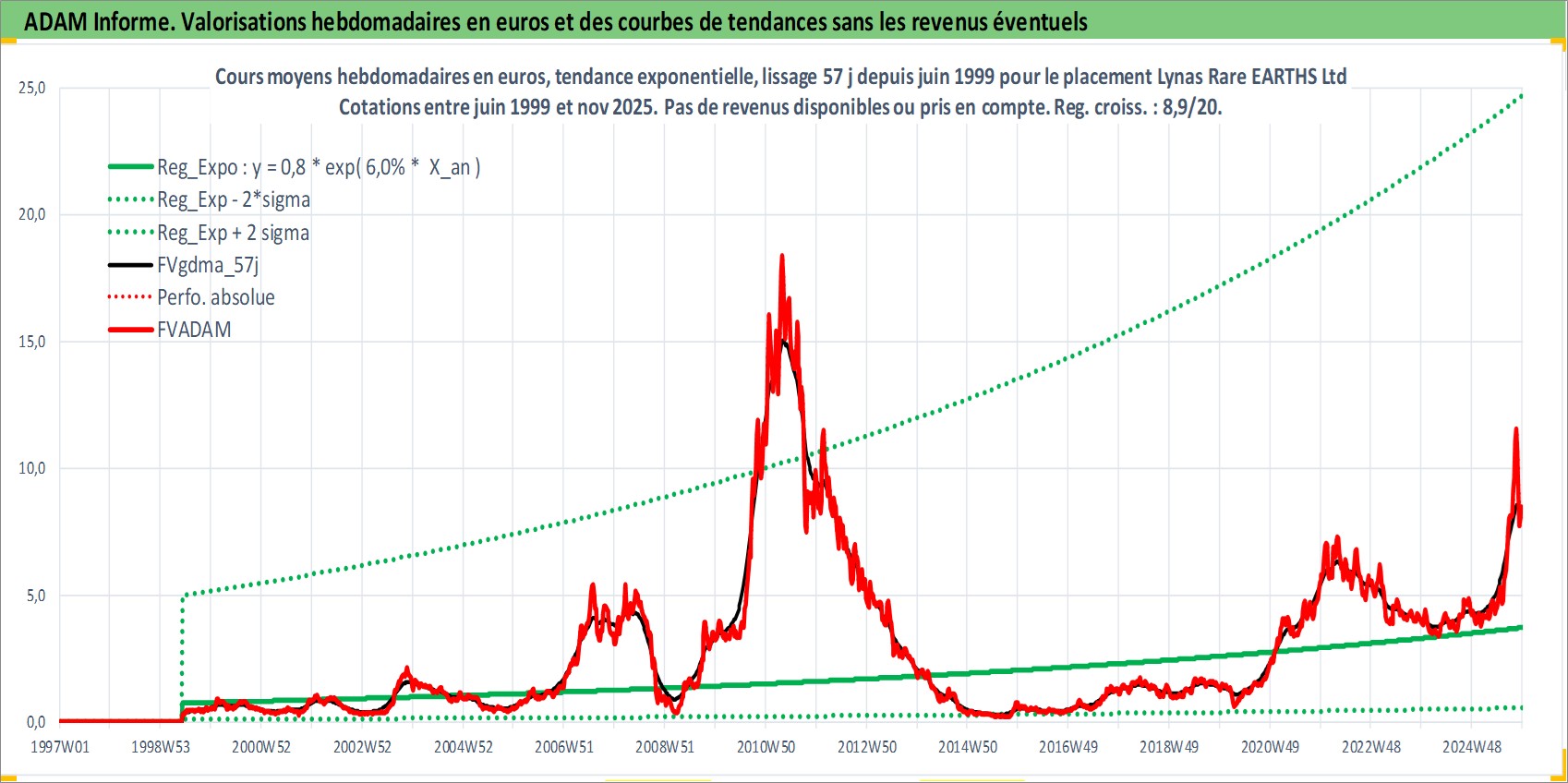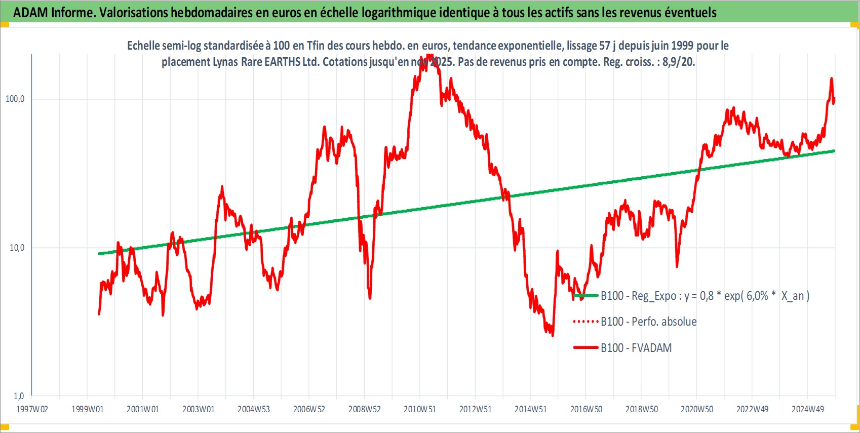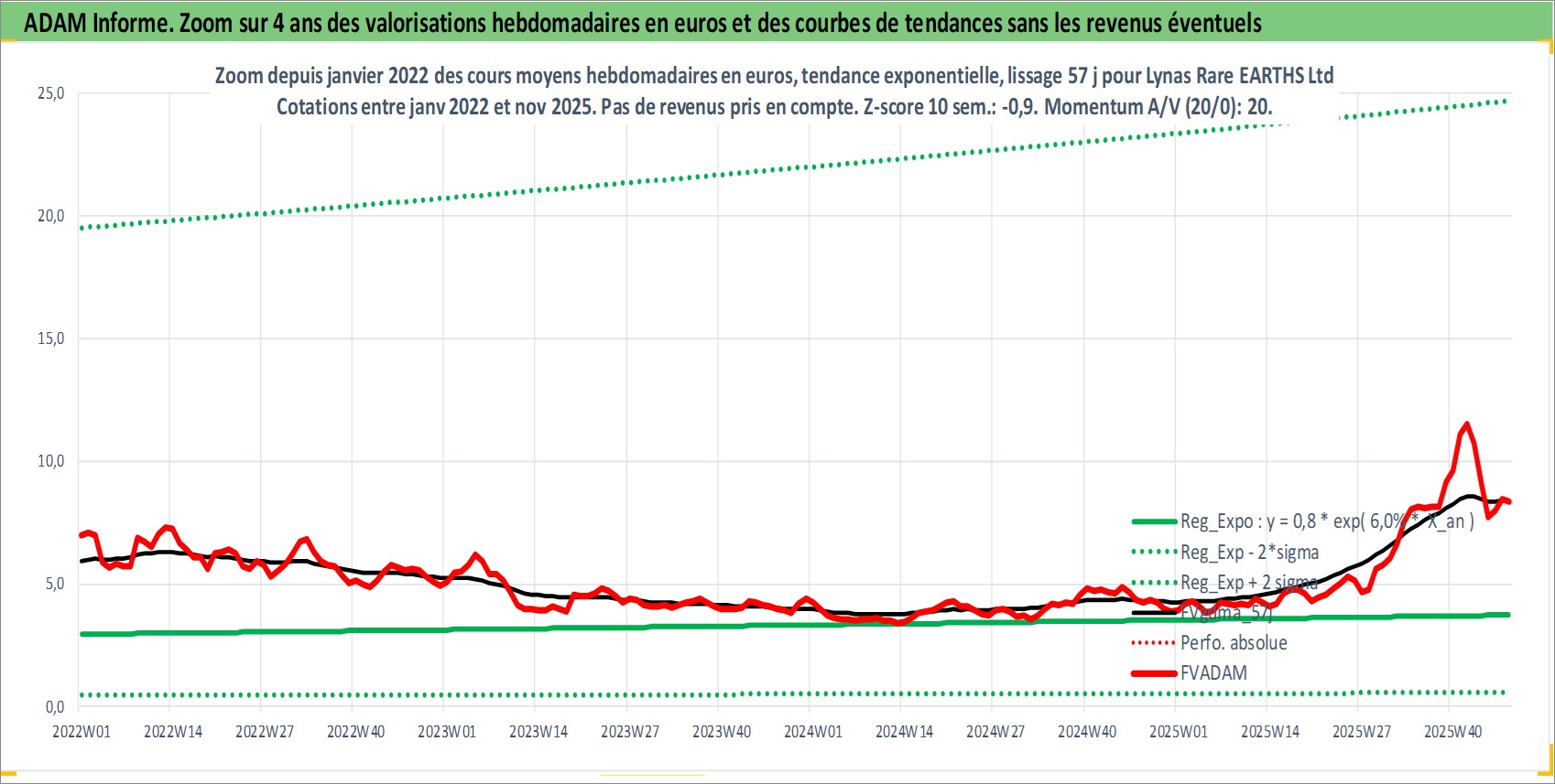 Site dédié aux investisseursPage dédiée sur site financeAnalyse des valorisations hebdomadaires de l'action Lynas Rare EARTHS Ltd. Cet actif est cote en AUD. Les valorisations sont en contrevaleur EURO et couvrent les semaines 1999W23 a 2025W48. Les revenus de cet actif financier ne sont pas connus car non existants ou non disponibles sur le site Yahoo Finance. La note ESG de cet actif n'est pas connue.