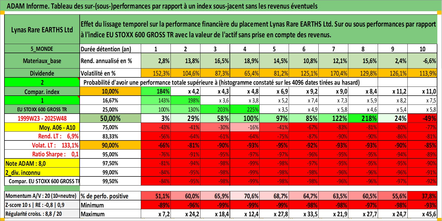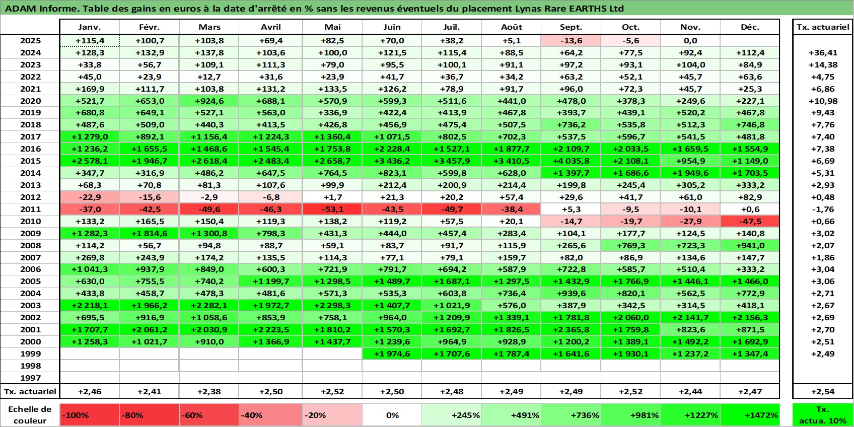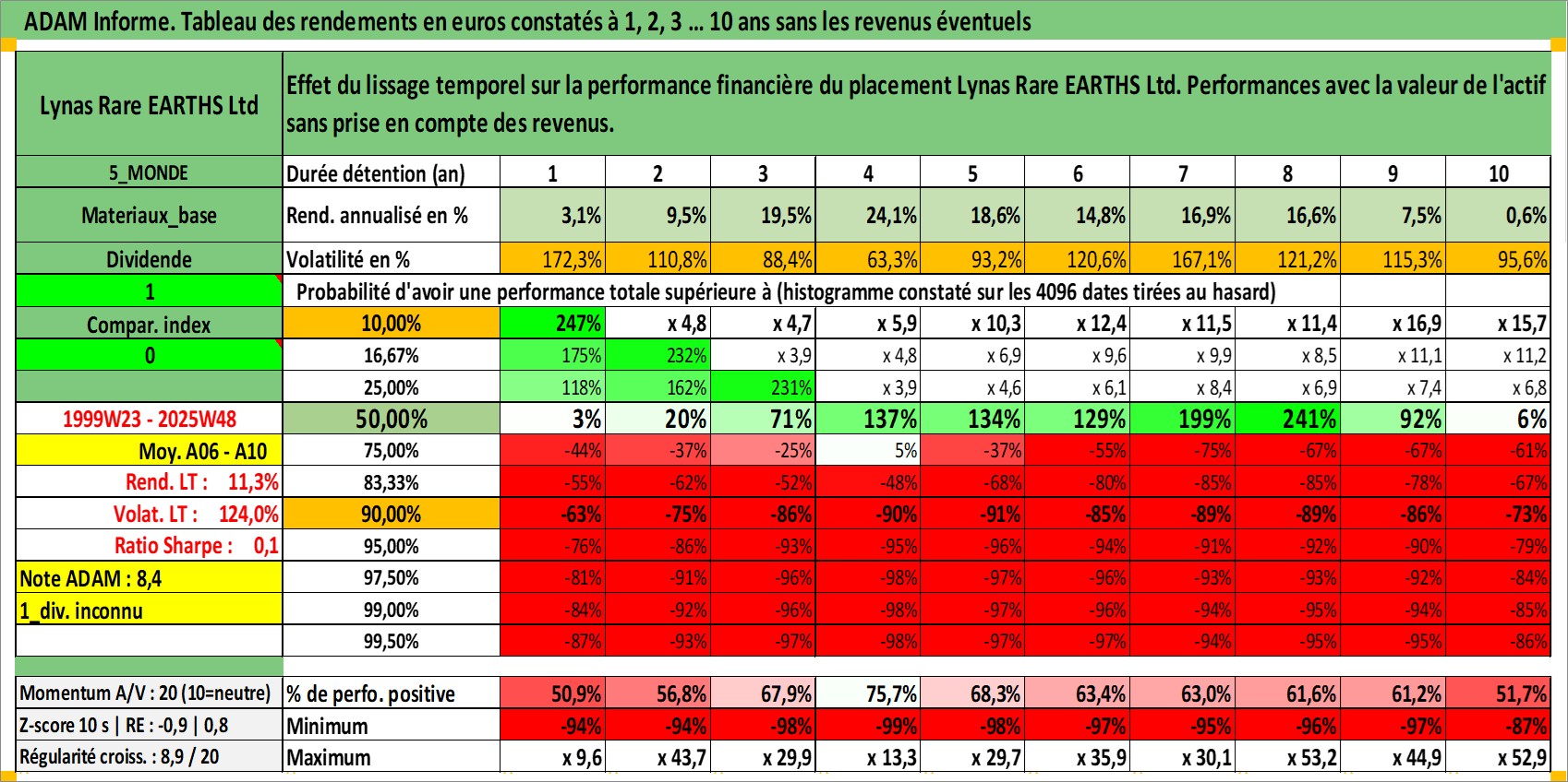 Site dédié aux investisseursPage dédiée sur site financeAnalyse des valorisations hebdomadaires de l'action Lynas Rare EARTHS Ltd. Cet actif est cote en AUD. Les valorisations sont en contrevaleur EURO et couvrent les semaines 1999W23 a 2025W48. Les revenus de cet actif financier ne sont pas connus car non existants ou non disponibles sur le site Yahoo Finance. La note ESG de cet actif n'est pas connue.