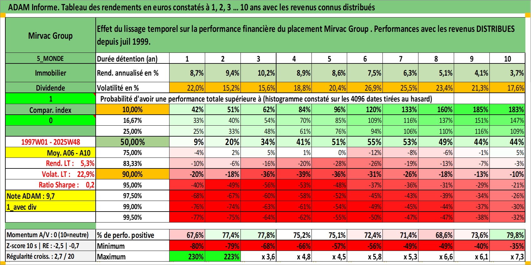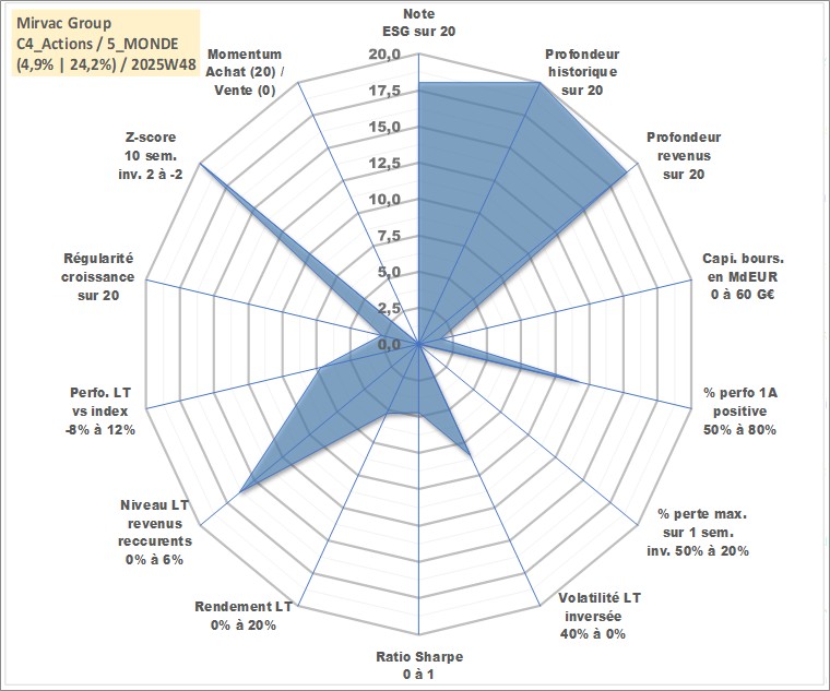 Site dédié aux investisseursPage dédiée sur site financeAnalyse des valorisations hebdomadaires de l'action Mirvac Group . Cet actif est cote en AUD. Les valorisations sont en contrevaleur EURO et couvrent les semaines 1997W01 a 2025W48. Les revenus de cet actif financier sont pris en compte depuis la semaine 1999W26. La note globale ESG de cet actif est estimee a 18.0 (apres rebasage entre 0 et 20).