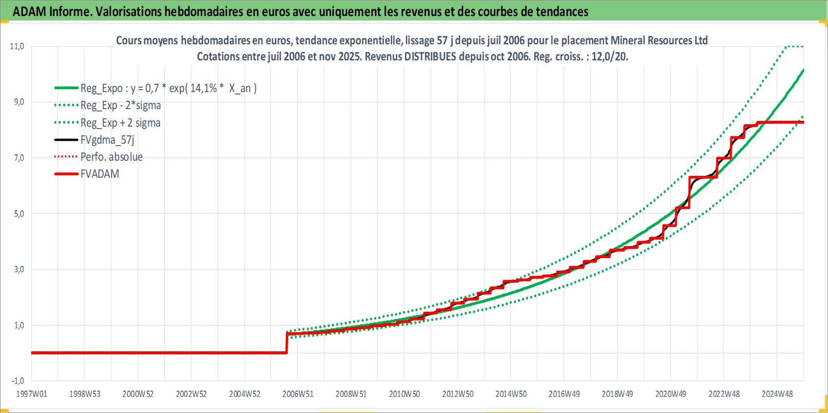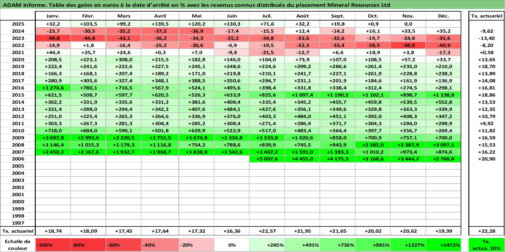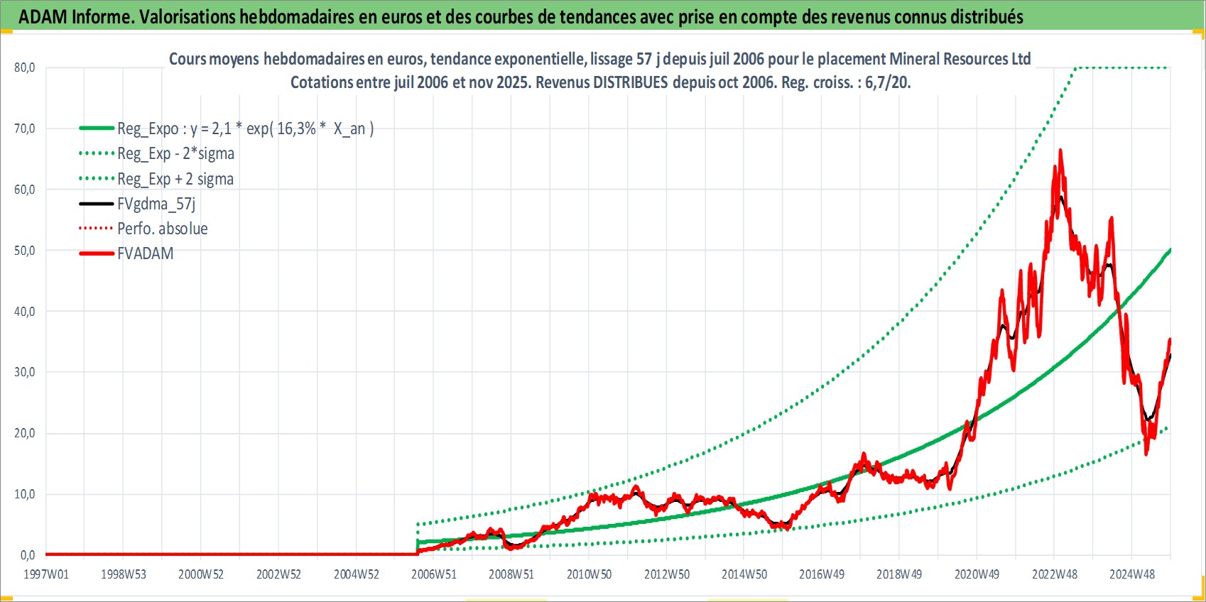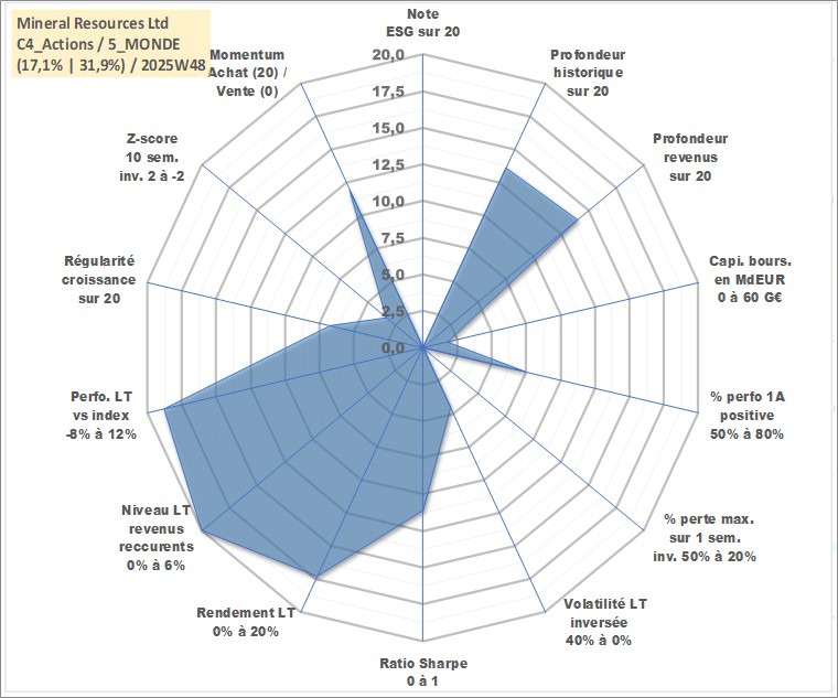 Site dédié aux investisseursPage dédiée sur site financeAnalyse des valorisations hebdomadaires de l'action Mineral Resources Ltd. Cet actif est cote en AUD. Les valorisations sont en contrevaleur EURO et couvrent les semaines 2006W30 a 2025W48. Les revenus de cet actif financier sont pris en compte depuis la semaine 2006W41. La note ESG de cet actif n'est pas connue.