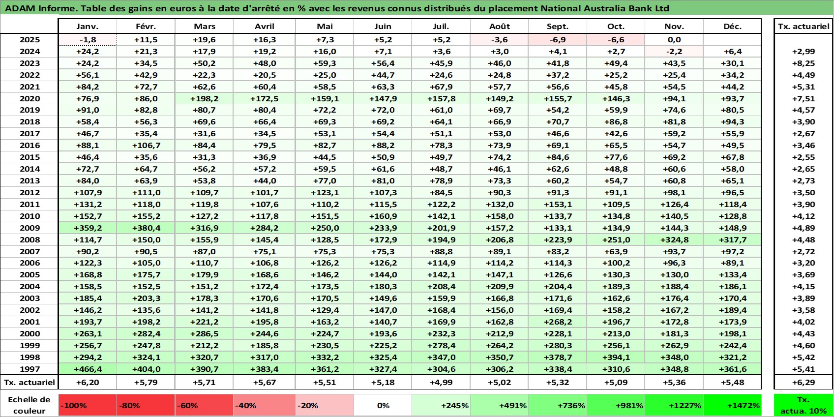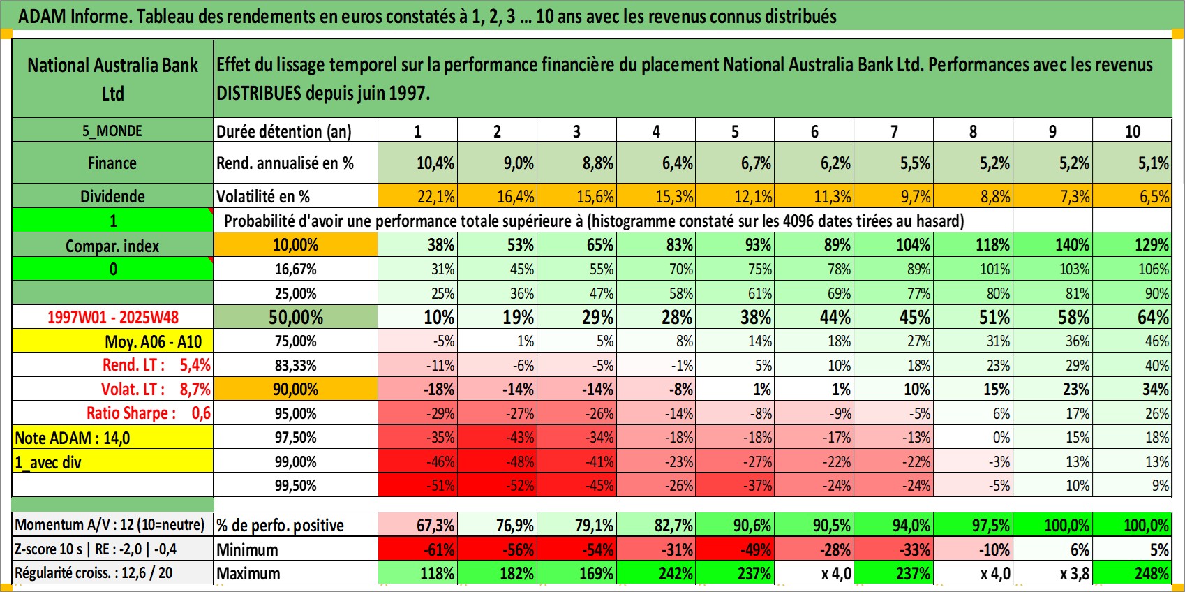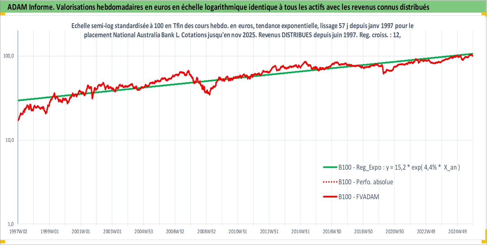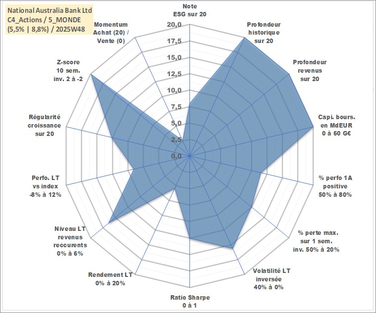 Site dédié aux investisseursPage dédiée sur site financeAnalyse des valorisations hebdomadaires de l'action National Australia Bank Ltd. Cet actif est cote en AUD. Les valorisations sont en contrevaleur EURO et couvrent les semaines 1997W01 a 2025W48. Les revenus de cet actif financier sont pris en compte depuis la semaine 1997W27. La note globale ESG de cet actif est estimee a 8.0 (apres rebasage entre 0 et 20).