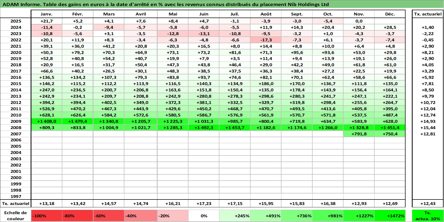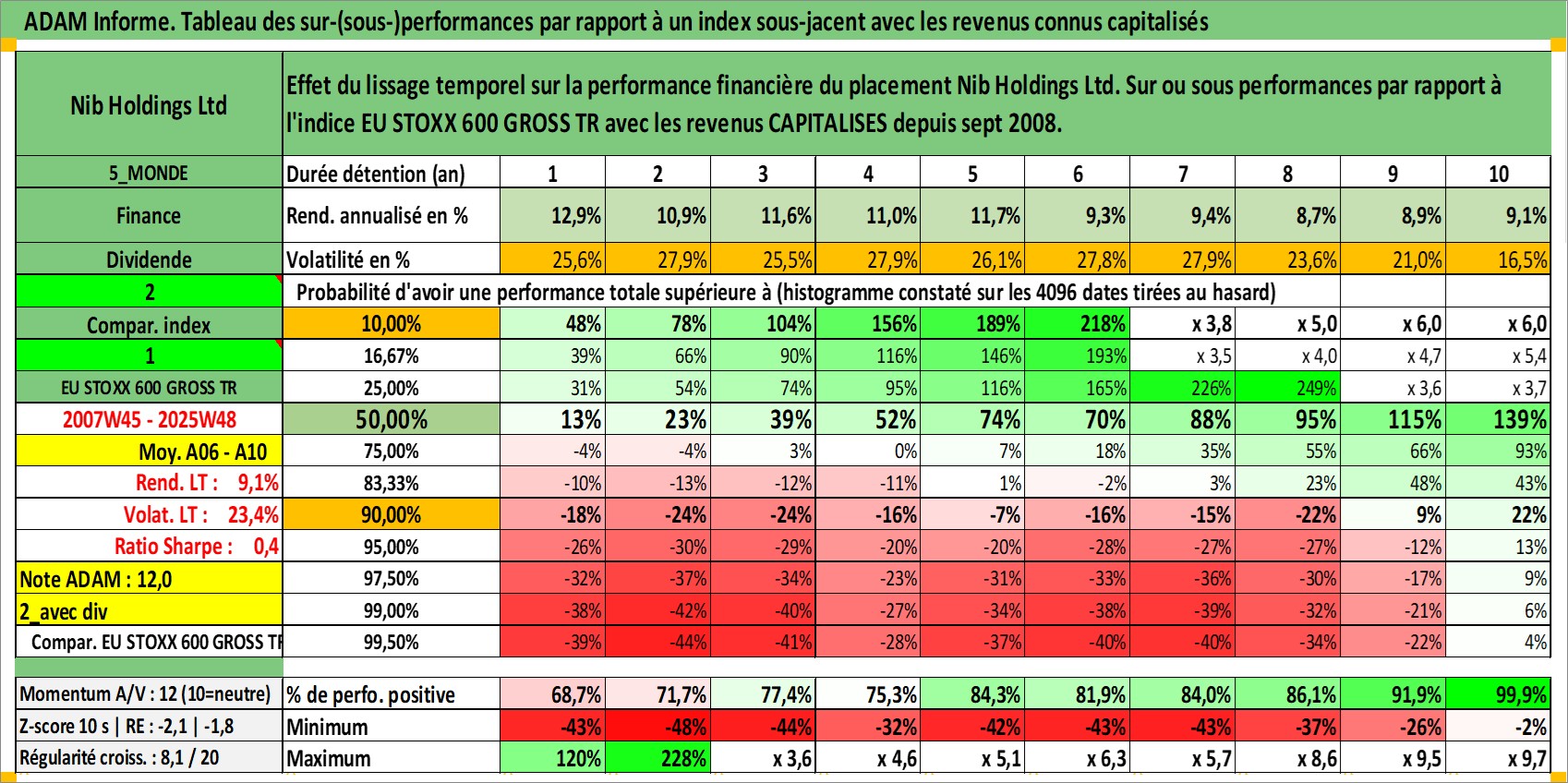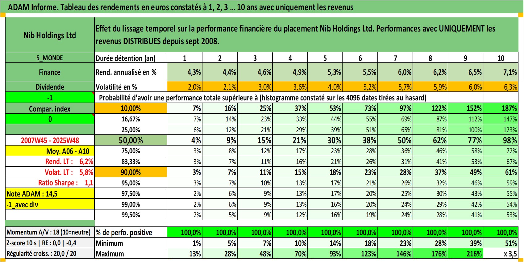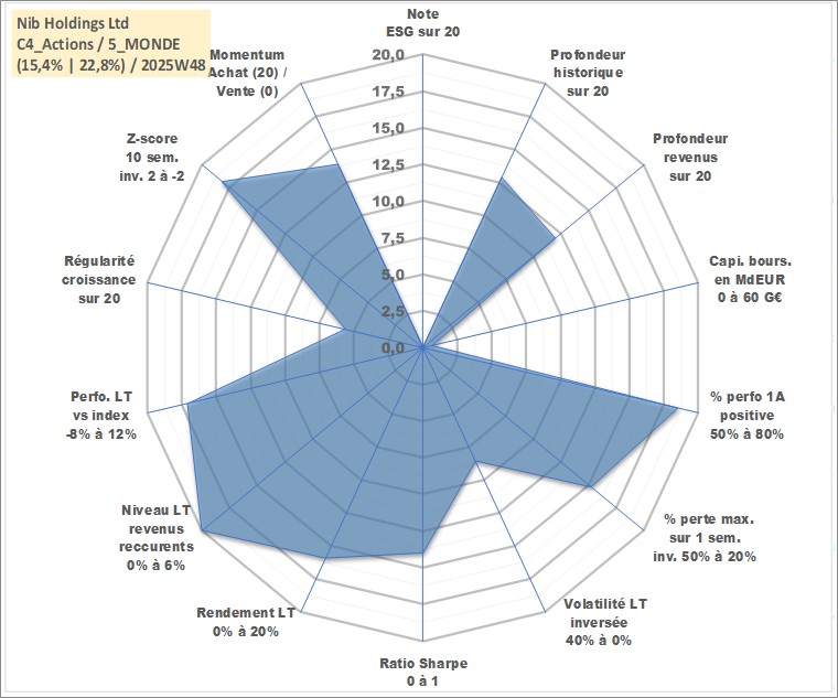 Site dédié aux investisseursPage dédiée sur site financeAnalyse des valorisations hebdomadaires de l'action Nib Holdings Ltd. Cet actif est cote en AUD. Les valorisations sont en contrevaleur EURO et couvrent les semaines 2007W45 a 2025W48. Les revenus de cet actif financier sont pris en compte depuis la semaine 2008W38. La note ESG de cet actif n'est pas connue.