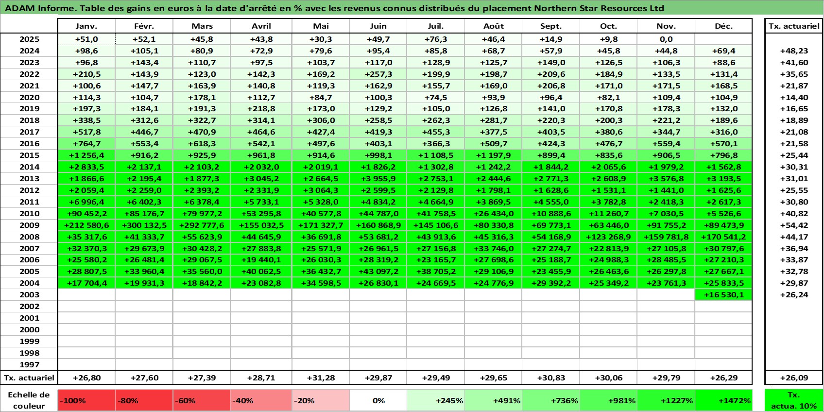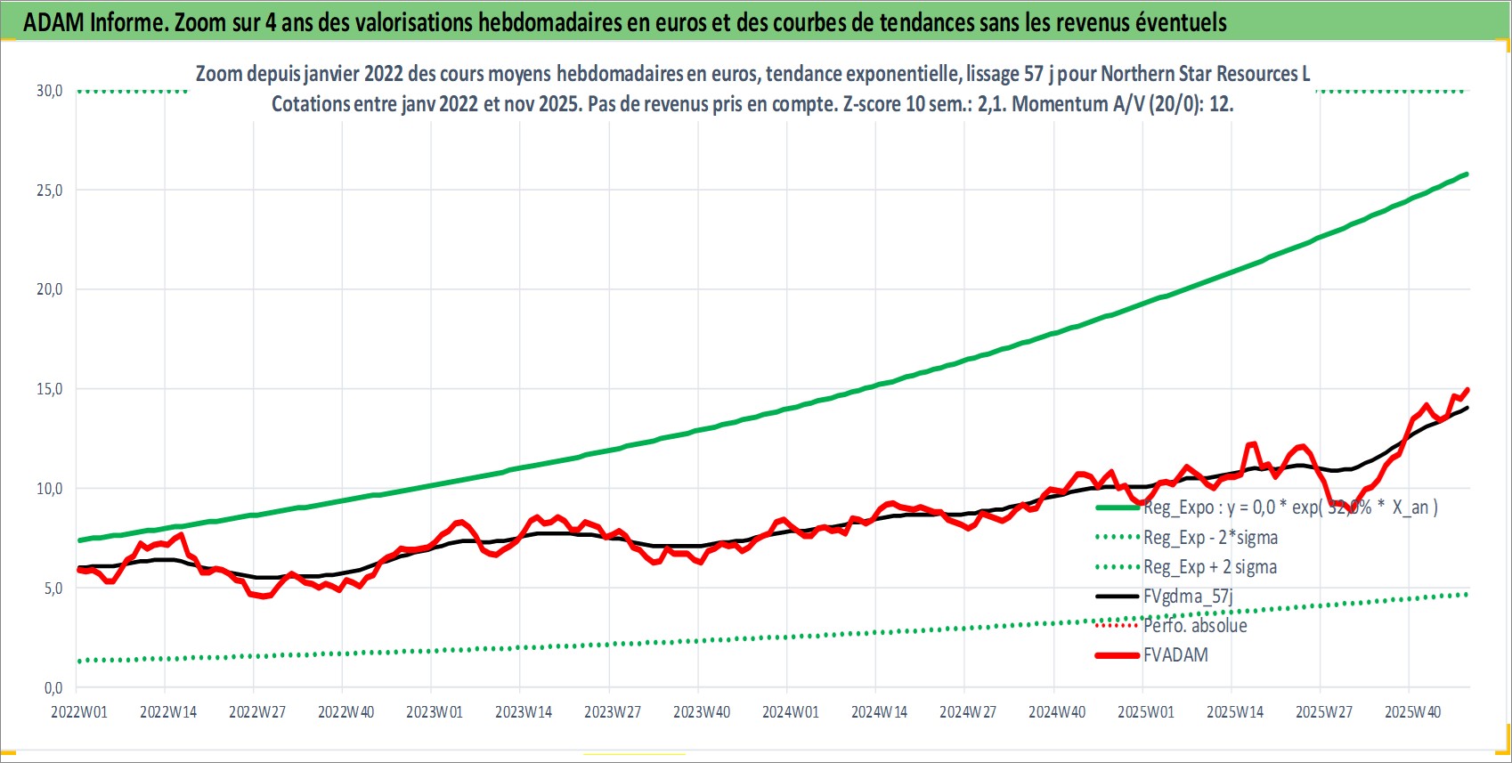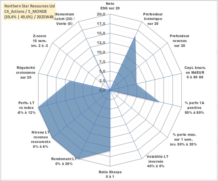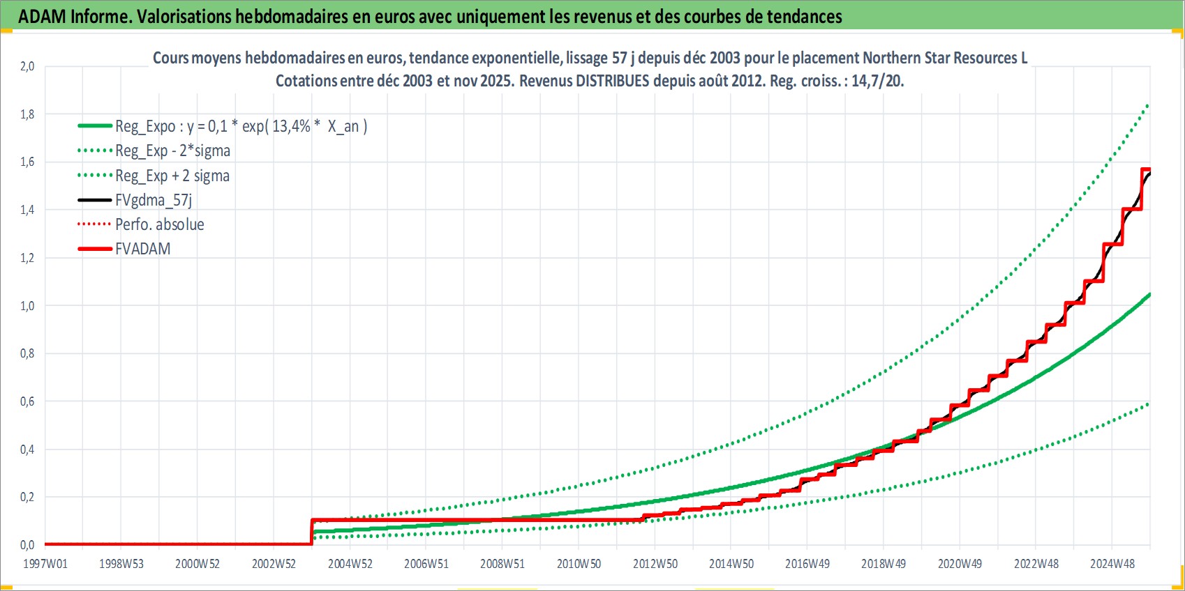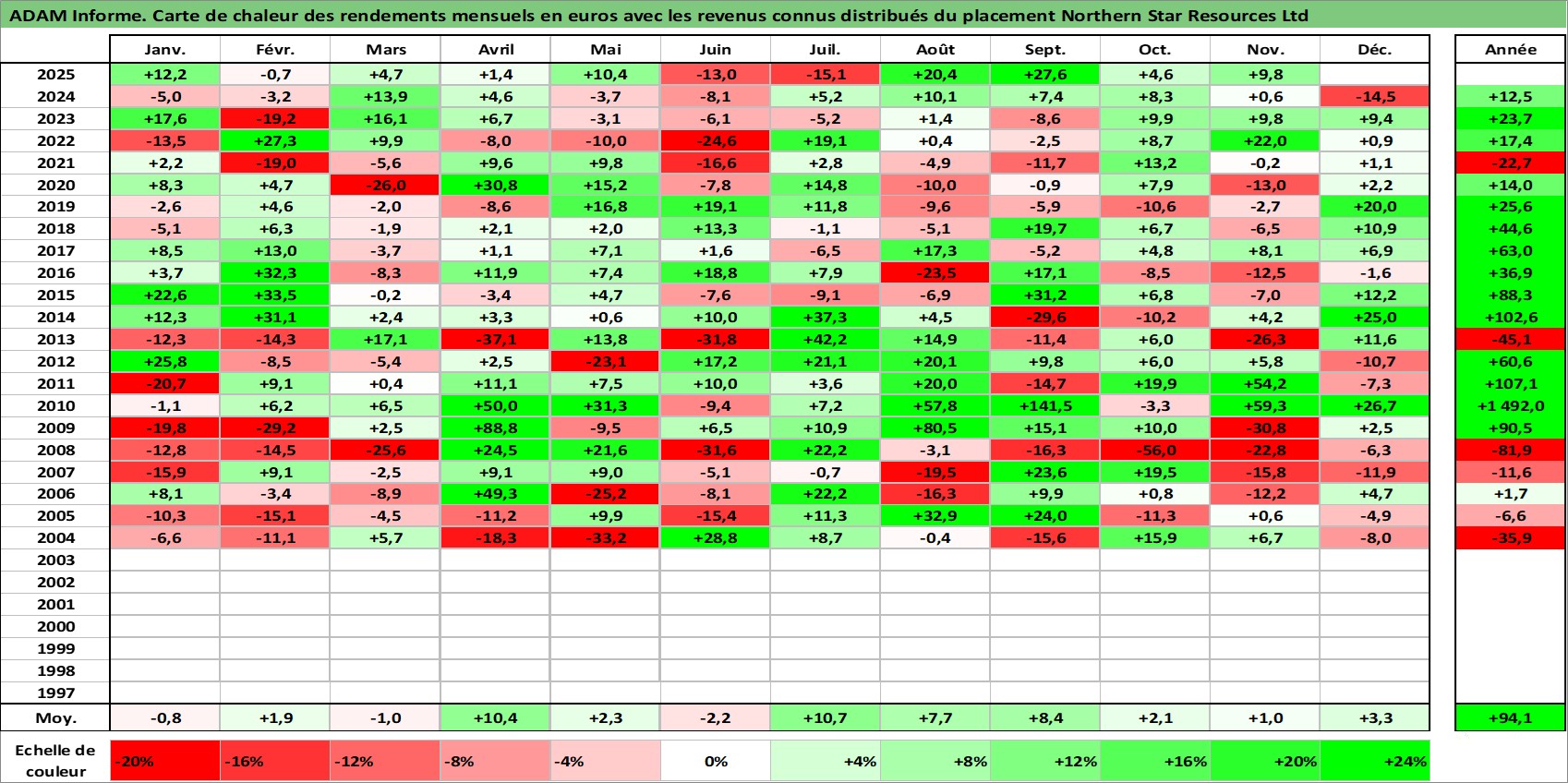 Site dédié aux investisseursPage dédiée sur site financeAnalyse des valorisations hebdomadaires de l'action Northern Star Resources Ltd. Cet actif est cote en AUD. Les valorisations sont en contrevaleur EURO et couvrent les semaines 2003W52 a 2025W48. Les revenus de cet actif financier sont pris en compte depuis la semaine 2012W35. La note ESG de cet actif n'est pas connue.