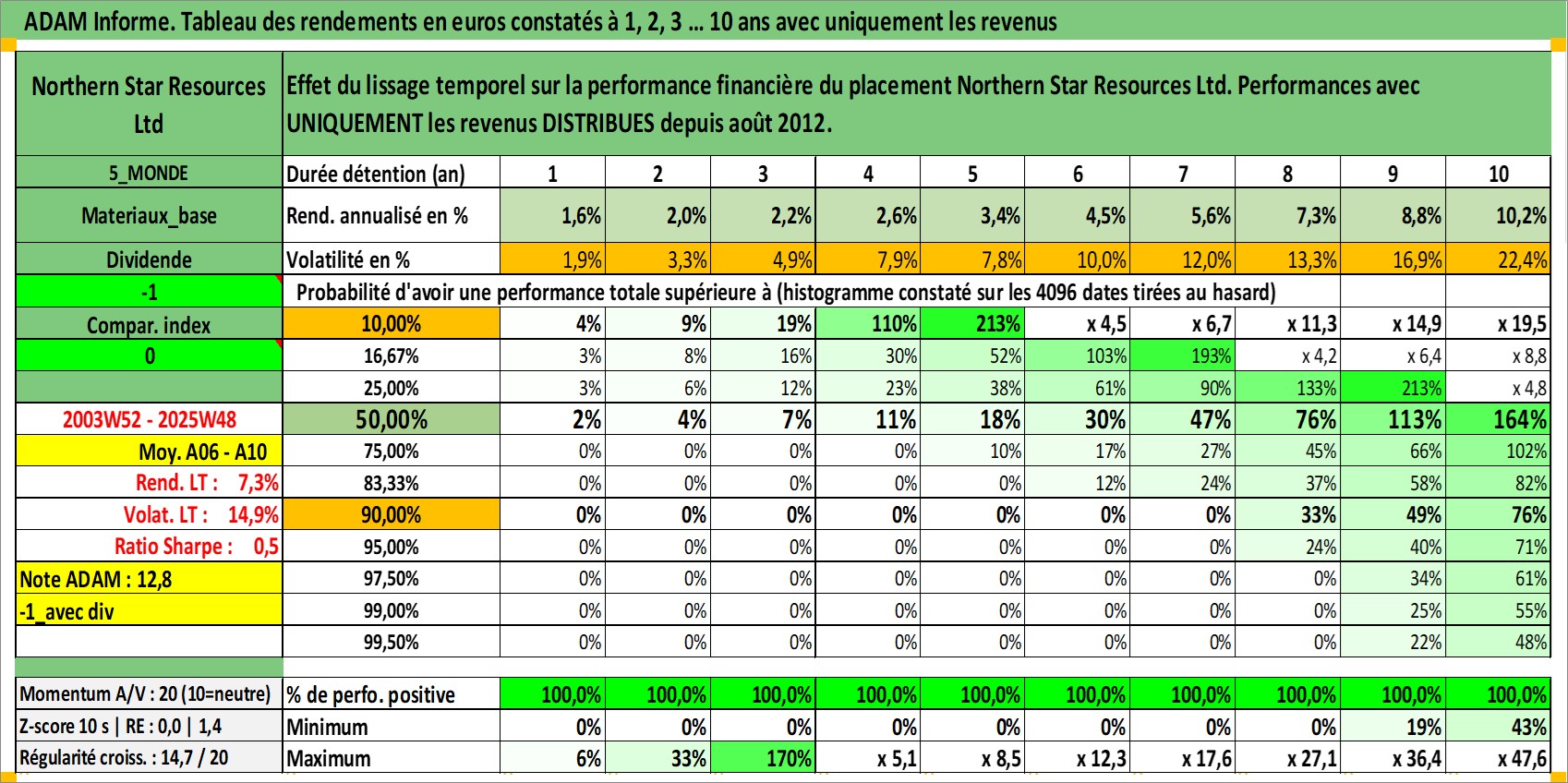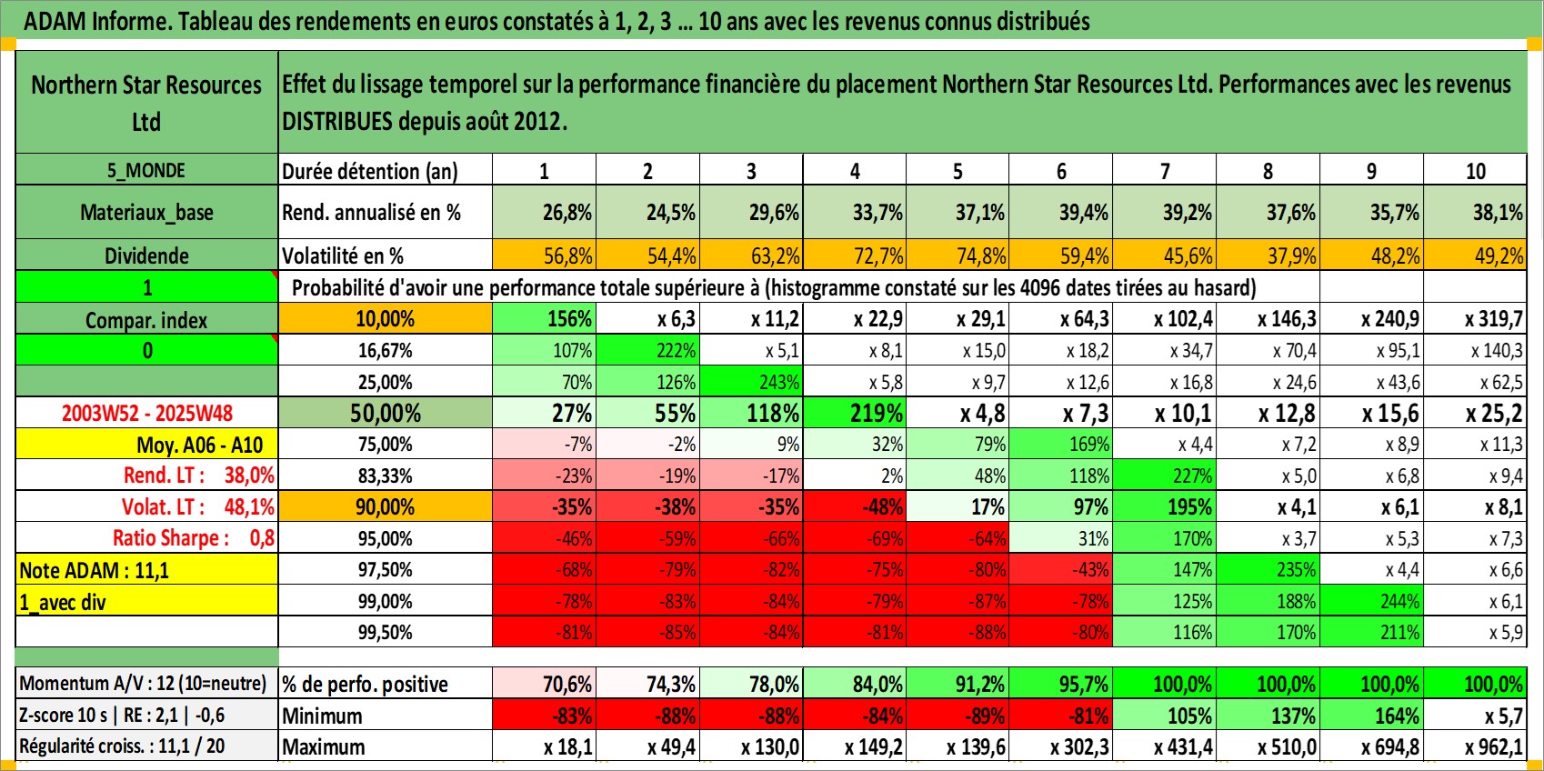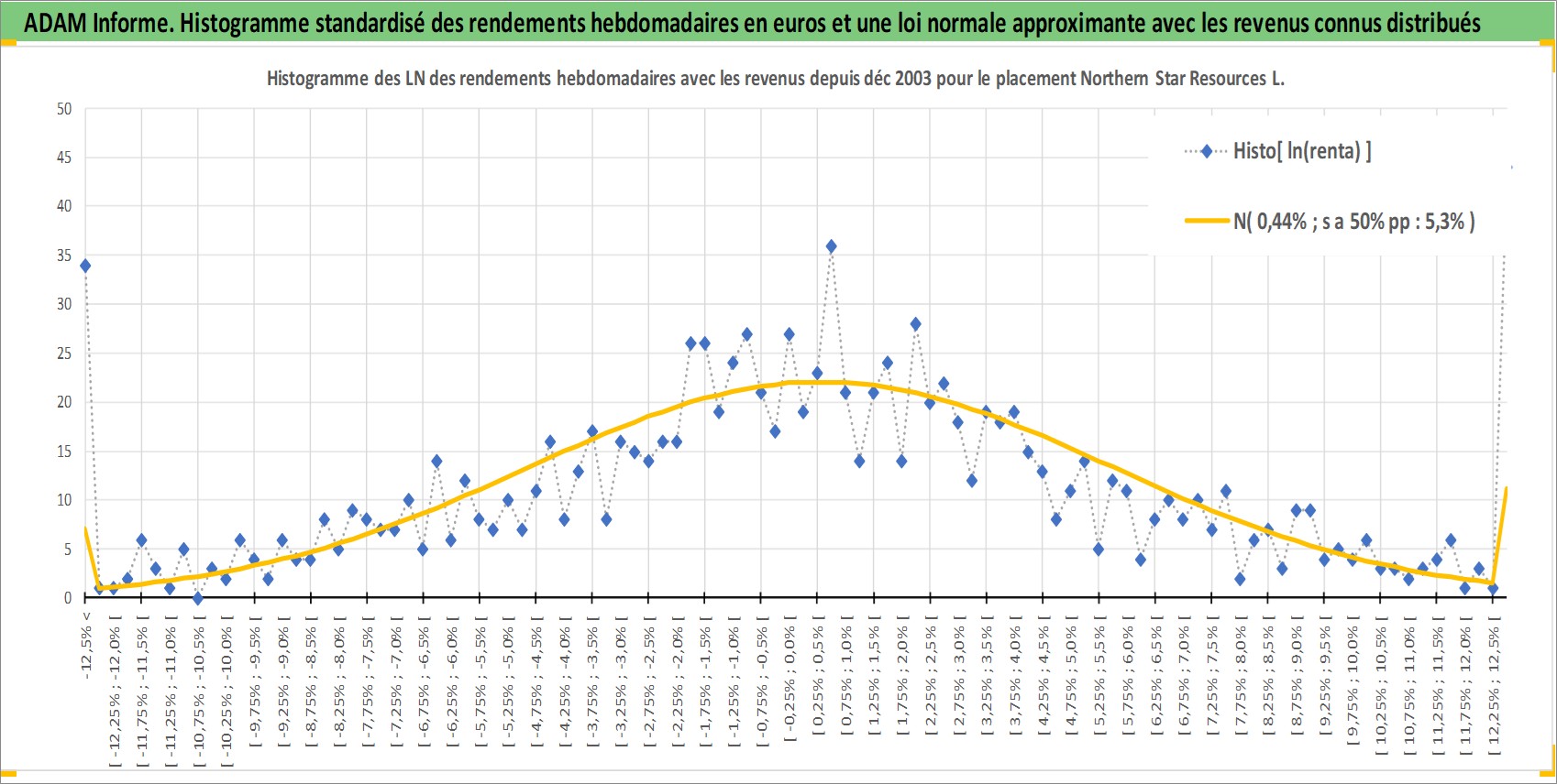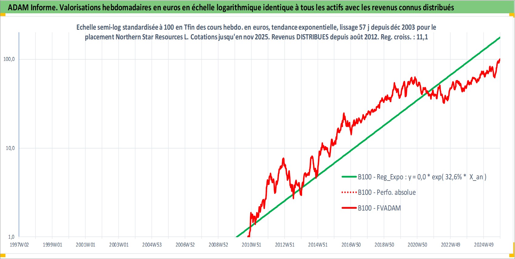 Site dédié aux investisseursPage dédiée sur site financeAnalyse des valorisations hebdomadaires de l'action Northern Star Resources Ltd. Cet actif est cote en AUD. Les valorisations sont en contrevaleur EURO et couvrent les semaines 2003W52 a 2025W48. Les revenus de cet actif financier sont pris en compte depuis la semaine 2012W35. La note ESG de cet actif n'est pas connue.