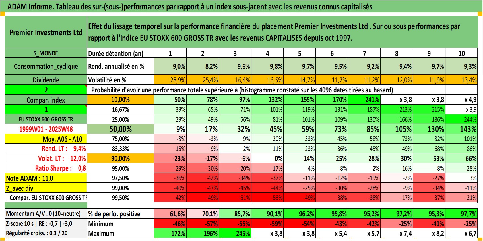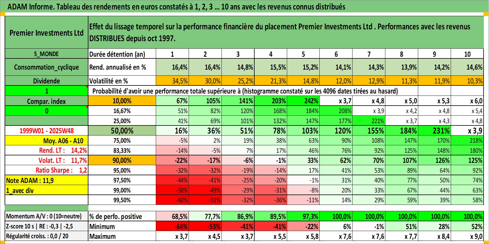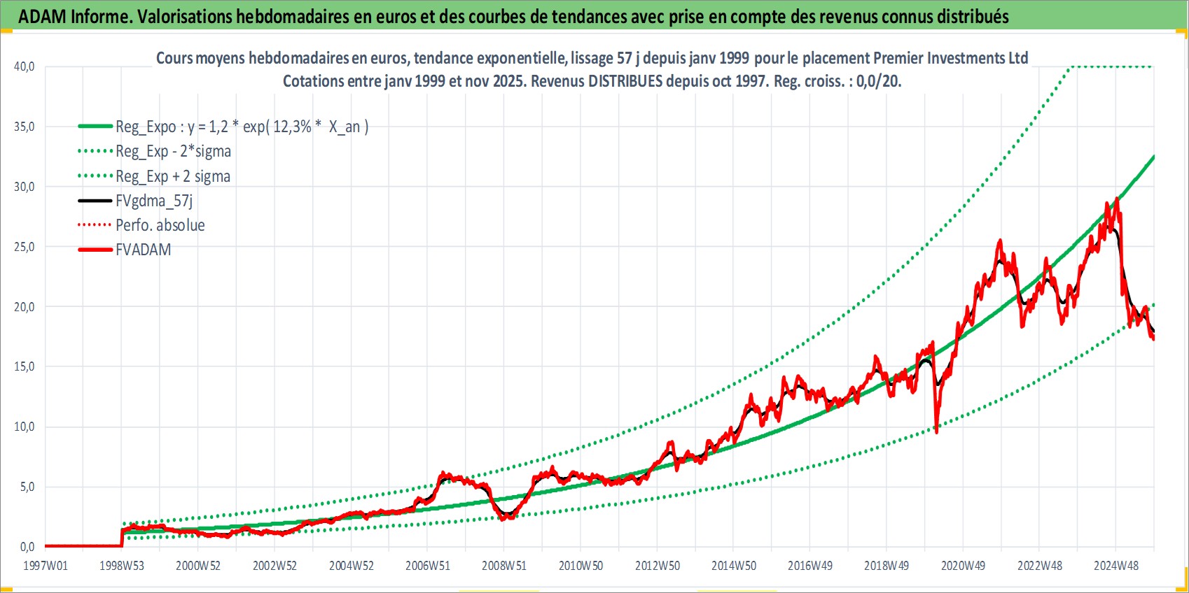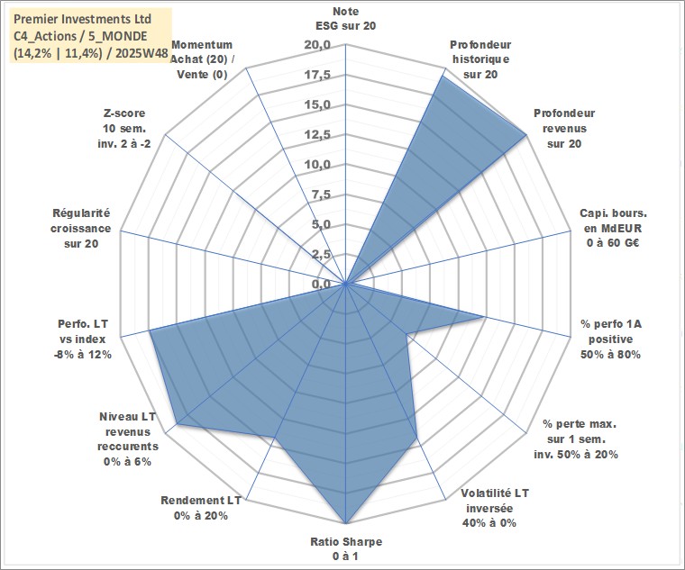 Site dédié aux investisseursPage dédiée sur site financeAnalyse des valorisations hebdomadaires de l'action Premier Investments Ltd . Cet actif est cote en AUD. Les valorisations sont en contrevaleur EURO et couvrent les semaines 1999W01 a 2025W48. Les revenus de cet actif financier sont pris en compte depuis la semaine 1997W44. La note ESG de cet actif n'est pas connue.
