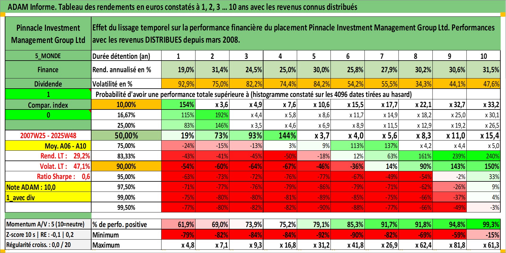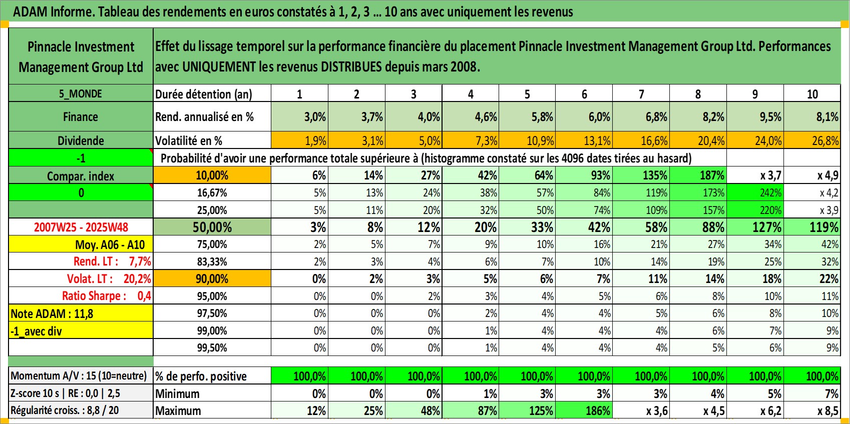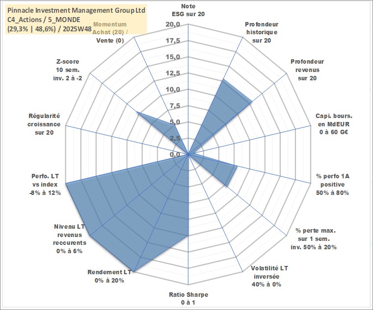 Site dédié aux investisseursPage dédiée sur site financeAnalyse des valorisations hebdomadaires de l'action Pinnacle Investment Management Group Ltd. Cet actif est cote en AUD. Les valorisations sont en contrevaleur EURO et couvrent les semaines 2007W25 a 2025W48. Les revenus de cet actif financier sont pris en compte depuis la semaine 2008W10. La note ESG de cet actif n'est pas connue.