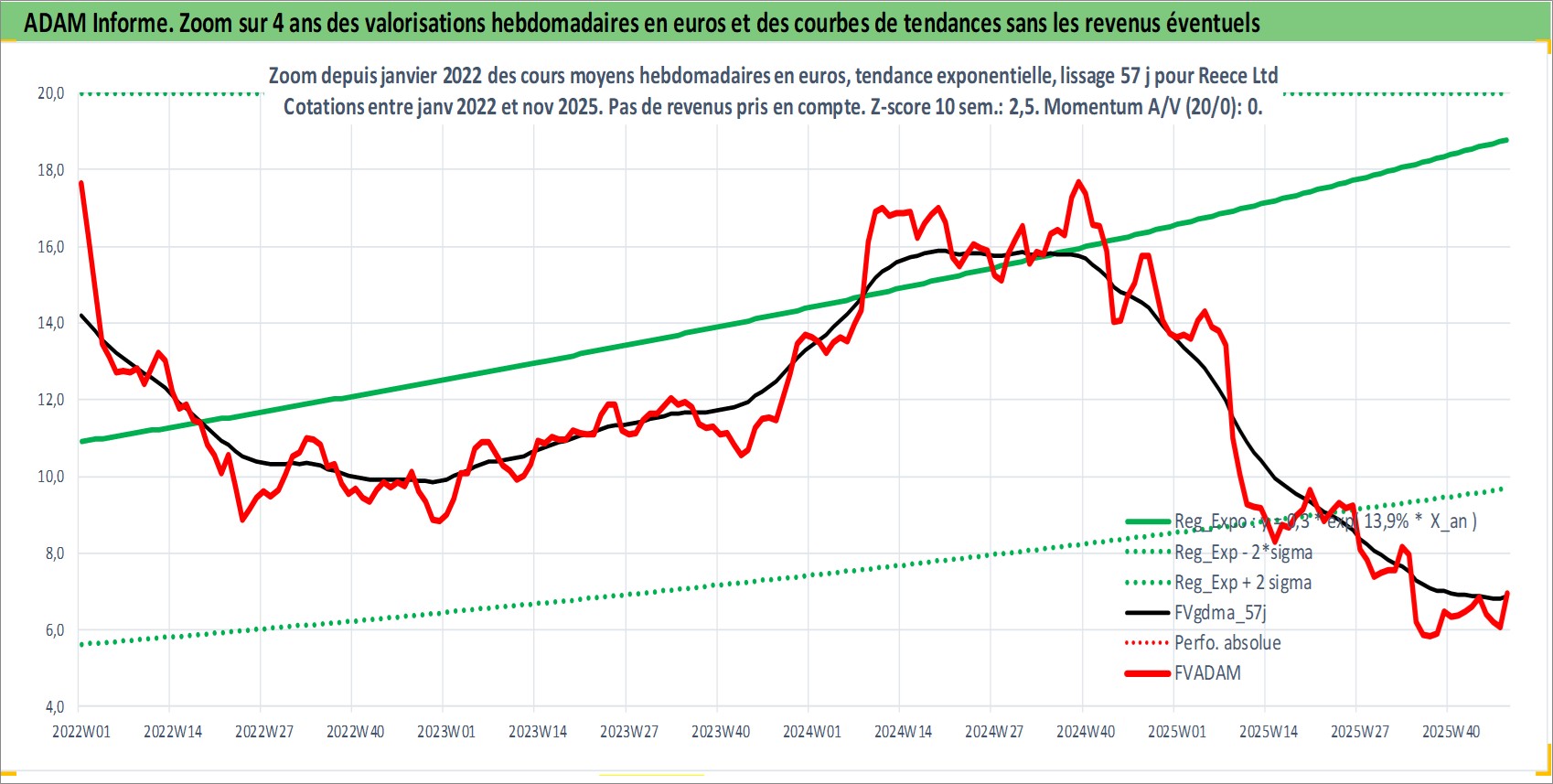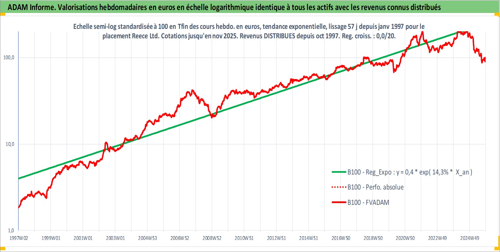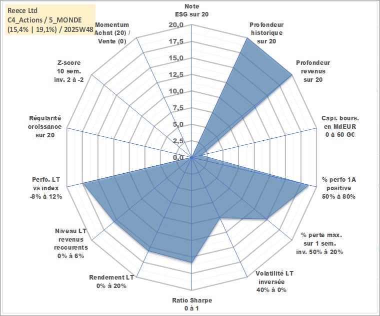 Site dédié aux investisseursPage dédiée sur site financeAnalyse des valorisations hebdomadaires de l'action Reece Ltd. Cet actif est cote en AUD. Les valorisations sont en contrevaleur EURO et couvrent les semaines 1997W01 a 2025W48. Les revenus de cet actif financier sont pris en compte depuis la semaine 1997W43. La note ESG de cet actif n'est pas connue.