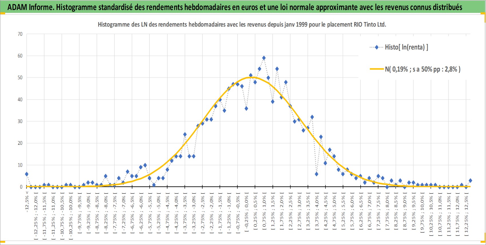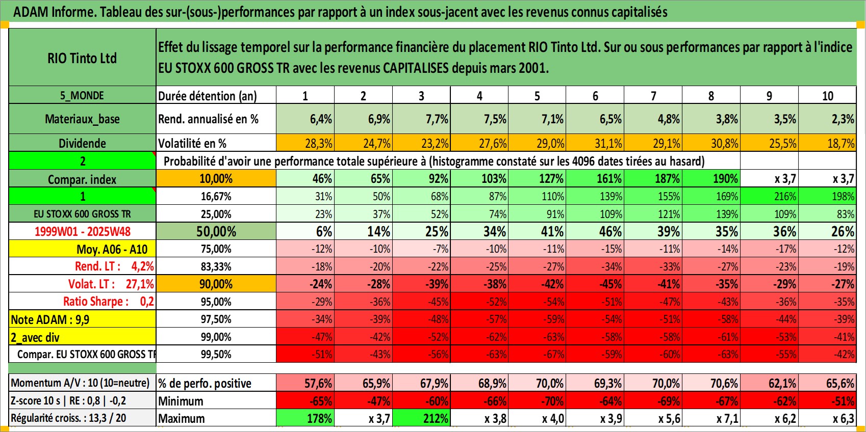 Site dédié aux investisseursPage dédiée sur site financeAnalyse des valorisations hebdomadaires de l'action RIO Tinto Ltd. Cet actif est cote en AUD. Les valorisations sont en contrevaleur EURO et couvrent les semaines 1999W01 a 2025W48. Les revenus de cet actif financier sont pris en compte depuis la semaine 2001W09. La note globale ESG de cet actif est estimee a 4.0 (apres rebasage entre 0 et 20).