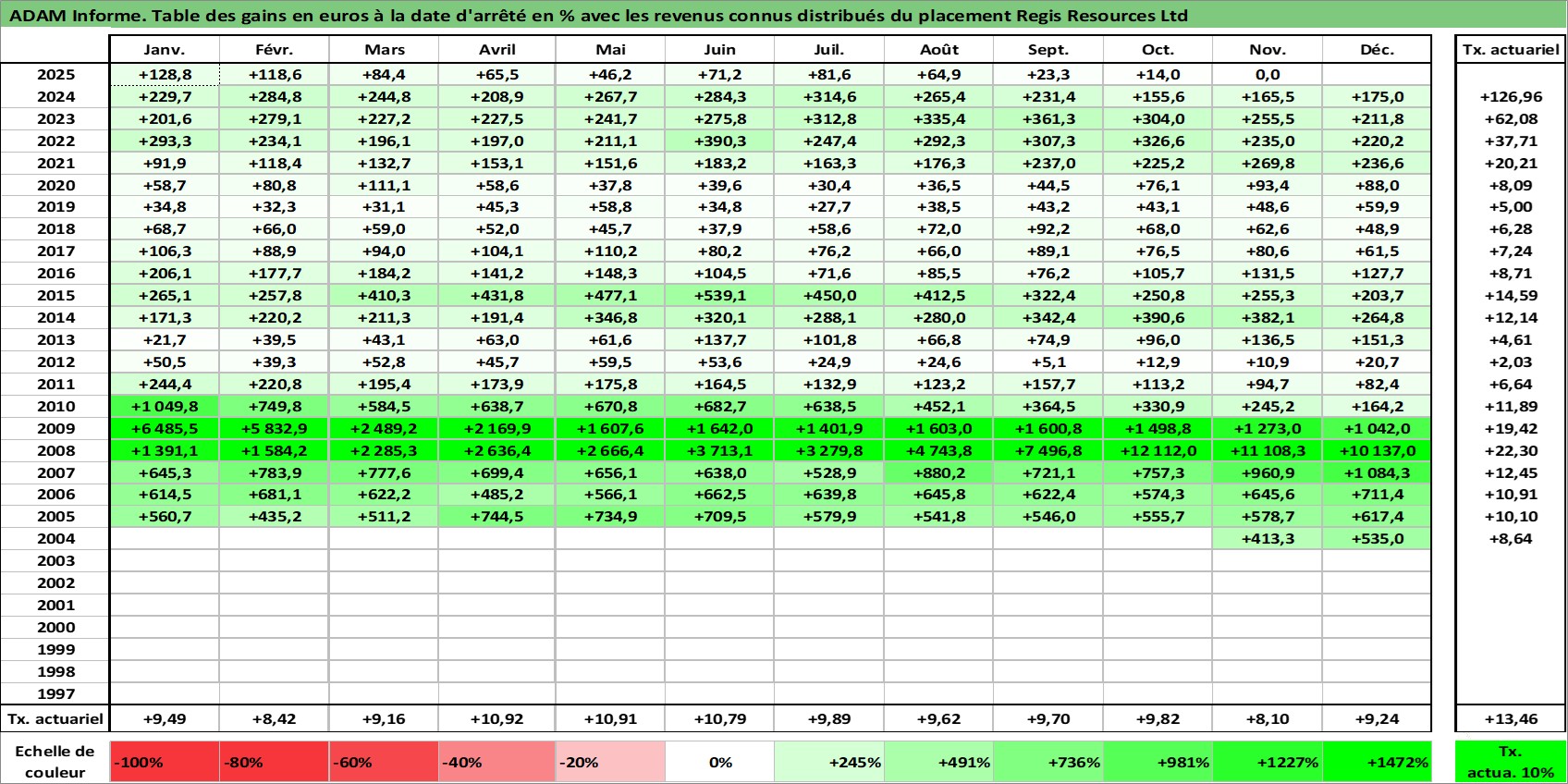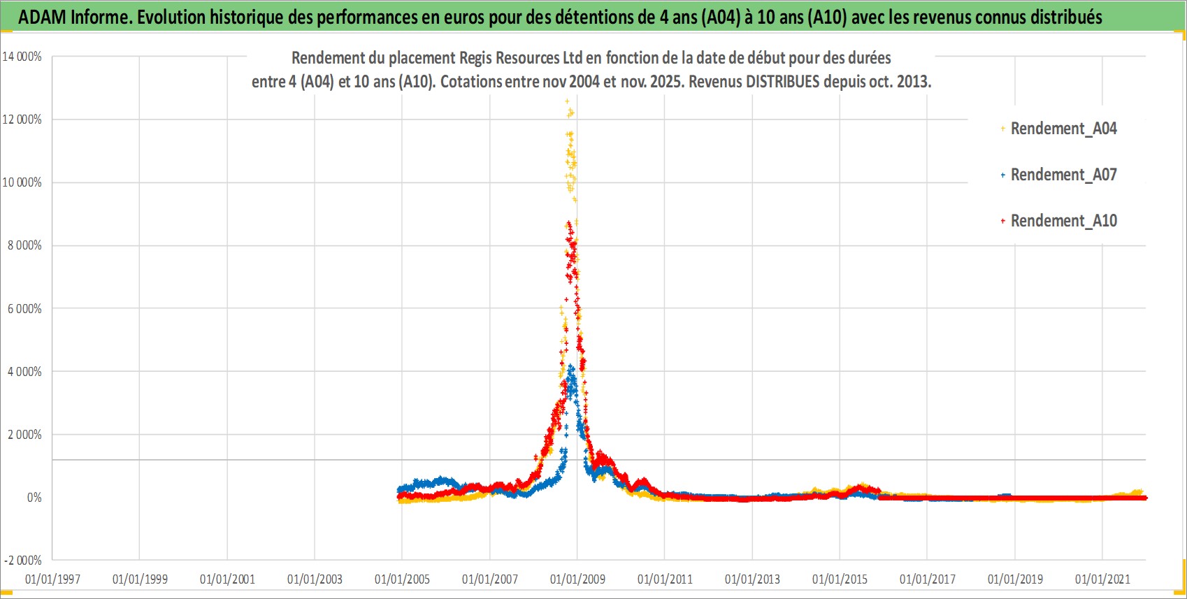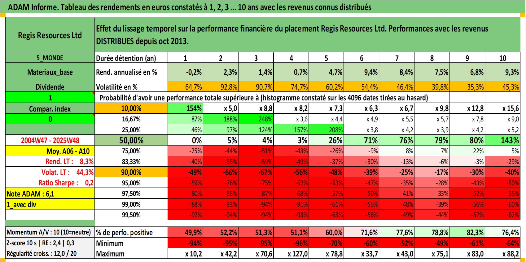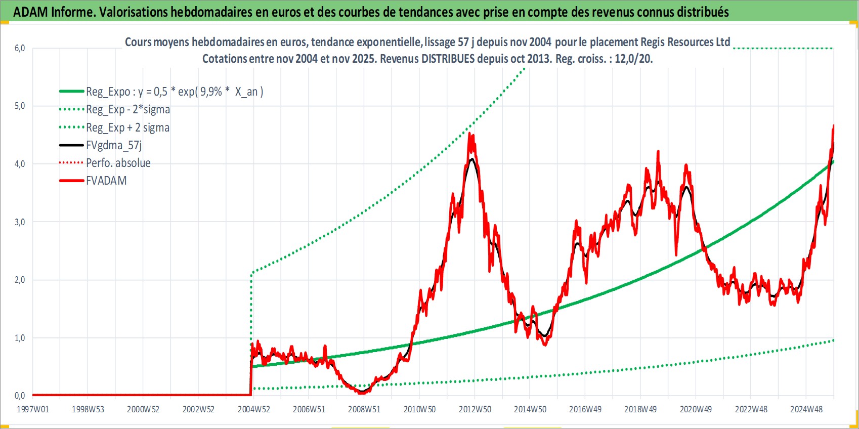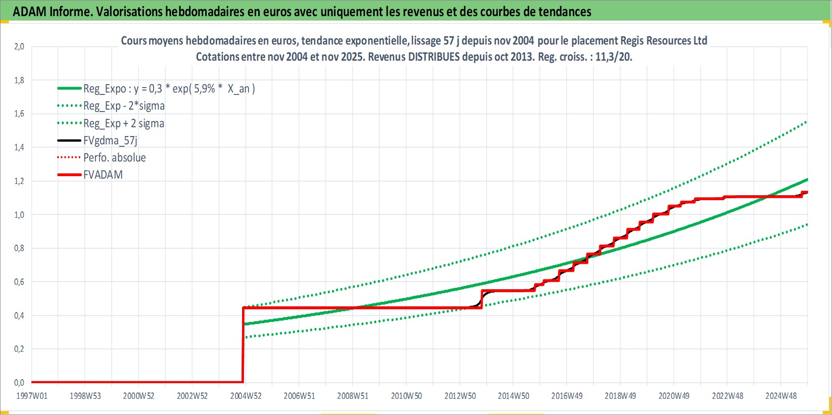 Site dédié aux investisseursPage dédiée sur site financeAnalyse des valorisations hebdomadaires de l'action Regis Resources Ltd. Cet actif est cote en AUD. Les valorisations sont en contrevaleur EURO et couvrent les semaines 2004W47 a 2025W48. Les revenus de cet actif financier sont pris en compte depuis la semaine 2013W41. La note ESG de cet actif n'est pas connue.