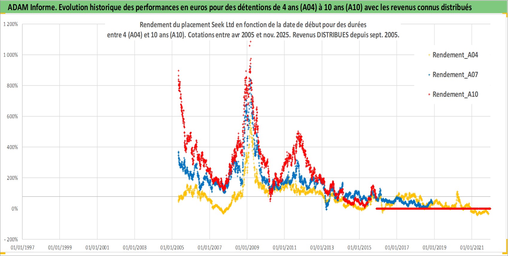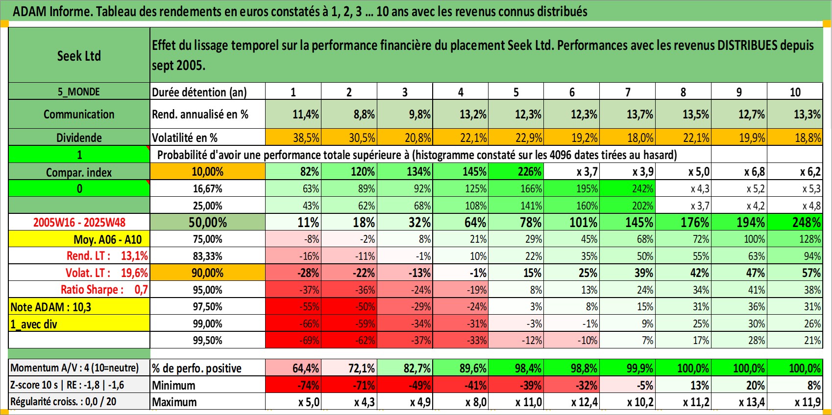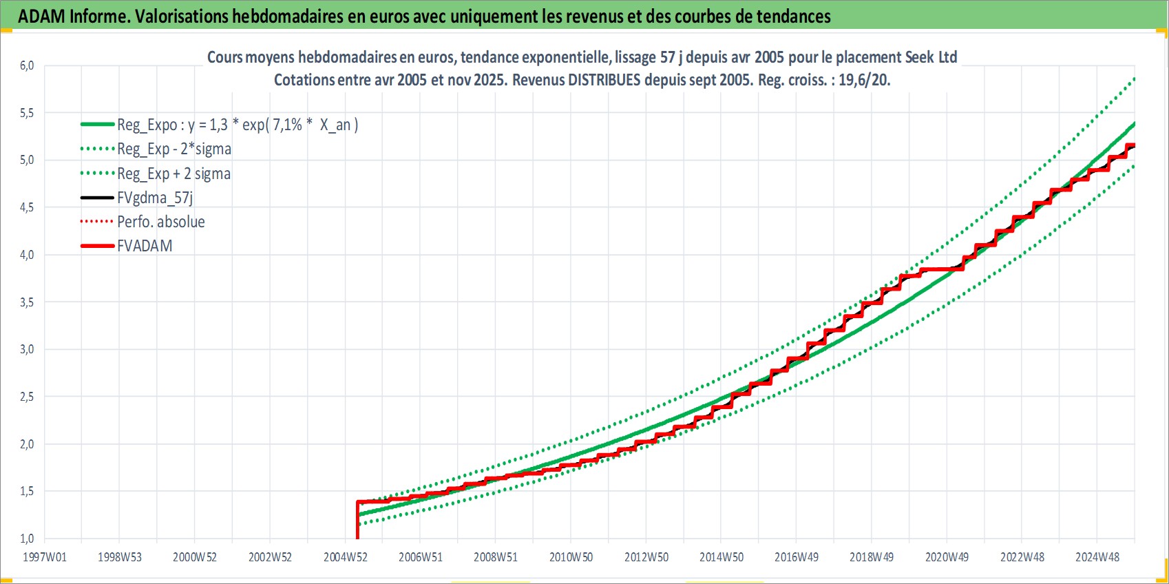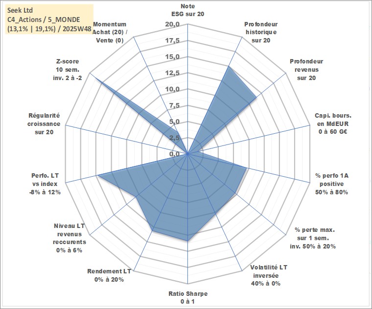 Site dédié aux investisseursPage dédiée sur site financeAnalyse des valorisations hebdomadaires de l'action Seek Ltd. Cet actif est cote en AUD. Les valorisations sont en contrevaleur EURO et couvrent les semaines 2005W16 a 2025W48. Les revenus de cet actif financier sont pris en compte depuis la semaine 2005W37. La note ESG de cet actif n'est pas connue.