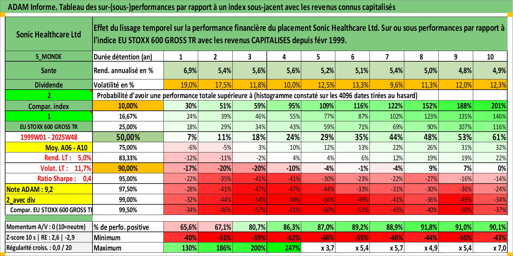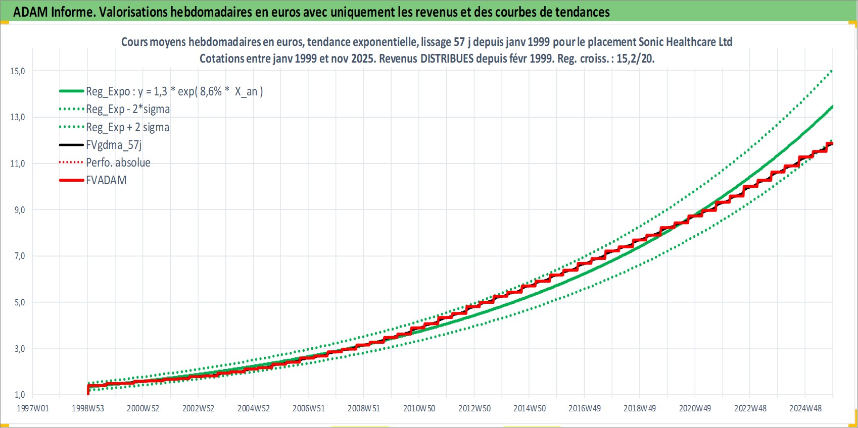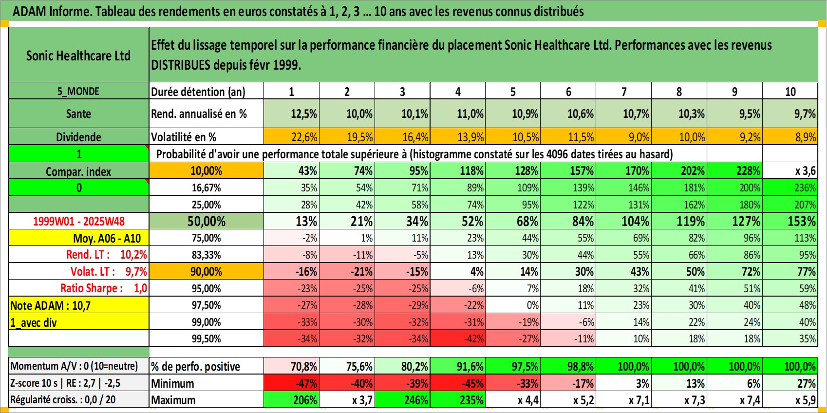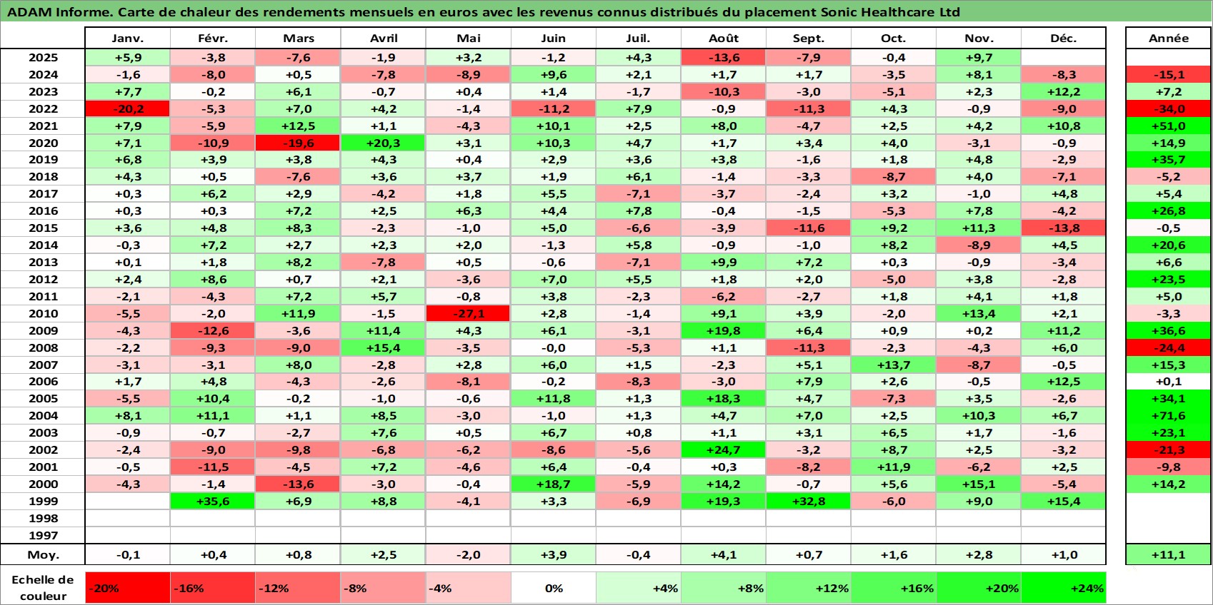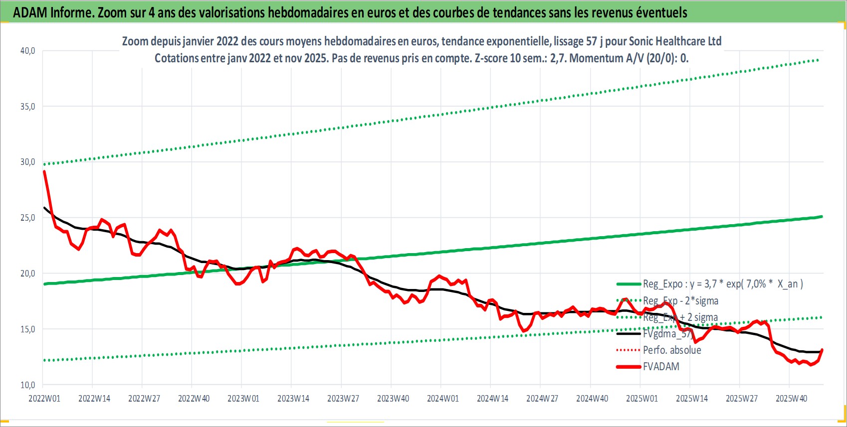Site dédié aux investisseursPage dédiée sur site financeAnalyse des valorisations hebdomadaires de l'action Sonic Healthcare Ltd. Cet actif est cote en AUD. Les valorisations sont en contrevaleur EURO et couvrent les semaines 1999W01 a 2025W48. Les revenus de cet actif financier sont pris en compte depuis la semaine 1999W08. La note globale ESG de cet actif est estimee a 11.0 (apres rebasage entre 0 et 20).