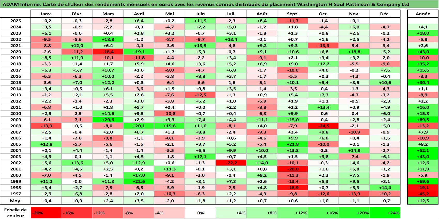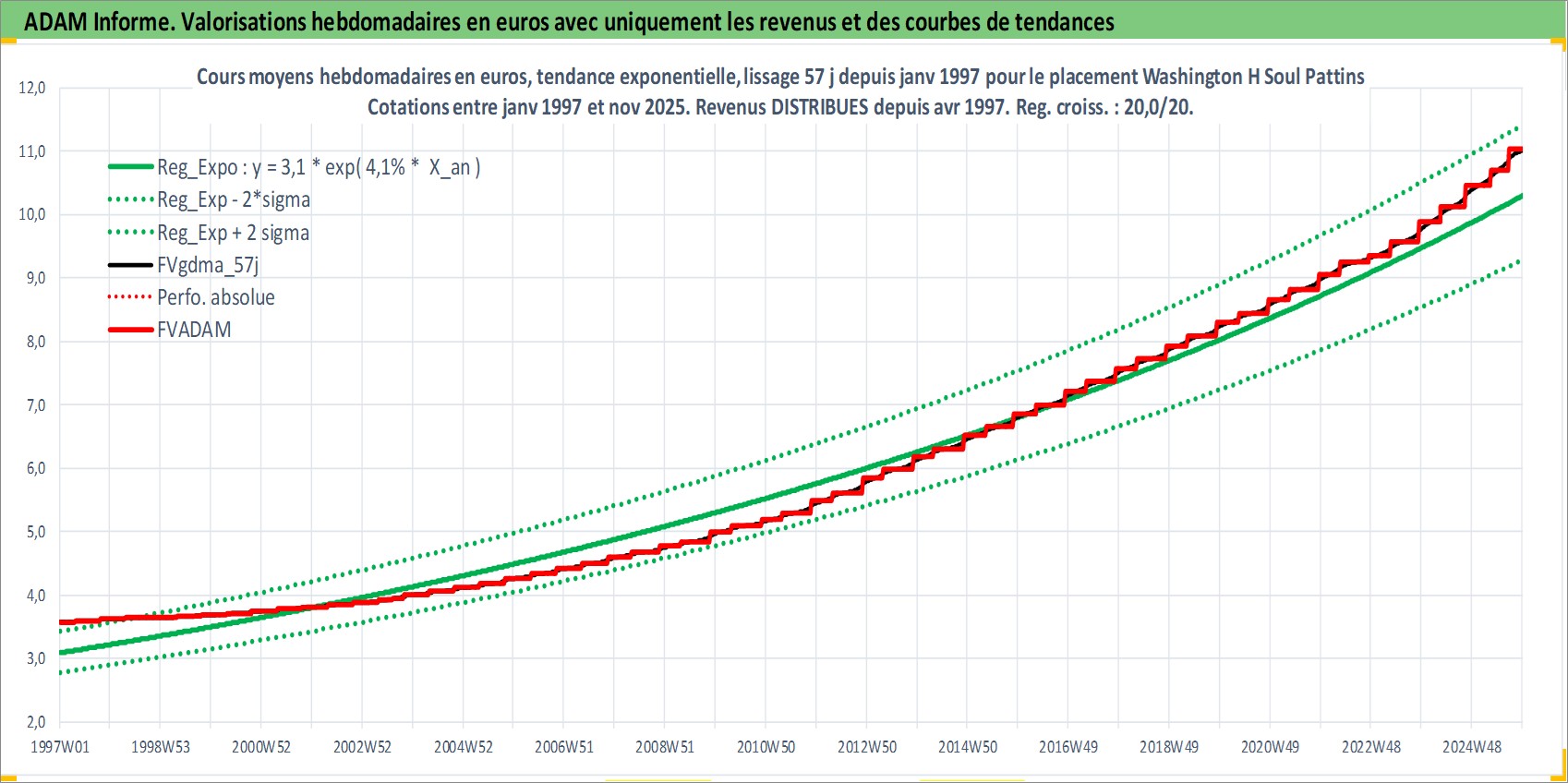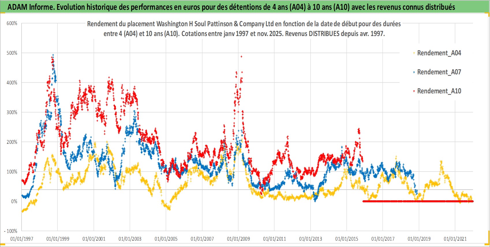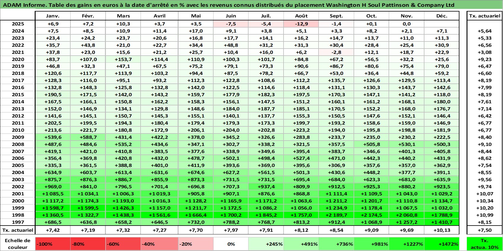 Site dédié aux investisseursPage dédiée sur site financeAnalyse des valorisations hebdomadaires de l'action Washington H Soul Pattinson & Company Ltd. Cet actif est cote en AUD. Les valorisations sont en contrevaleur EURO et couvrent les semaines 1997W01 a 2025W48. Les revenus de cet actif financier sont pris en compte depuis la semaine 1997W17. La note ESG de cet actif n'est pas connue.