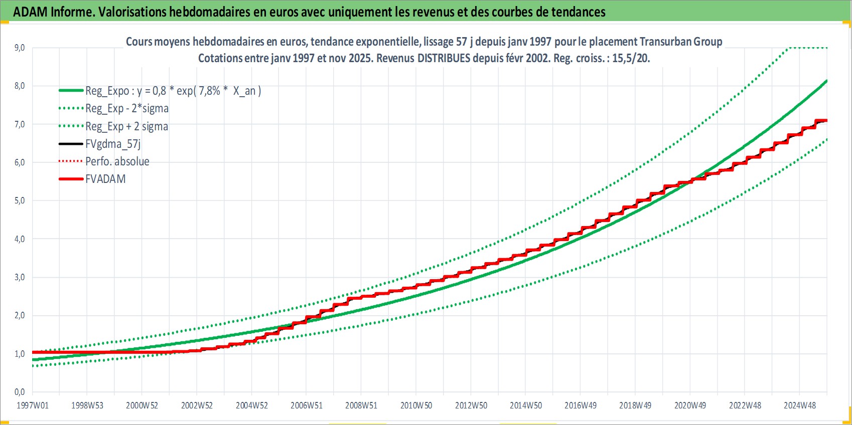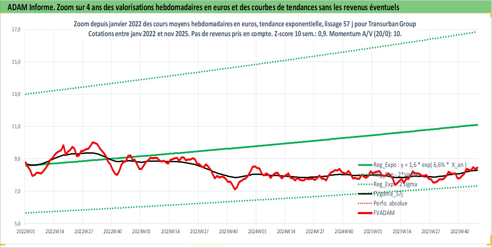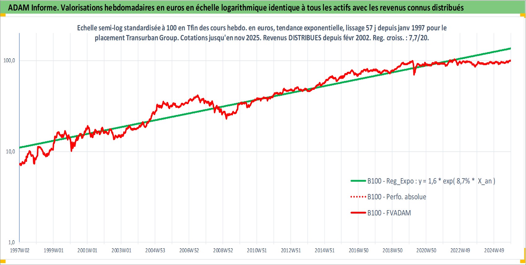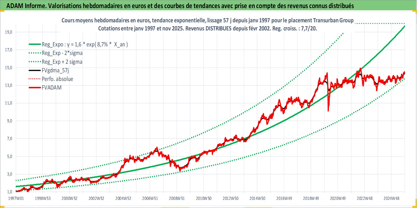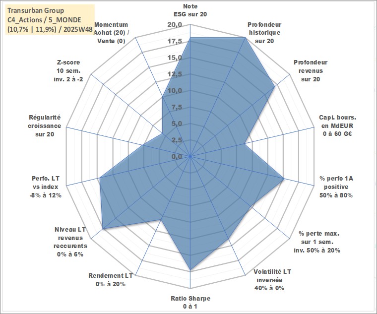 Site dédié aux investisseursPage dédiée sur site financeAnalyse des valorisations hebdomadaires de l'action Transurban Group. Cet actif est cote en AUD. Les valorisations sont en contrevaleur EURO et couvrent les semaines 1997W01 a 2025W48. Les revenus de cet actif financier sont pris en compte depuis la semaine 2002W06. La note globale ESG de cet actif est estimee a 18.0 (apres rebasage entre 0 et 20).