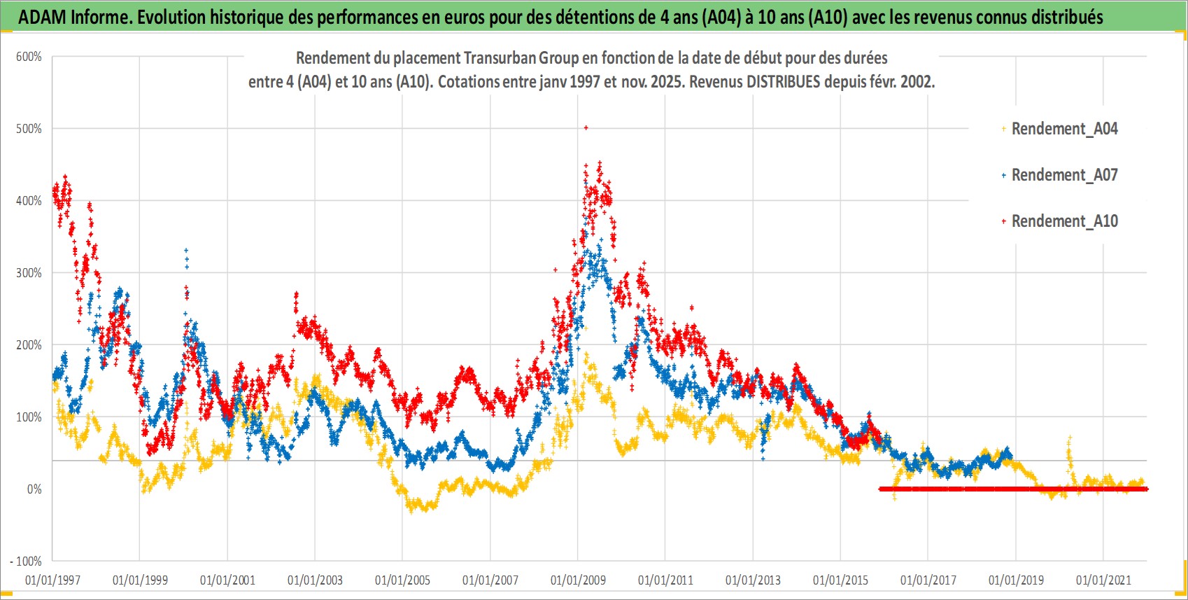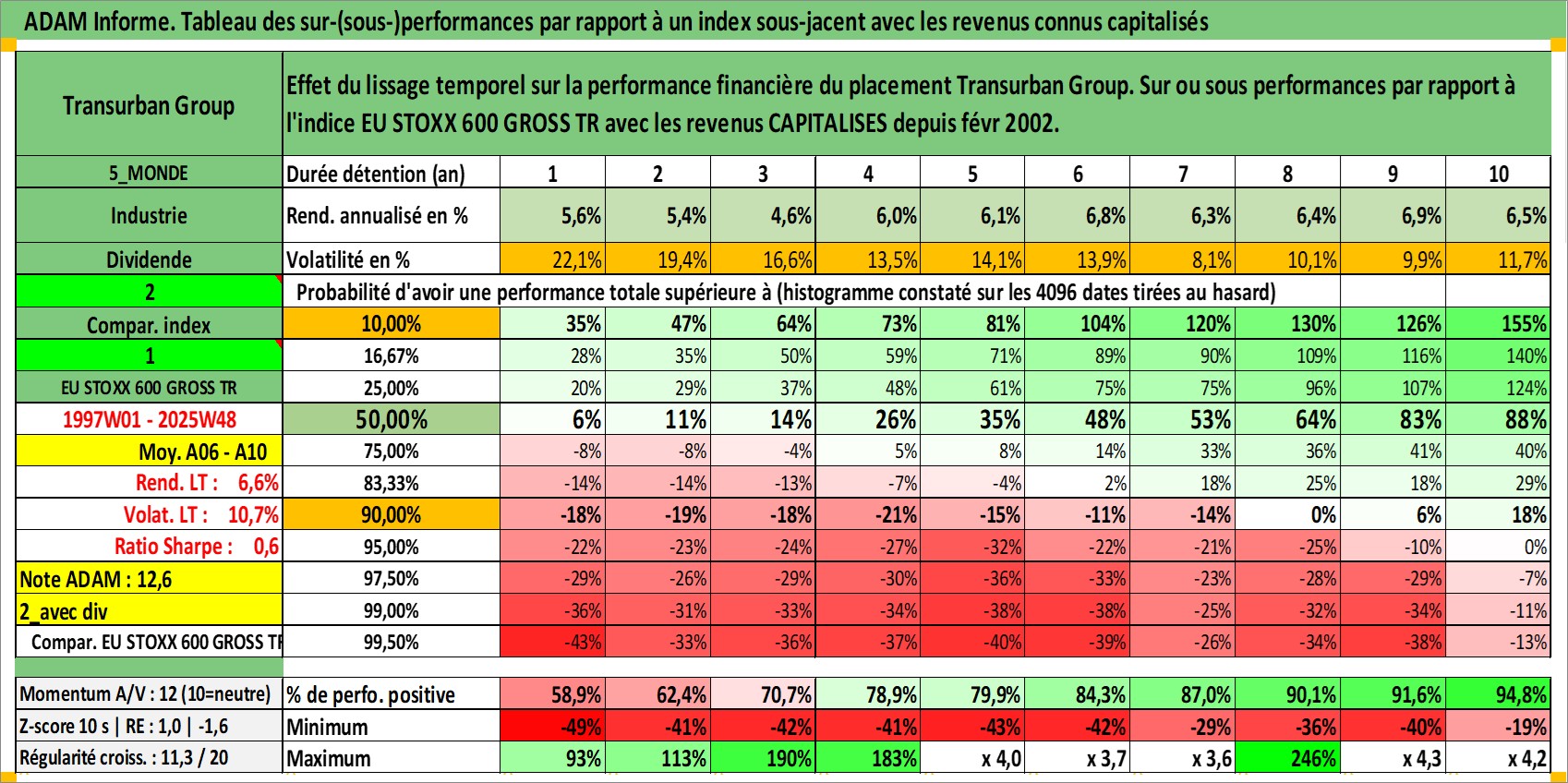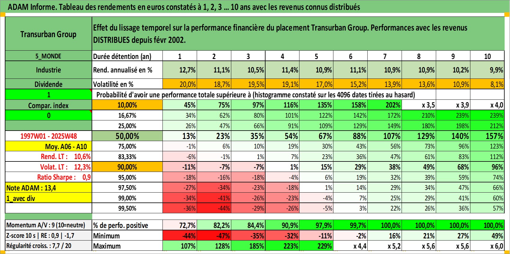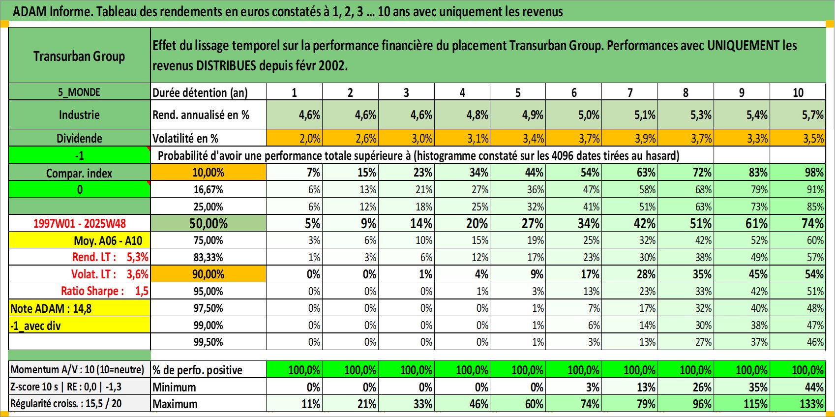 Site dédié aux investisseursPage dédiée sur site financeAnalyse des valorisations hebdomadaires de l'action Transurban Group. Cet actif est cote en AUD. Les valorisations sont en contrevaleur EURO et couvrent les semaines 1997W01 a 2025W48. Les revenus de cet actif financier sont pris en compte depuis la semaine 2002W06. La note globale ESG de cet actif est estimee a 18.0 (apres rebasage entre 0 et 20).