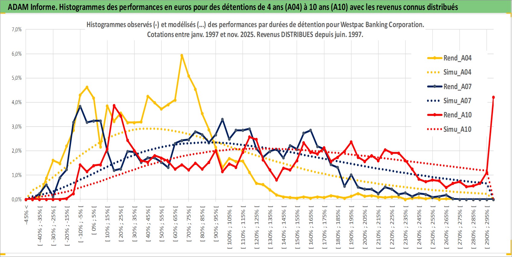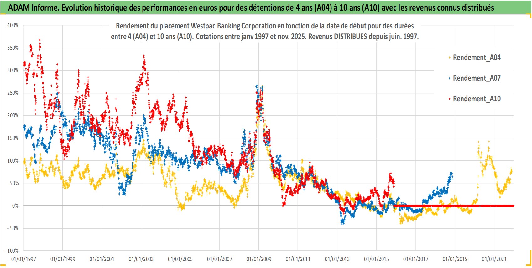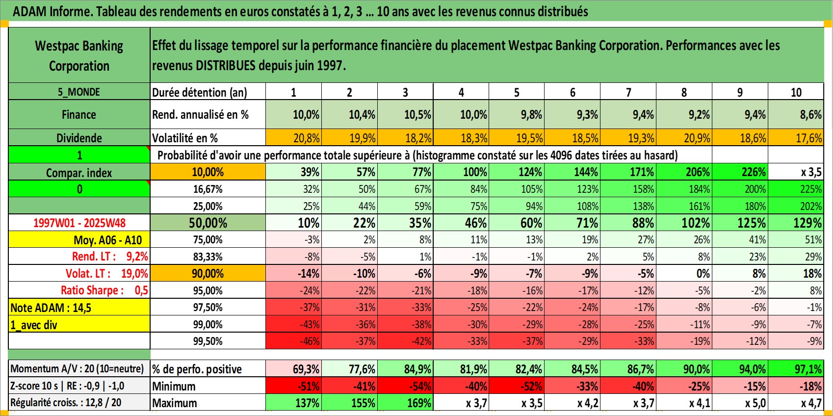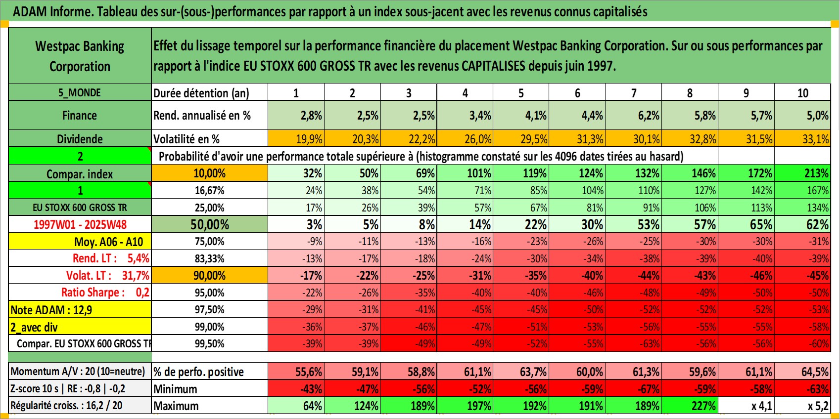 Site dédié aux investisseursPage dédiée sur site financeAnalyse des valorisations hebdomadaires de l'action Westpac Banking Corporation. Cet actif est cote en AUD. Les valorisations sont en contrevaleur EURO et couvrent les semaines 1997W01 a 2025W48. Les revenus de cet actif financier sont pris en compte depuis la semaine 1997W23. La note globale ESG de cet actif est estimee a 8.0 (apres rebasage entre 0 et 20).