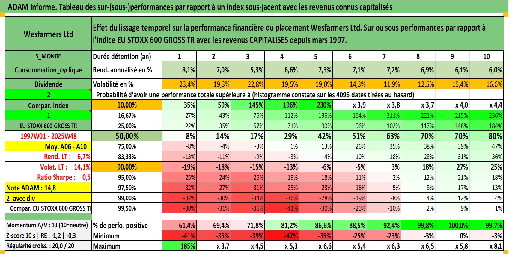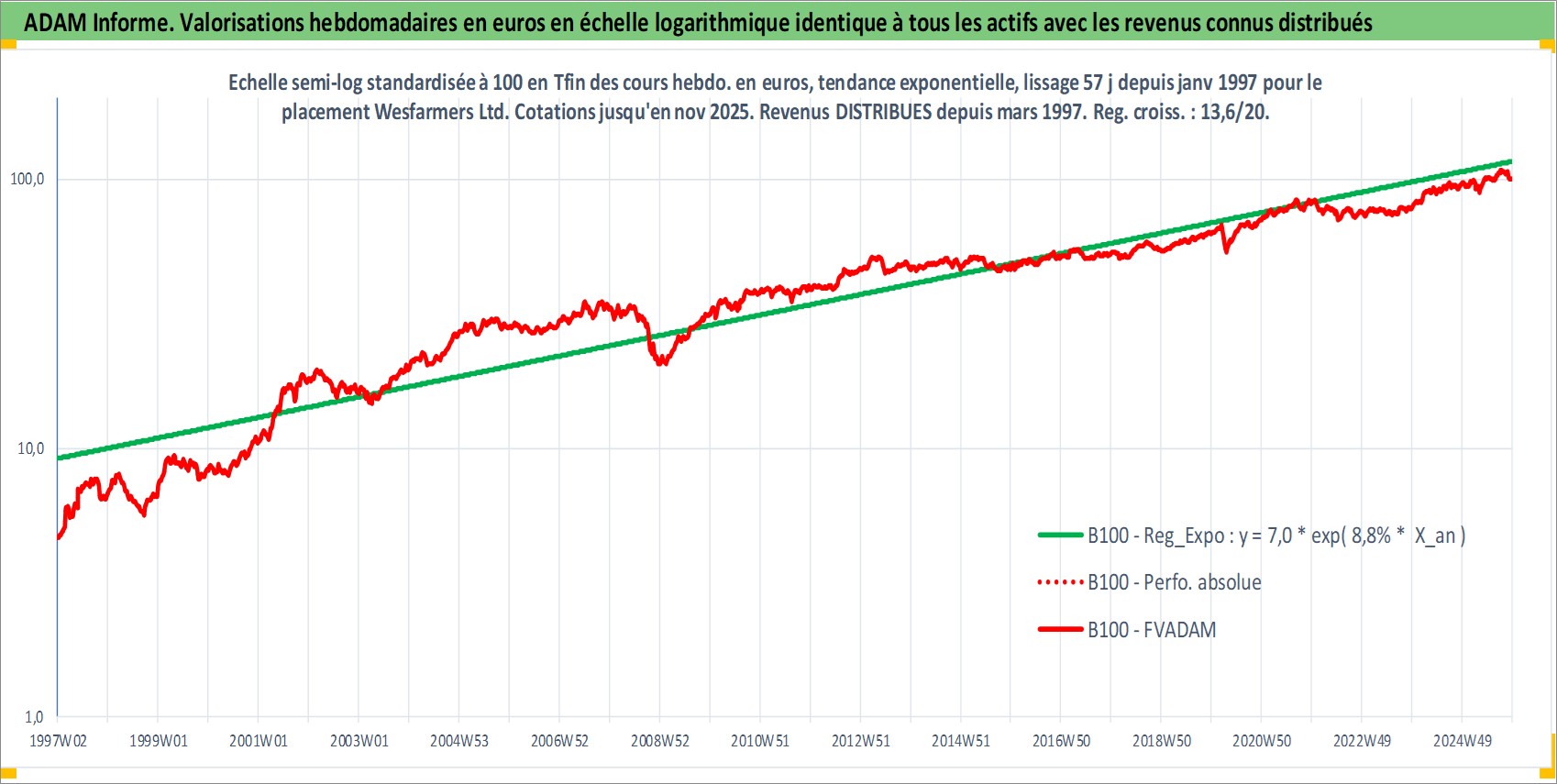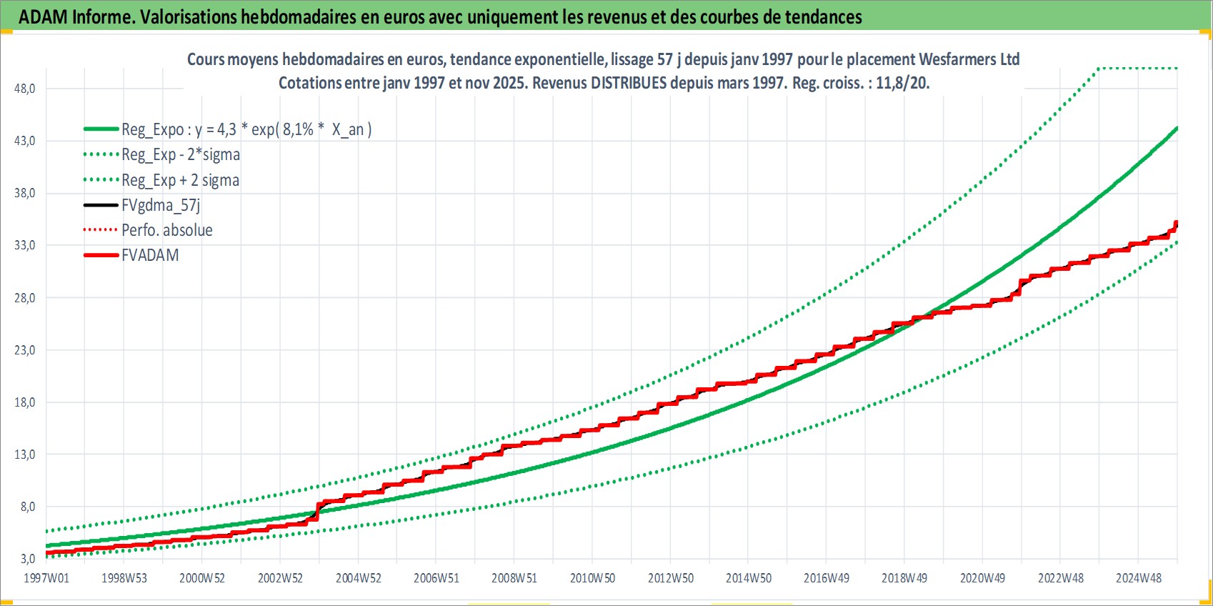 Site dédié aux investisseursPage dédiée sur site financeAnalyse des valorisations hebdomadaires de l'action Wesfarmers Ltd. Cet actif est cote en AUD. Les valorisations sont en contrevaleur EURO et couvrent les semaines 1997W01 a 2025W48. Les revenus de cet actif financier sont pris en compte depuis la semaine 1997W12. La note globale ESG de cet actif est estimee a 15.0 (apres rebasage entre 0 et 20).