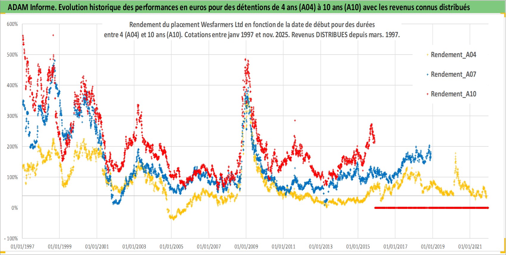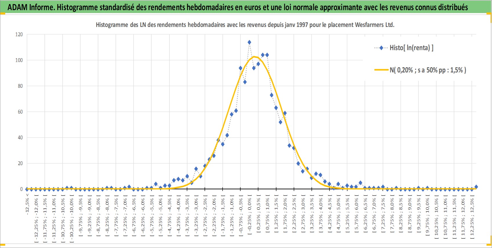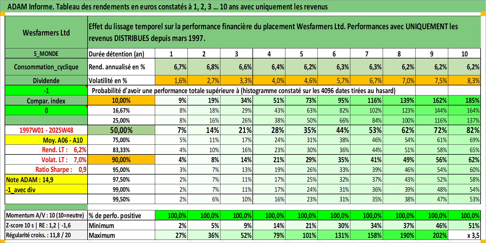 Site dédié aux investisseursPage dédiée sur site financeAnalyse des valorisations hebdomadaires de l'action Wesfarmers Ltd. Cet actif est cote en AUD. Les valorisations sont en contrevaleur EURO et couvrent les semaines 1997W01 a 2025W48. Les revenus de cet actif financier sont pris en compte depuis la semaine 1997W12. La note globale ESG de cet actif est estimee a 15.0 (apres rebasage entre 0 et 20).