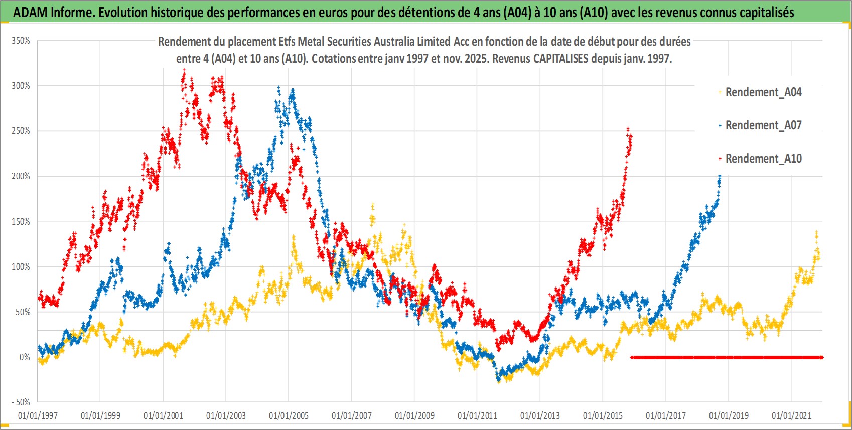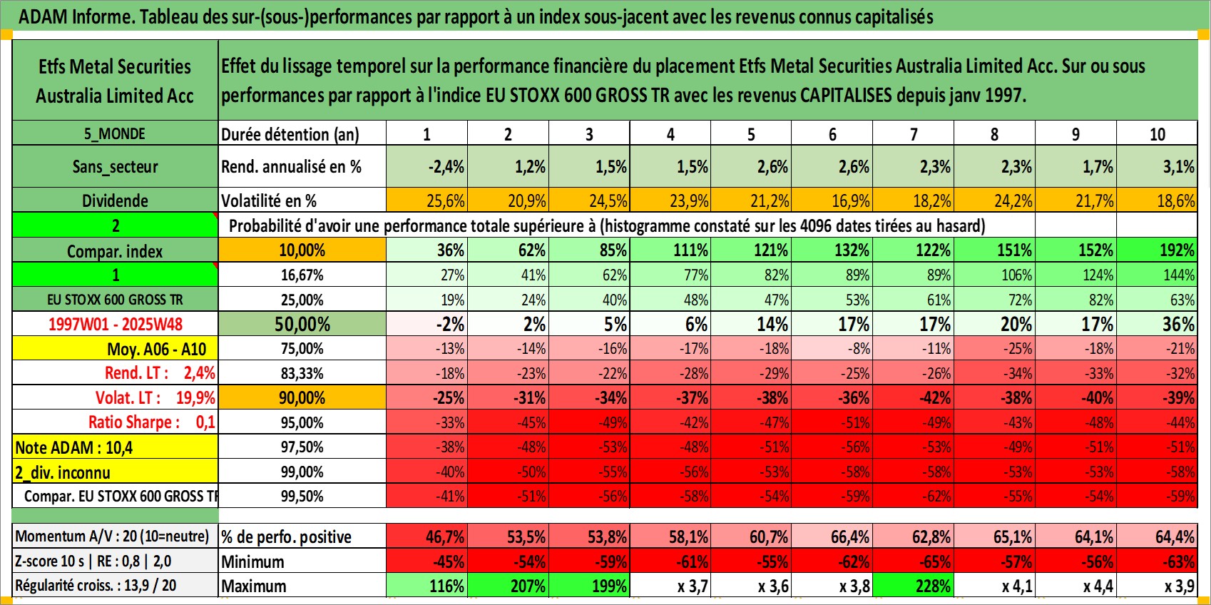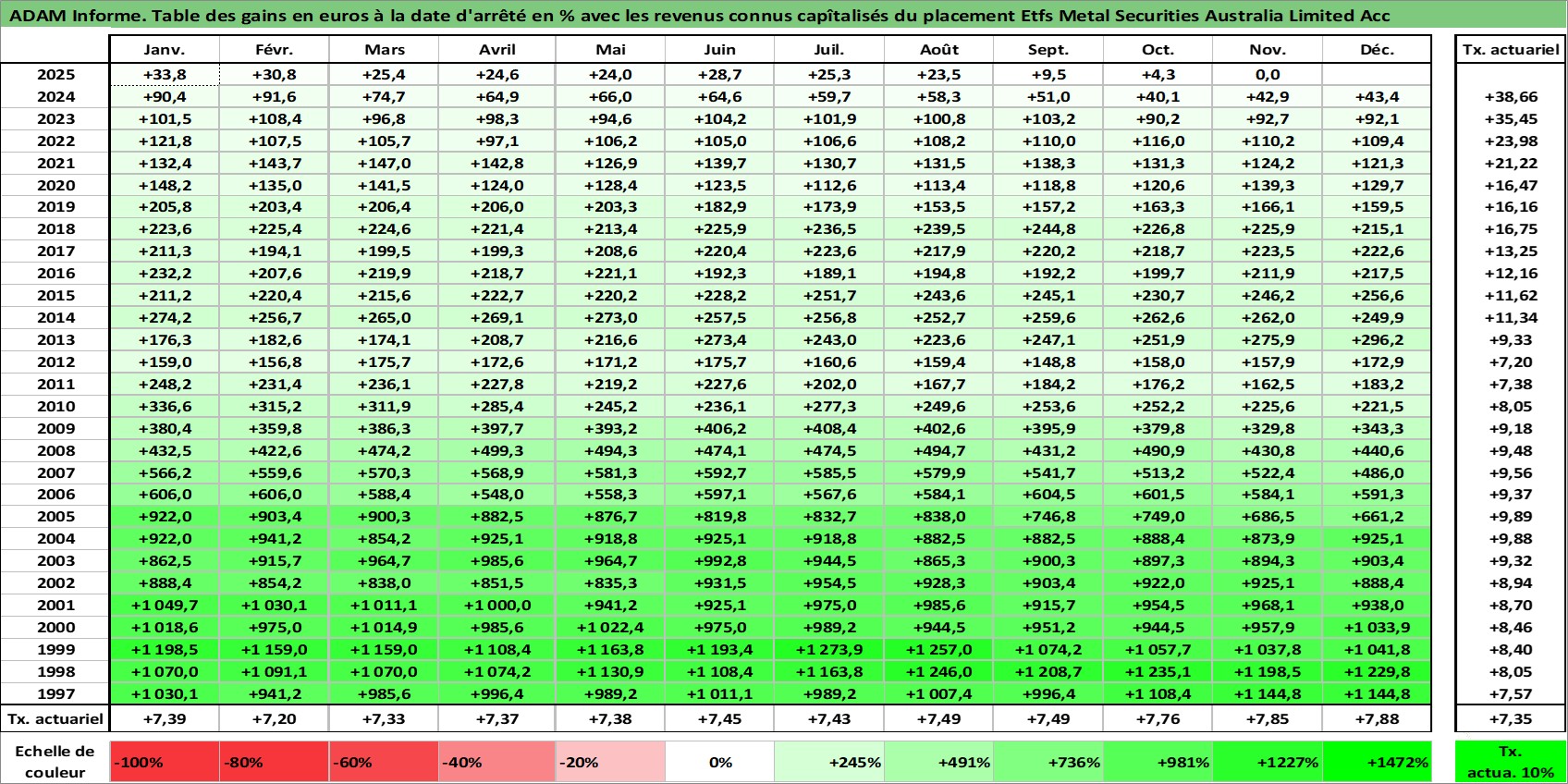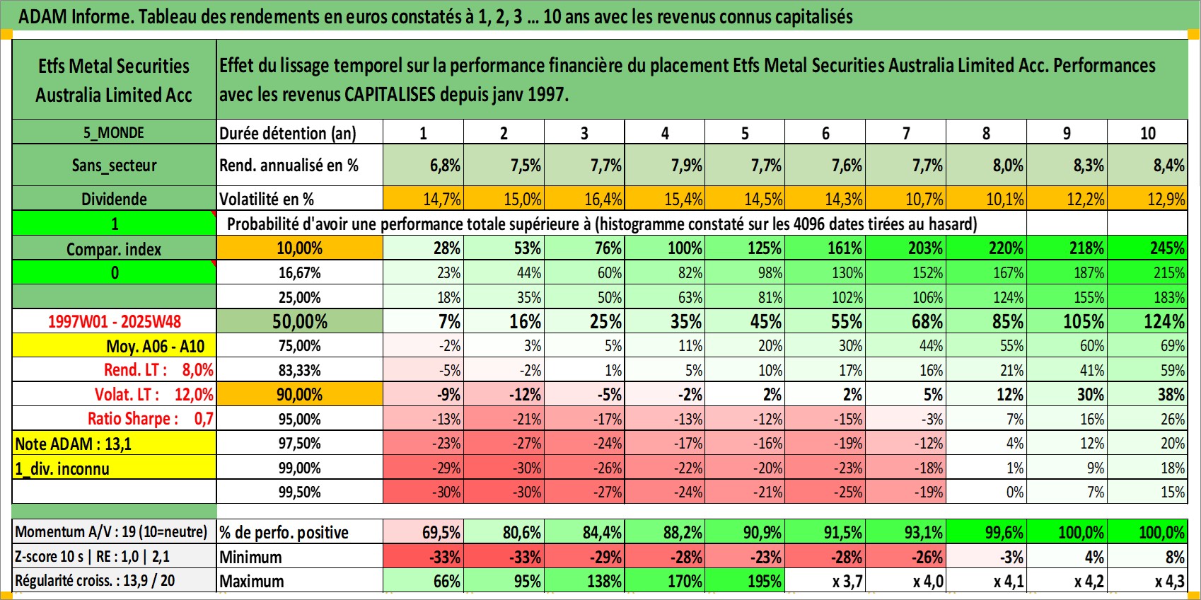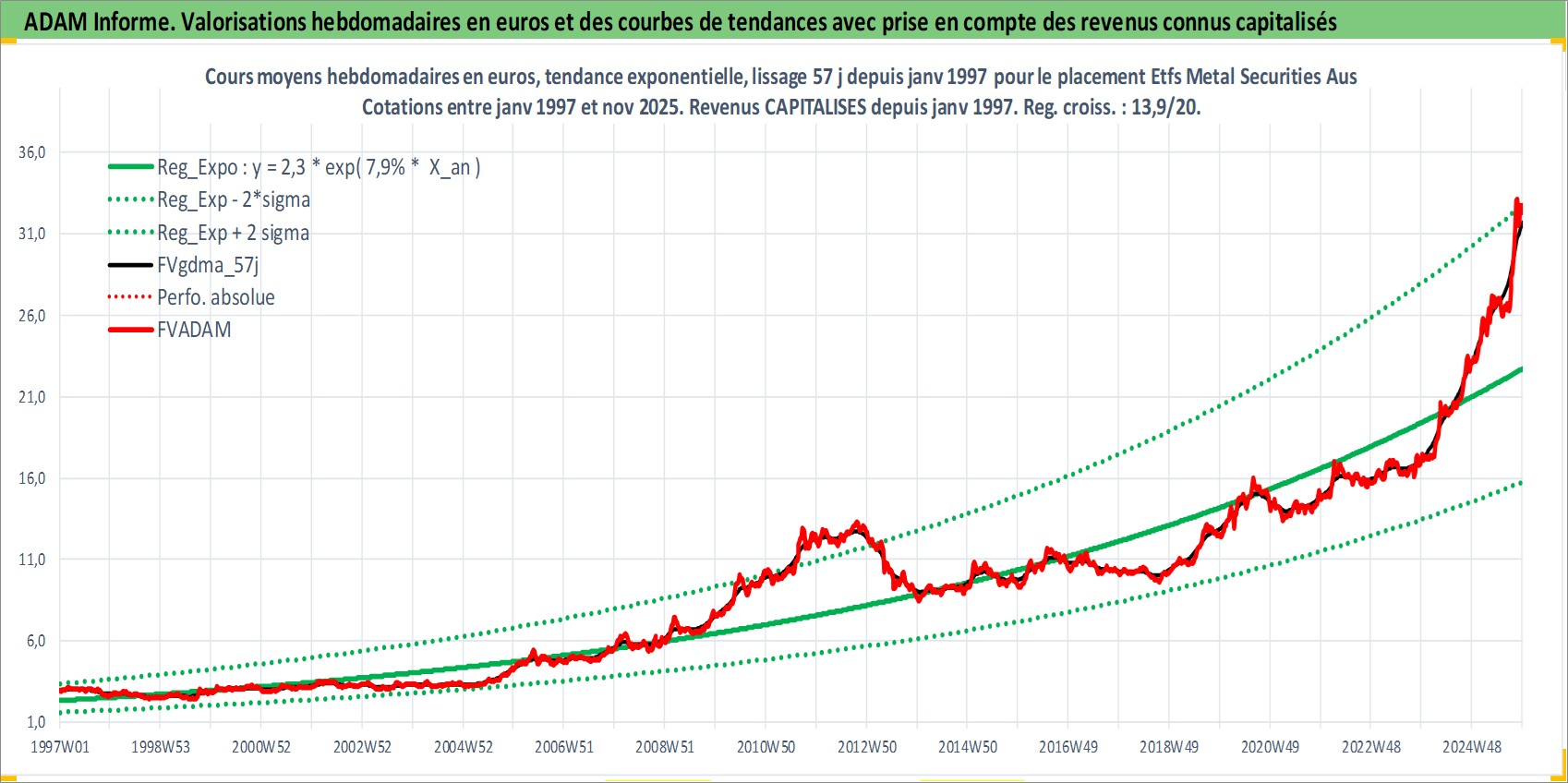 Site dédié aux investisseursPage dédiée sur site financeAnalyse des valorisations hebdomadaires du fonds Etfs Metal Securities Australia Limited Acc. Cet actif est cote en AUD. Les valorisations sont en contrevaleur EURO et couvrent les semaines 1997W01 a 2025W48. Les revenus de cet actif financier sont pris en compte depuis la semaine 1997W01. La note ESG de cet actif n'est pas connue.