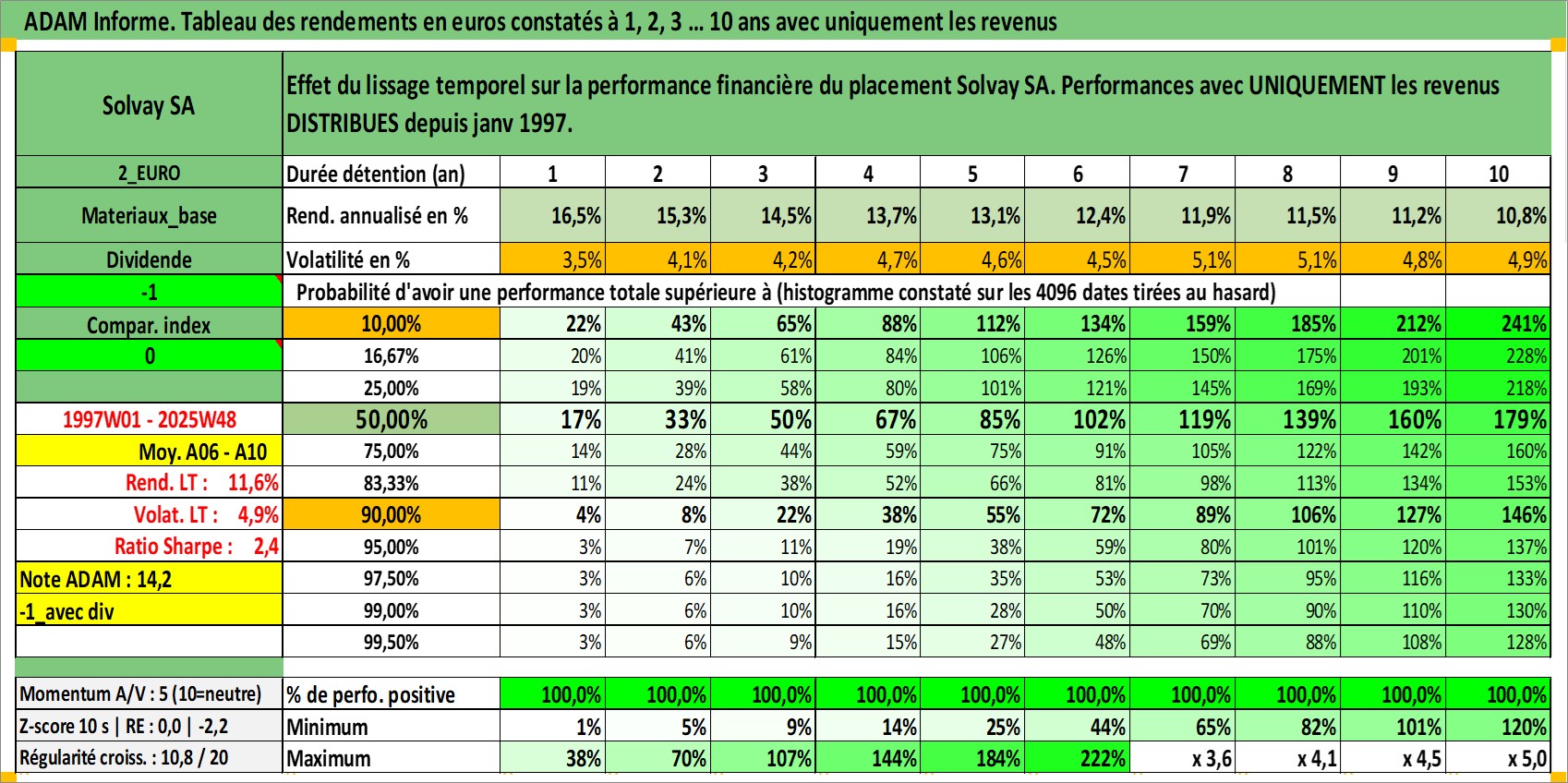 Site dédié aux investisseursPage dédiée sur site financeAnalyse des valorisations hebdomadaires de l'action Solvay SA. Cet actif est cote en EUR. Les valorisations couvrent les semaines 1997W01 a 2025W48. Les revenus de cet actif financier sont pris en compte depuis la semaine 1997W04. La note globale ESG de cet actif est estimee a 8.0 (apres rebasage entre 0 et 20).