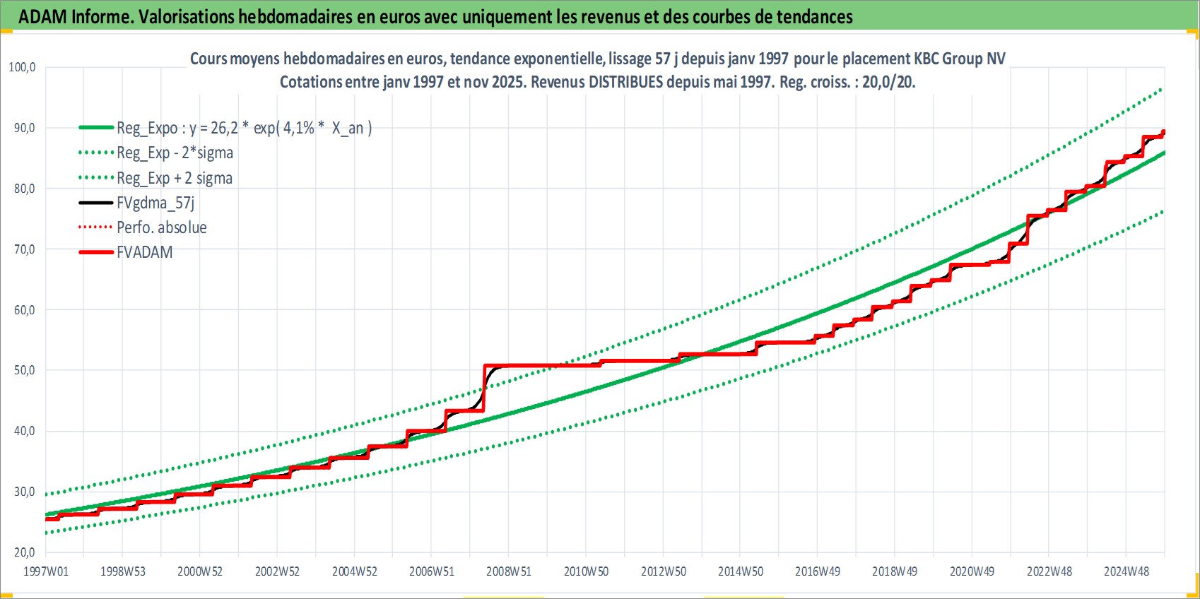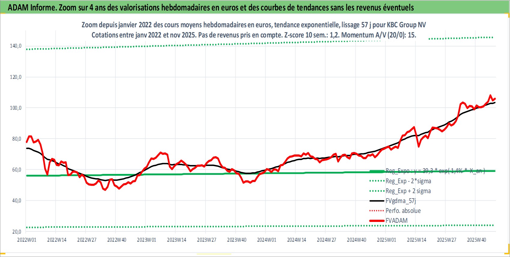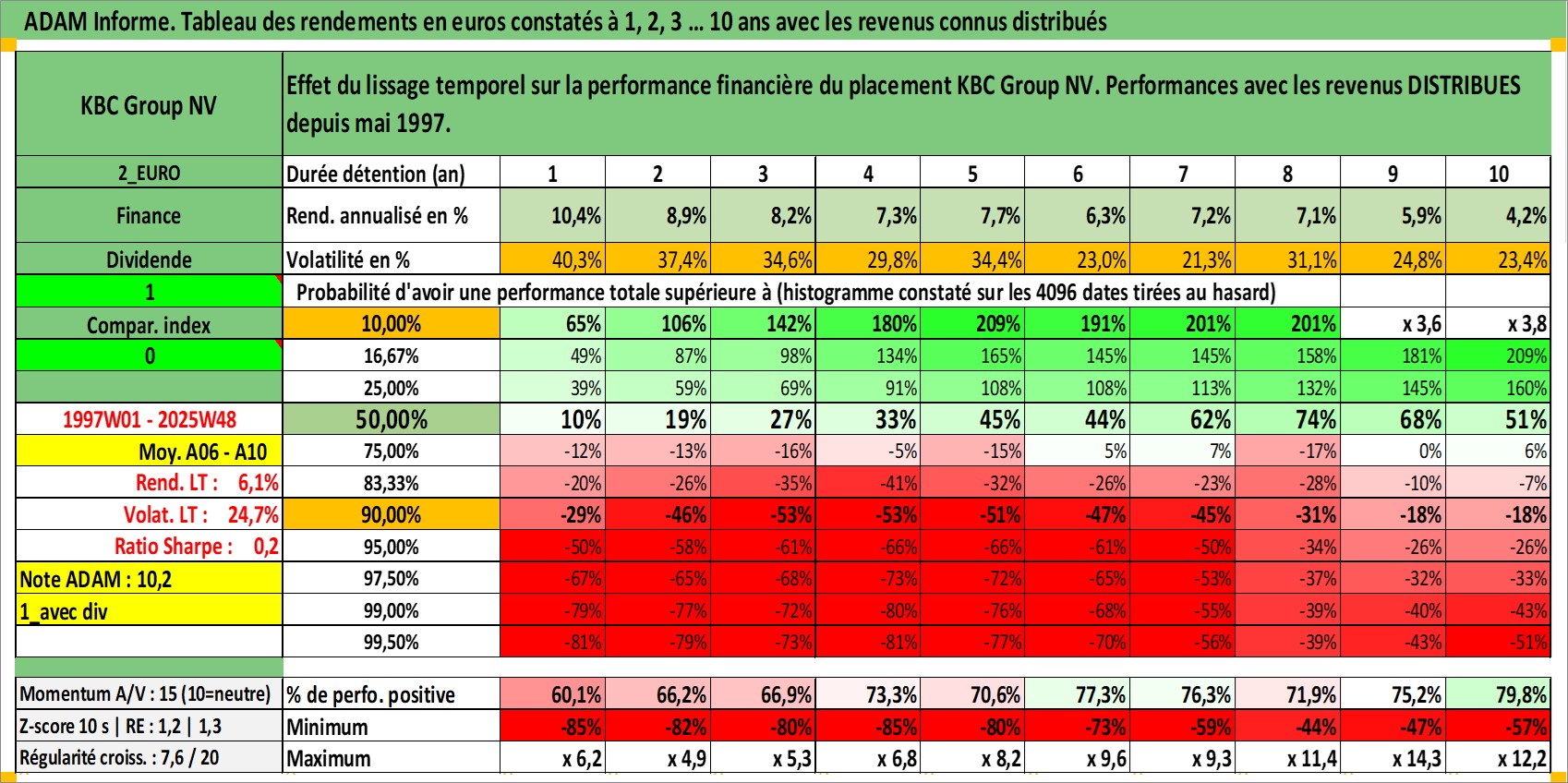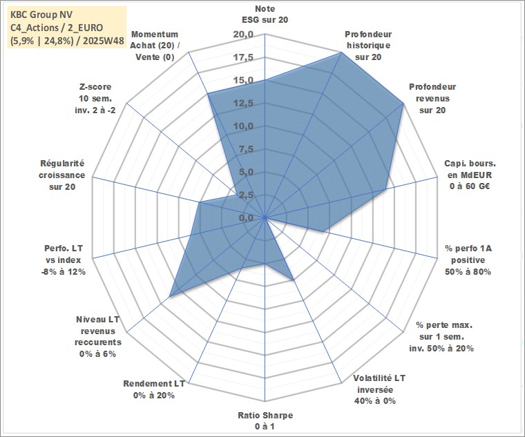 Site dédié aux investisseursPage dédiée sur site financeAnalyse des valorisations hebdomadaires de l'action KBC Group NV. Cet actif est cote en EUR. Les valorisations couvrent les semaines 1997W01 a 2025W48. Les revenus de cet actif financier sont pris en compte depuis la semaine 1997W19. La note globale ESG de cet actif est estimee a 15.0 (apres rebasage entre 0 et 20).