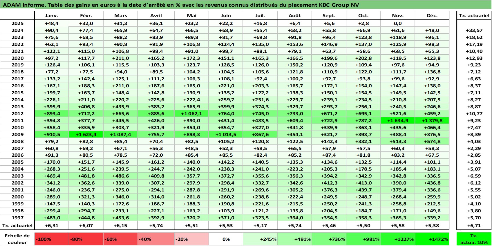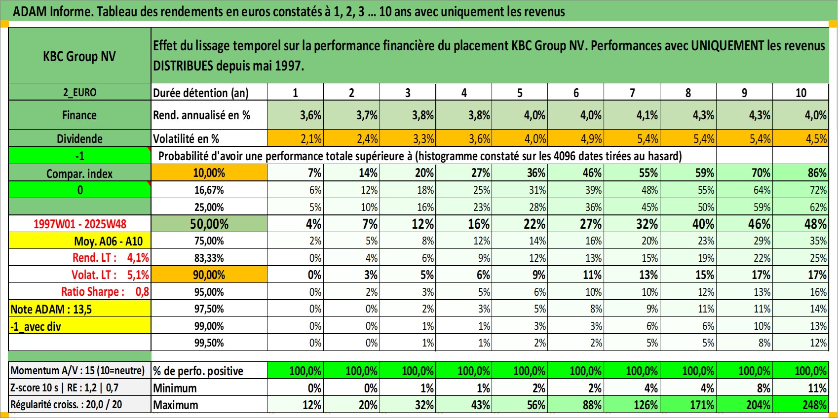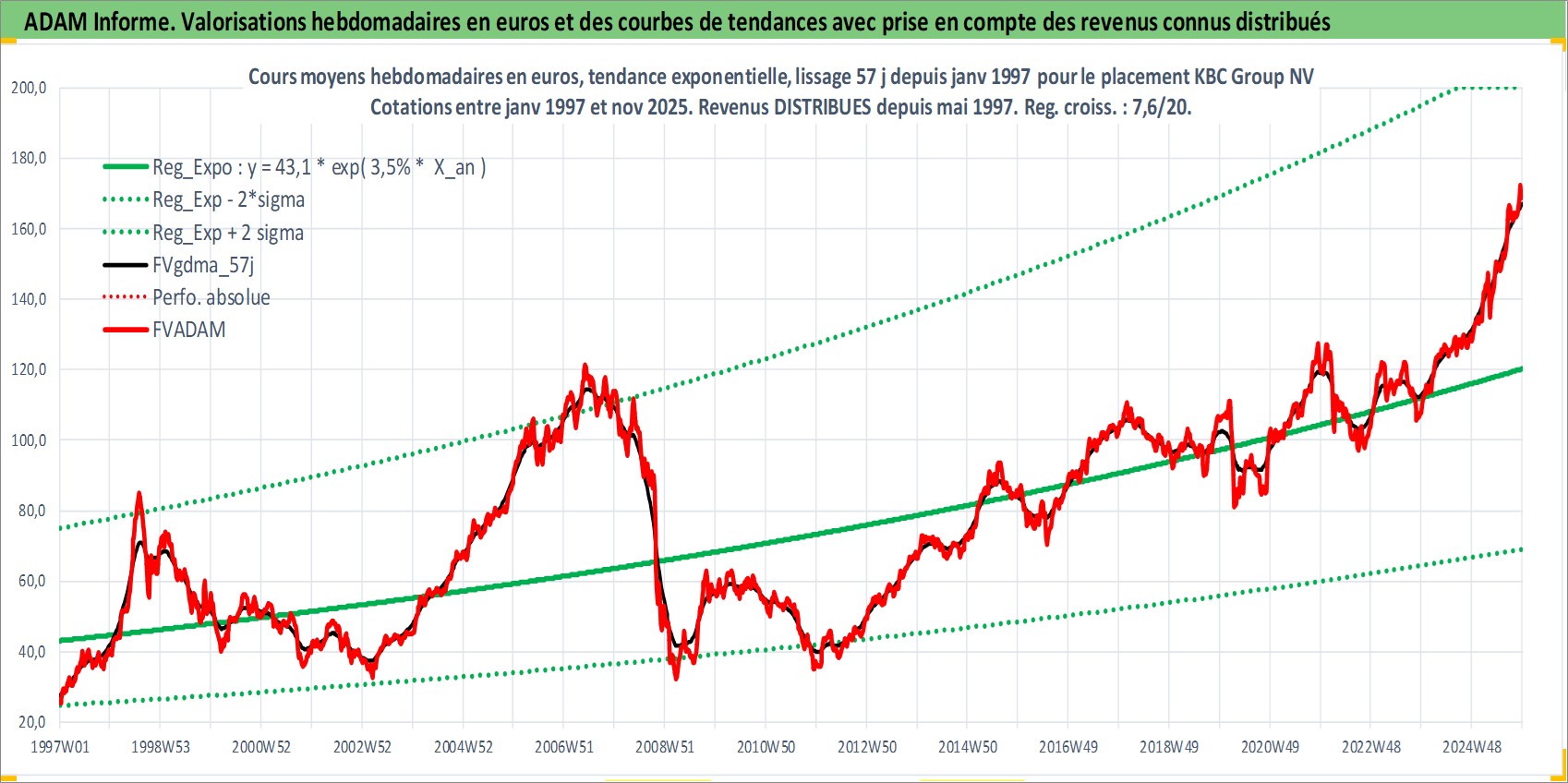 Site dédié aux investisseursPage dédiée sur site financeAnalyse des valorisations hebdomadaires de l'action KBC Group NV. Cet actif est cote en EUR. Les valorisations couvrent les semaines 1997W01 a 2025W48. Les revenus de cet actif financier sont pris en compte depuis la semaine 1997W19. La note globale ESG de cet actif est estimee a 15.0 (apres rebasage entre 0 et 20).