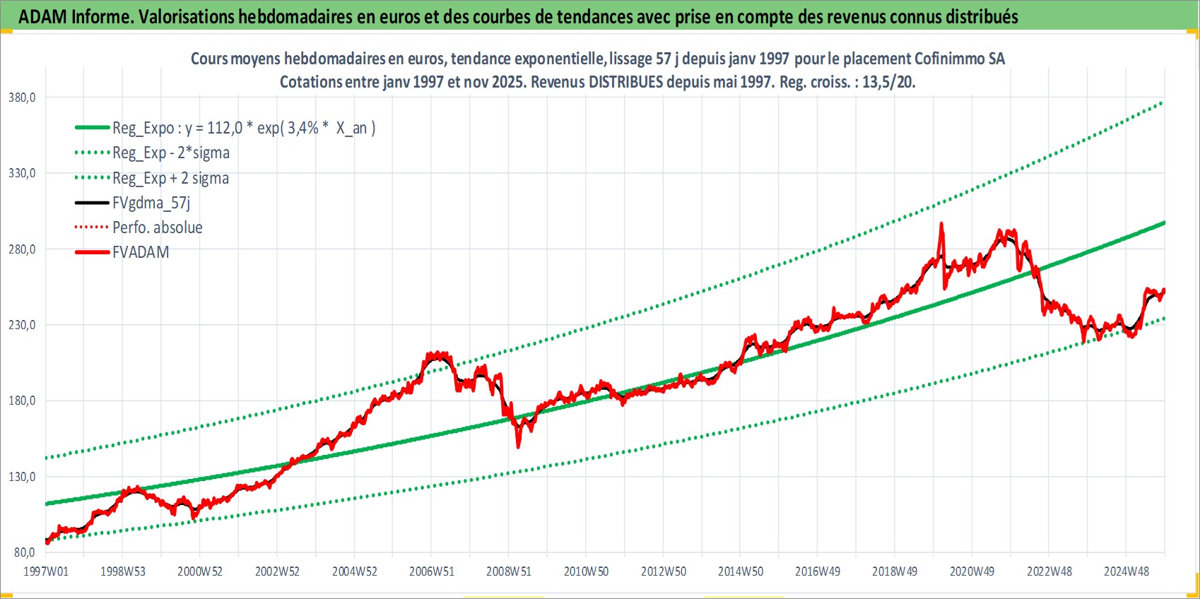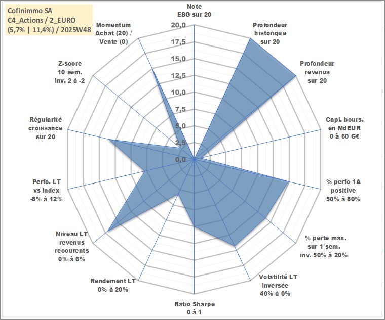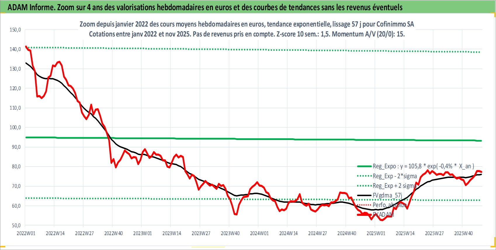 Site dédié aux investisseursPage dédiée sur site financeAnalyse des valorisations hebdomadaires de l'action Cofinimmo SA. Cet actif est cote en EUR. Les valorisations couvrent les semaines 1997W01 a 2025W48. Les revenus de cet actif financier sont pris en compte depuis la semaine 1997W19. La note ESG de cet actif n'est pas connue.