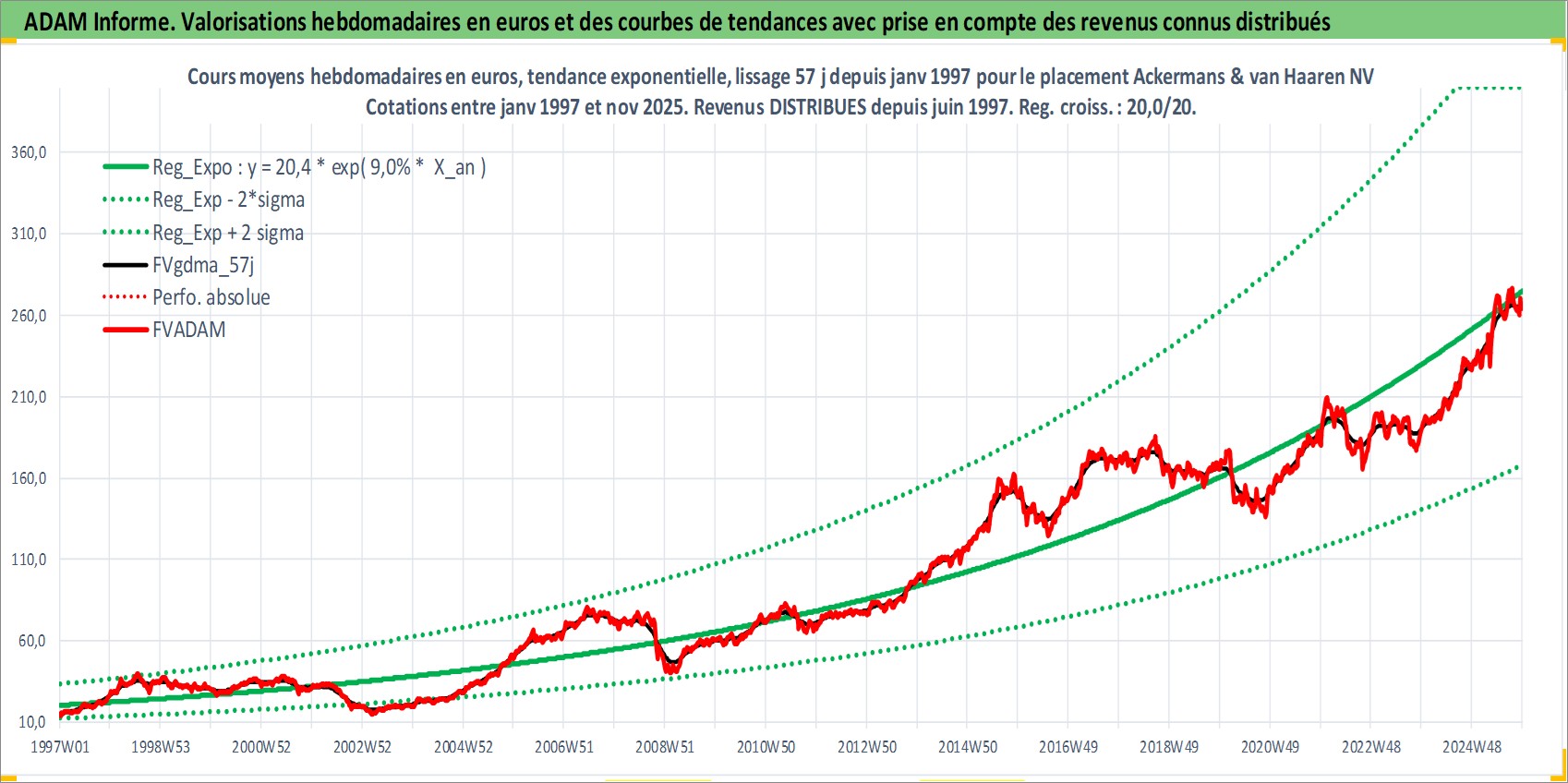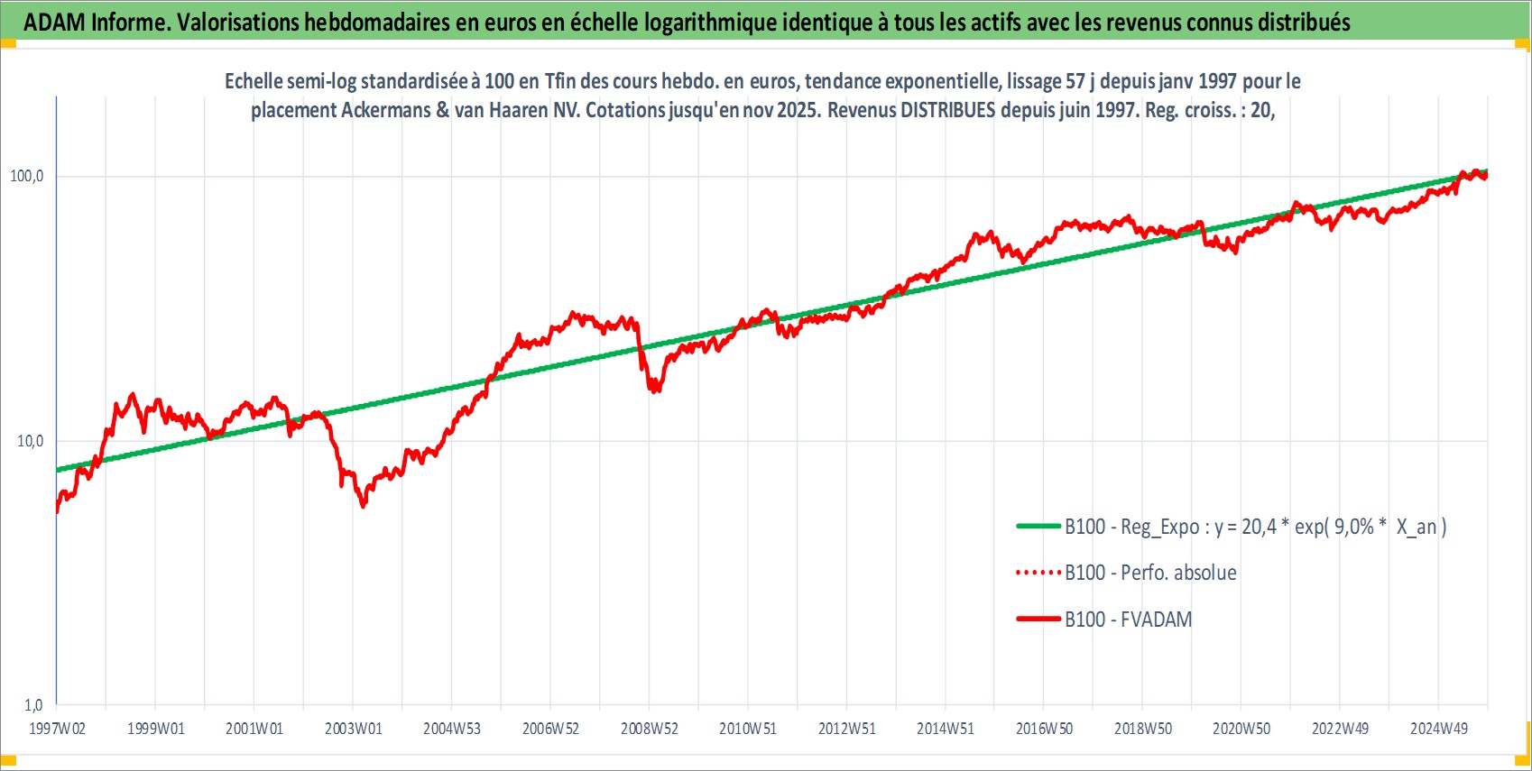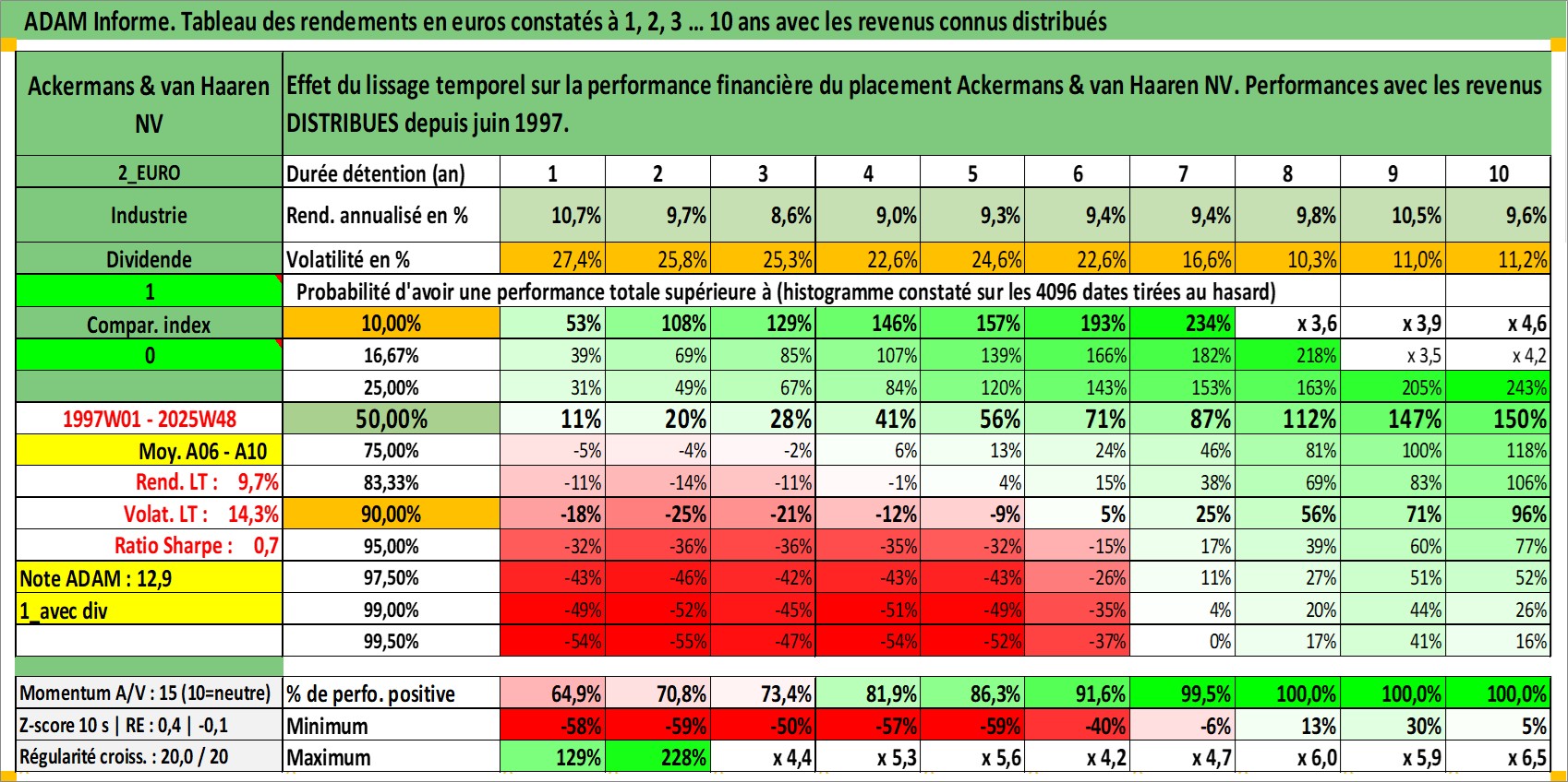 Site dédié aux investisseursPage dédiée sur site financeAnalyse des valorisations hebdomadaires de l'action Ackermans & van Haaren NV. Cet actif est cote en EUR. Les valorisations couvrent les semaines 1997W01 a 2025W48. Les revenus de cet actif financier sont pris en compte depuis la semaine 1997W24. La note ESG de cet actif n'est pas connue.
