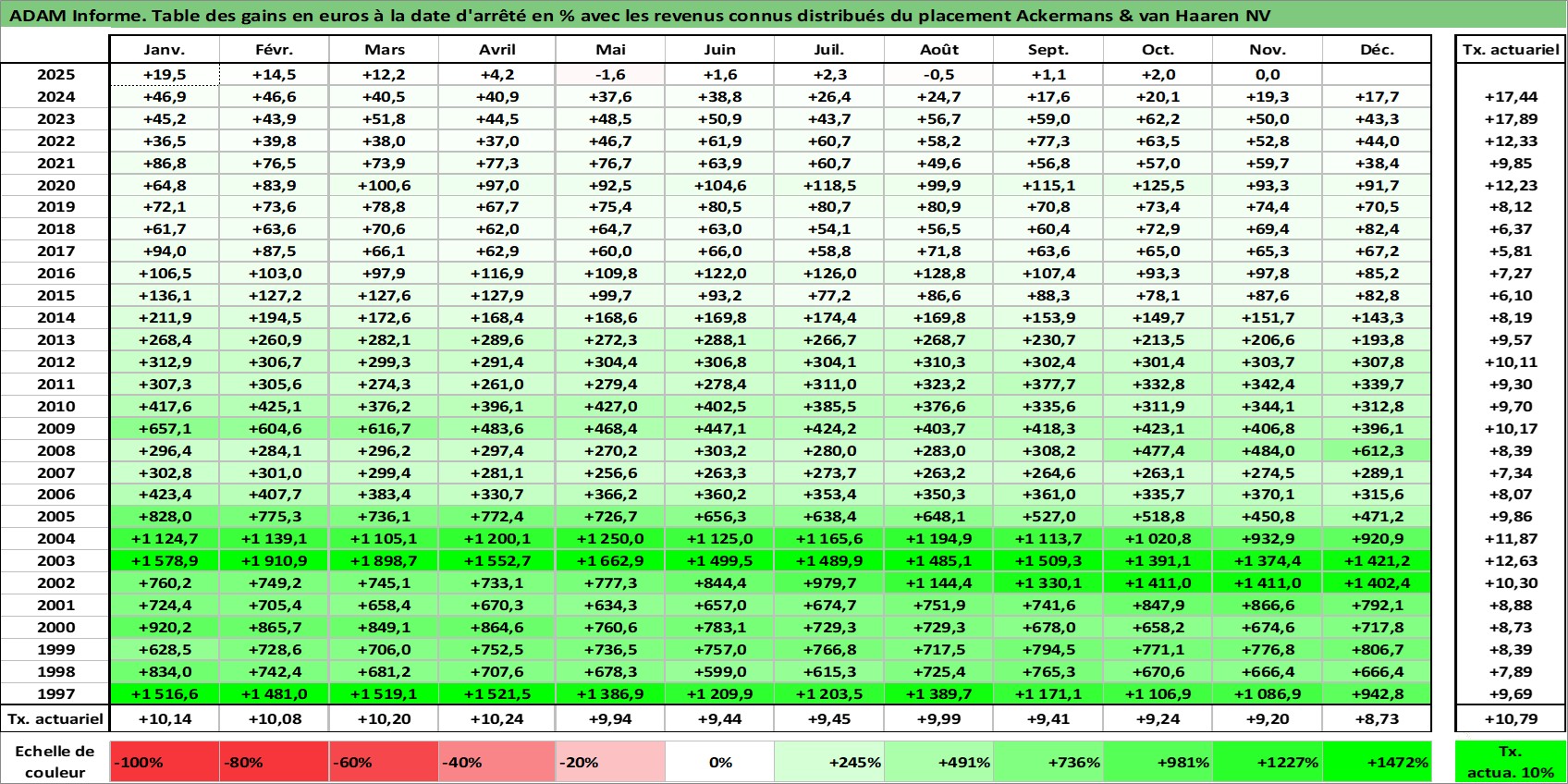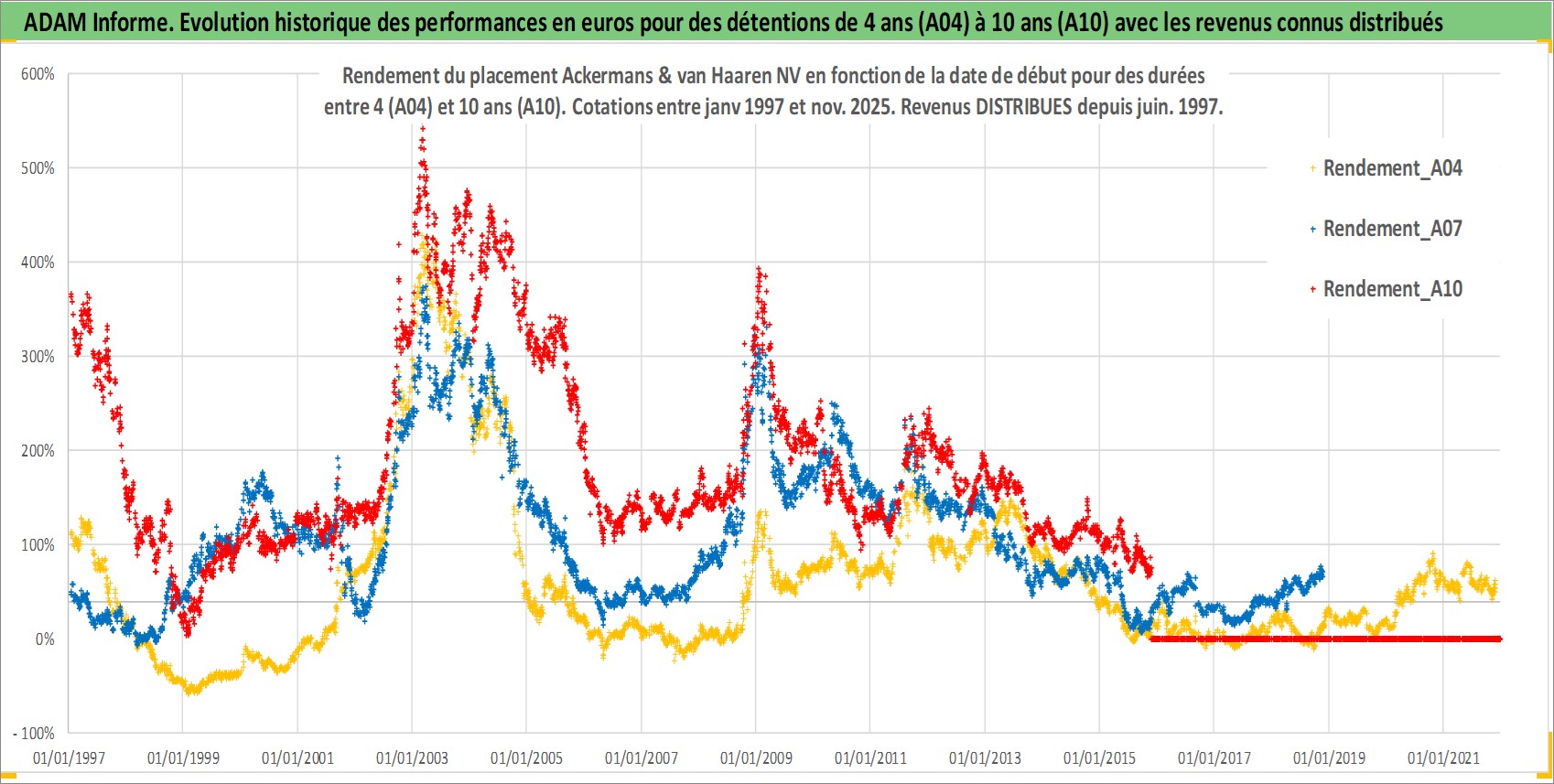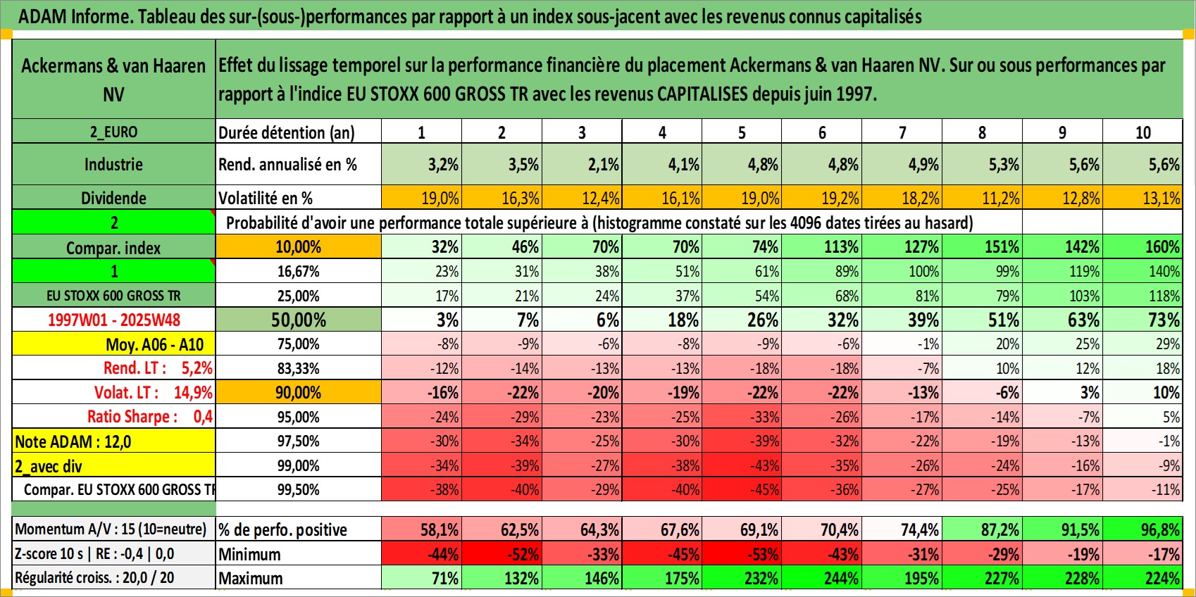 Site dédié aux investisseursPage dédiée sur site financeAnalyse des valorisations hebdomadaires de l'action Ackermans & van Haaren NV. Cet actif est cote en EUR. Les valorisations couvrent les semaines 1997W01 a 2025W48. Les revenus de cet actif financier sont pris en compte depuis la semaine 1997W24. La note ESG de cet actif n'est pas connue.