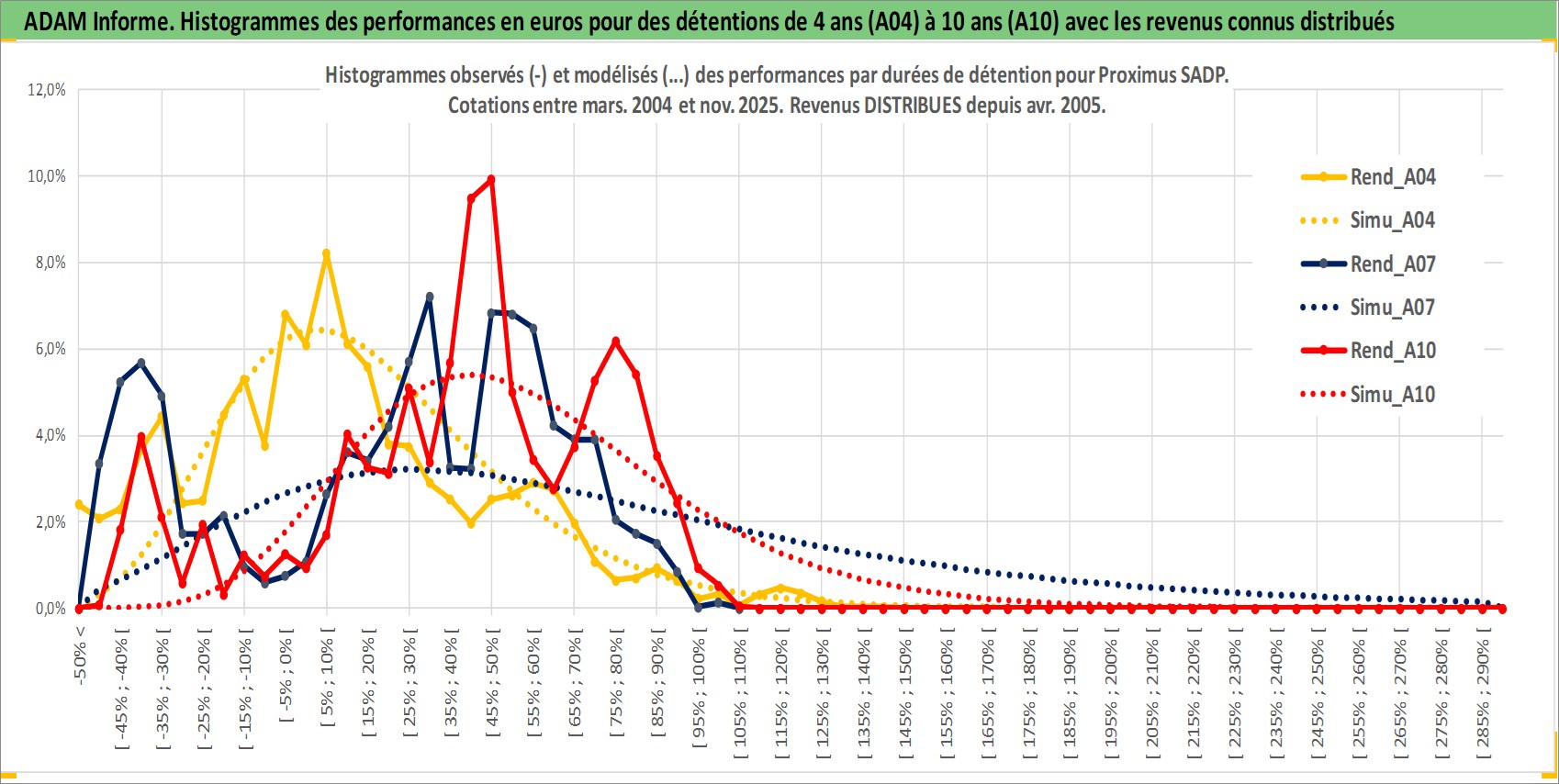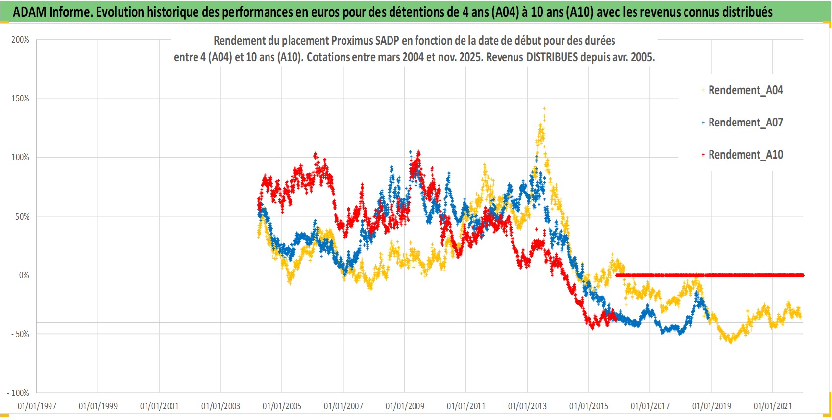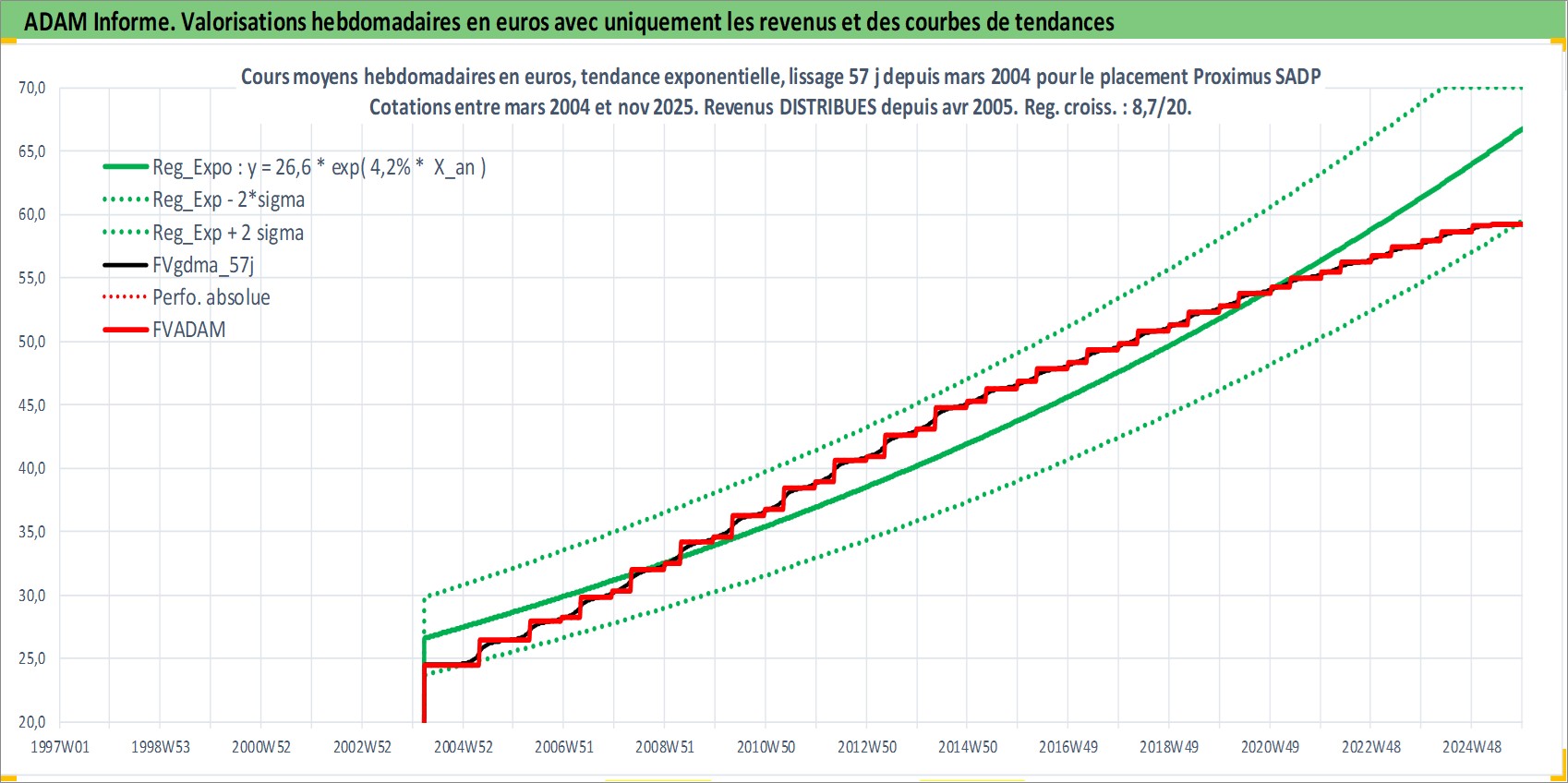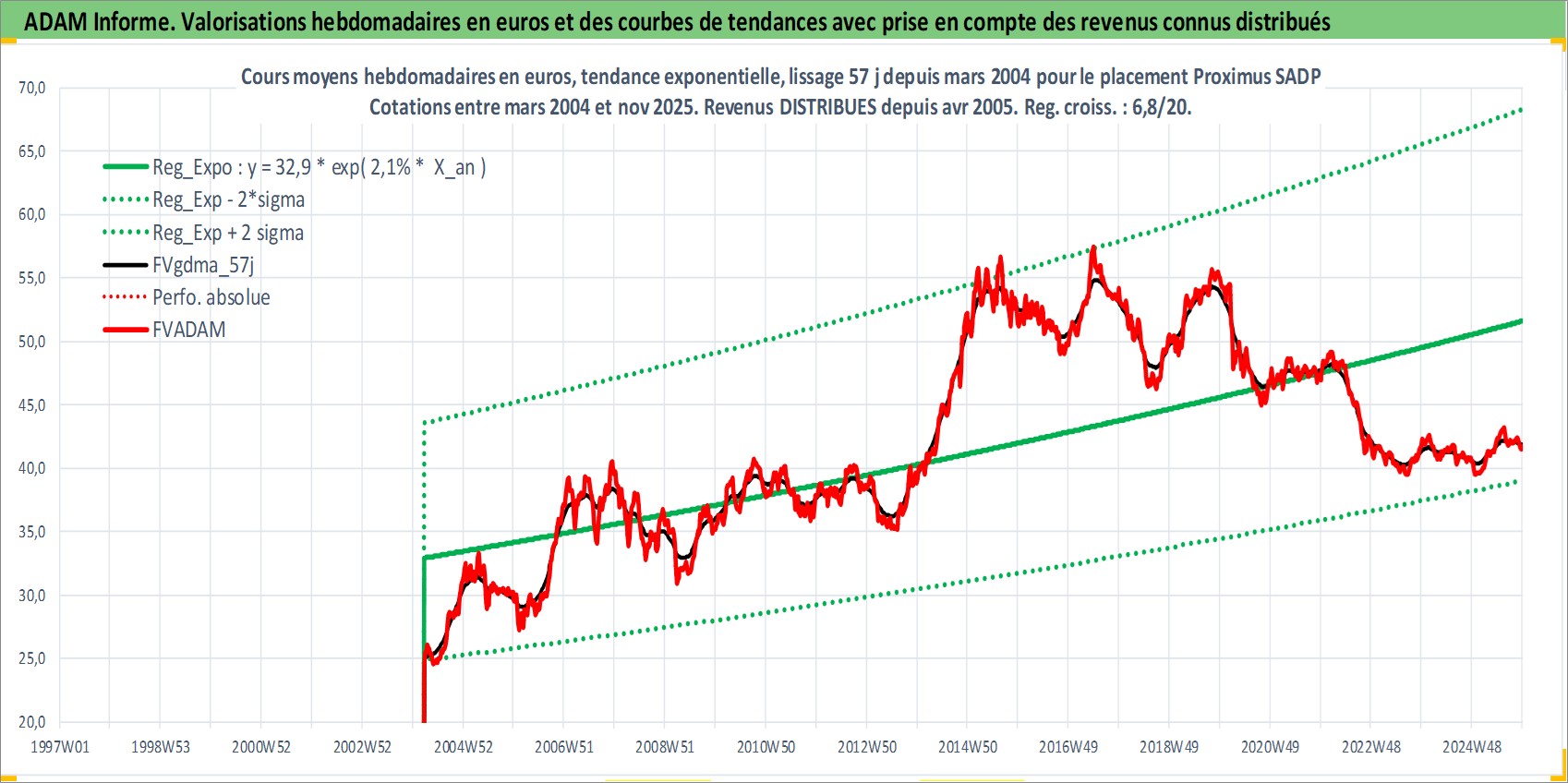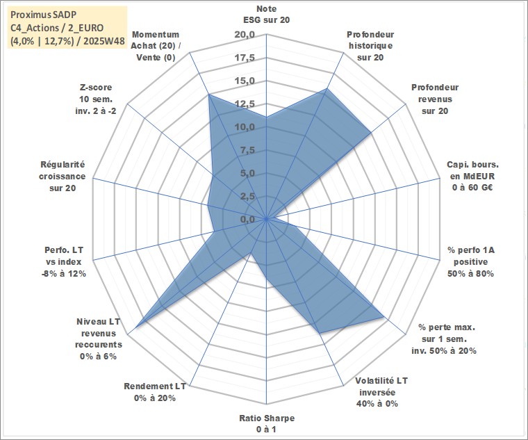 Site dédié aux investisseursPage dédiée sur site financeAnalyse des valorisations hebdomadaires de l'action Proximus SADP. Cet actif est cote en EUR. Les valorisations couvrent les semaines 2004W12 a 2025W48. Les revenus de cet actif financier sont pris en compte depuis la semaine 2005W16. La note globale ESG de cet actif est estimee a 11.0 (apres rebasage entre 0 et 20).
