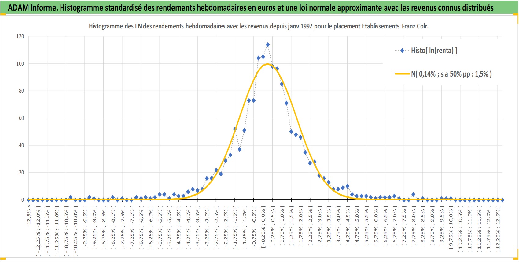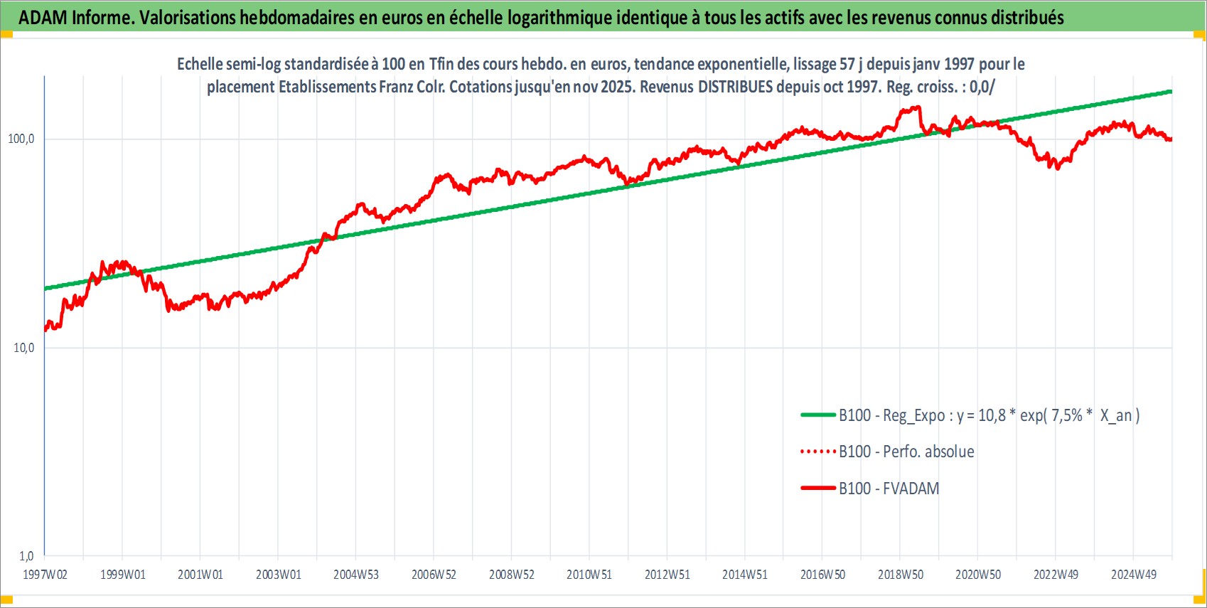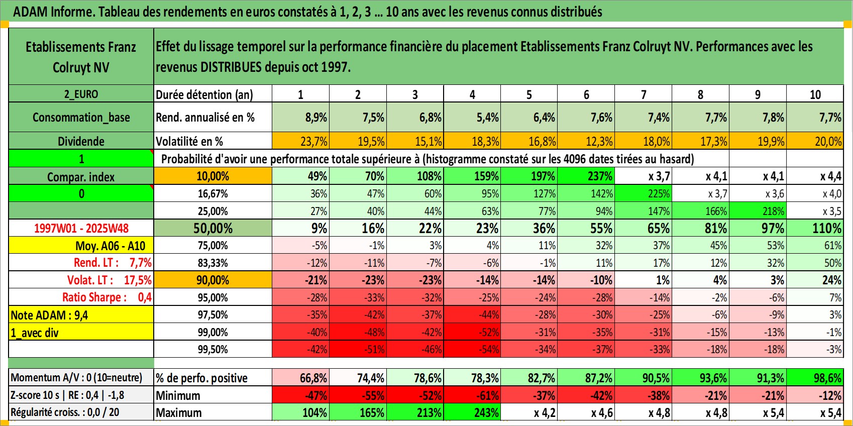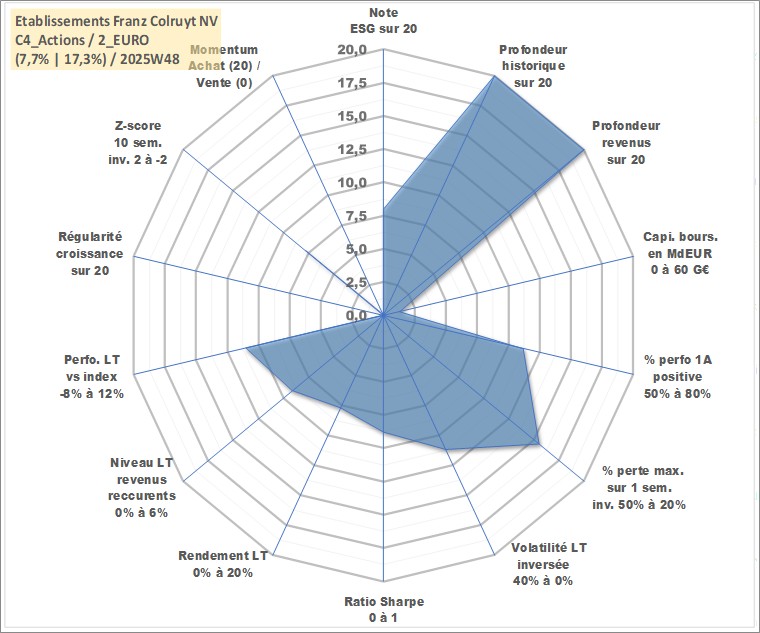 Site dédié aux investisseursPage dédiée sur site financeAnalyse des valorisations hebdomadaires de l'action Etablissements Franz Colruyt NV. Cet actif est cote en EUR. Les valorisations couvrent les semaines 1997W01 a 2025W48. Les revenus de cet actif financier sont pris en compte depuis la semaine 1997W41. La note globale ESG de cet actif est estimee a 8.0 (apres rebasage entre 0 et 20).