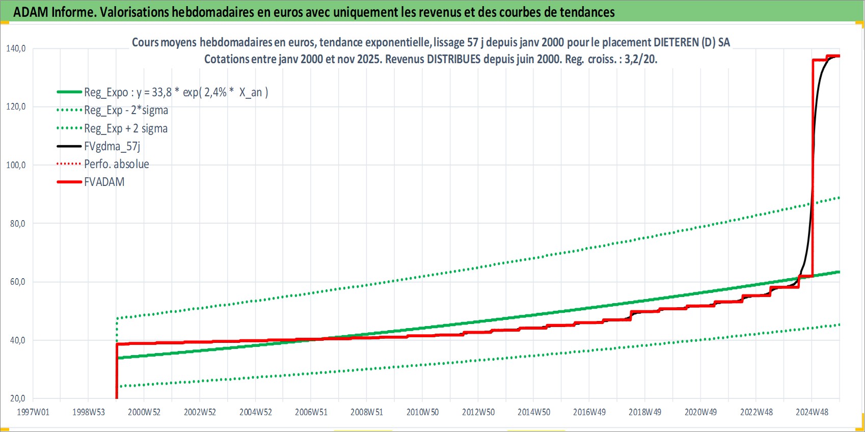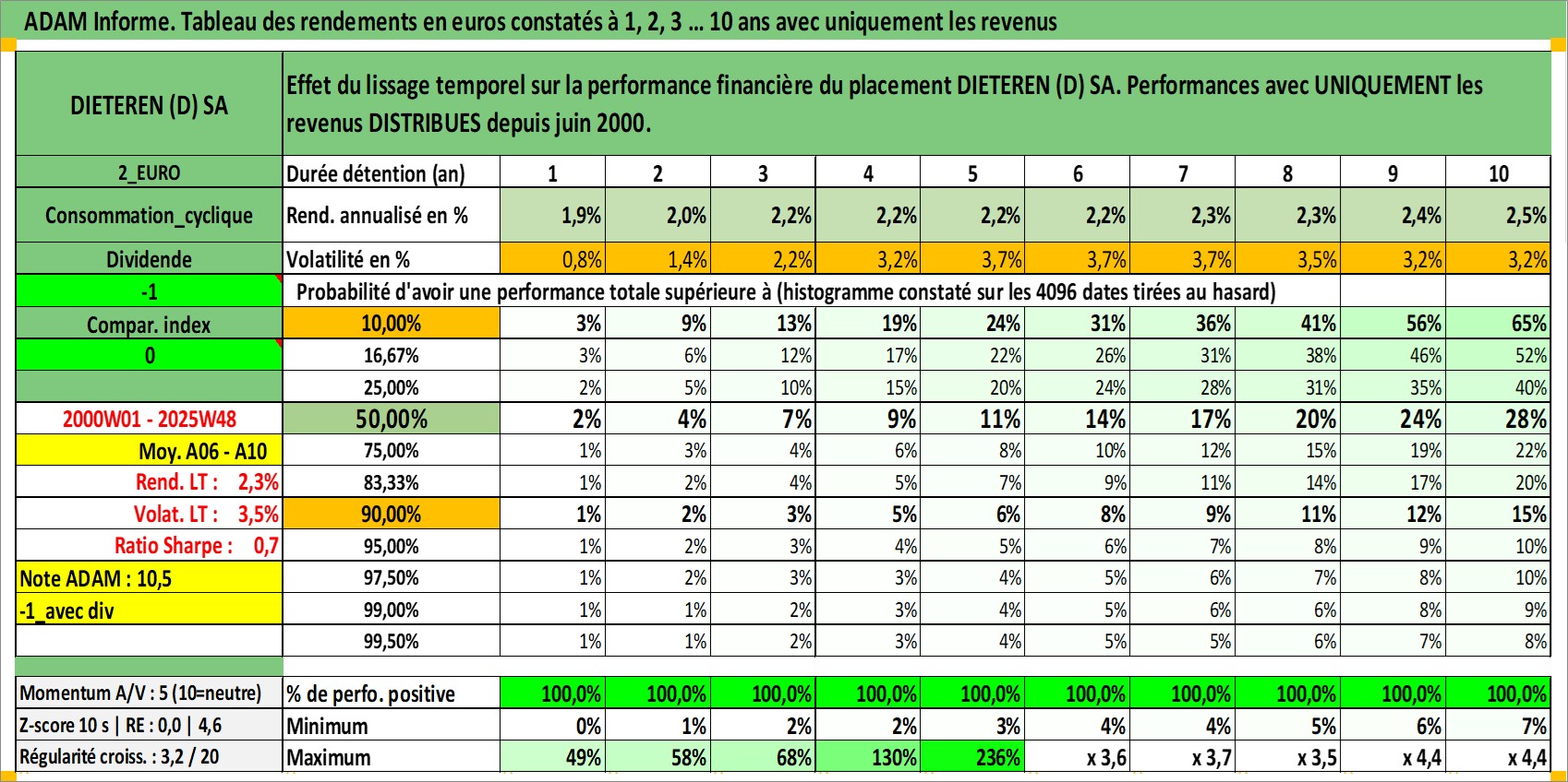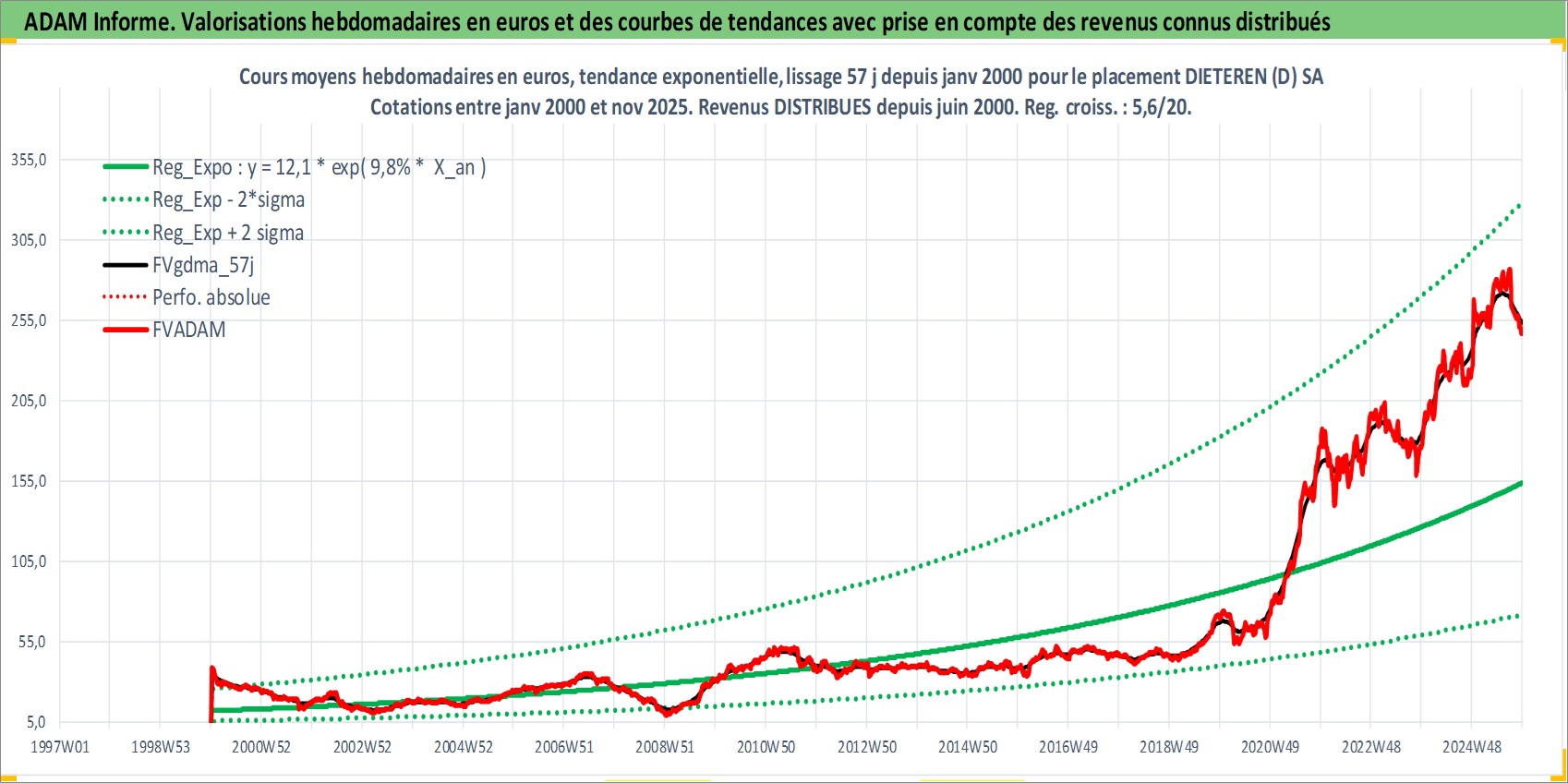 Site dédié aux investisseursPage dédiée sur site financeAnalyse des valorisations hebdomadaires de l'action DIETEREN (D) SA. Cet actif est cote en EUR. Les valorisations couvrent les semaines 2000W01 a 2025W48. Les revenus de cet actif financier sont pris en compte depuis la semaine 2000W24. La note ESG de cet actif n'est pas connue.