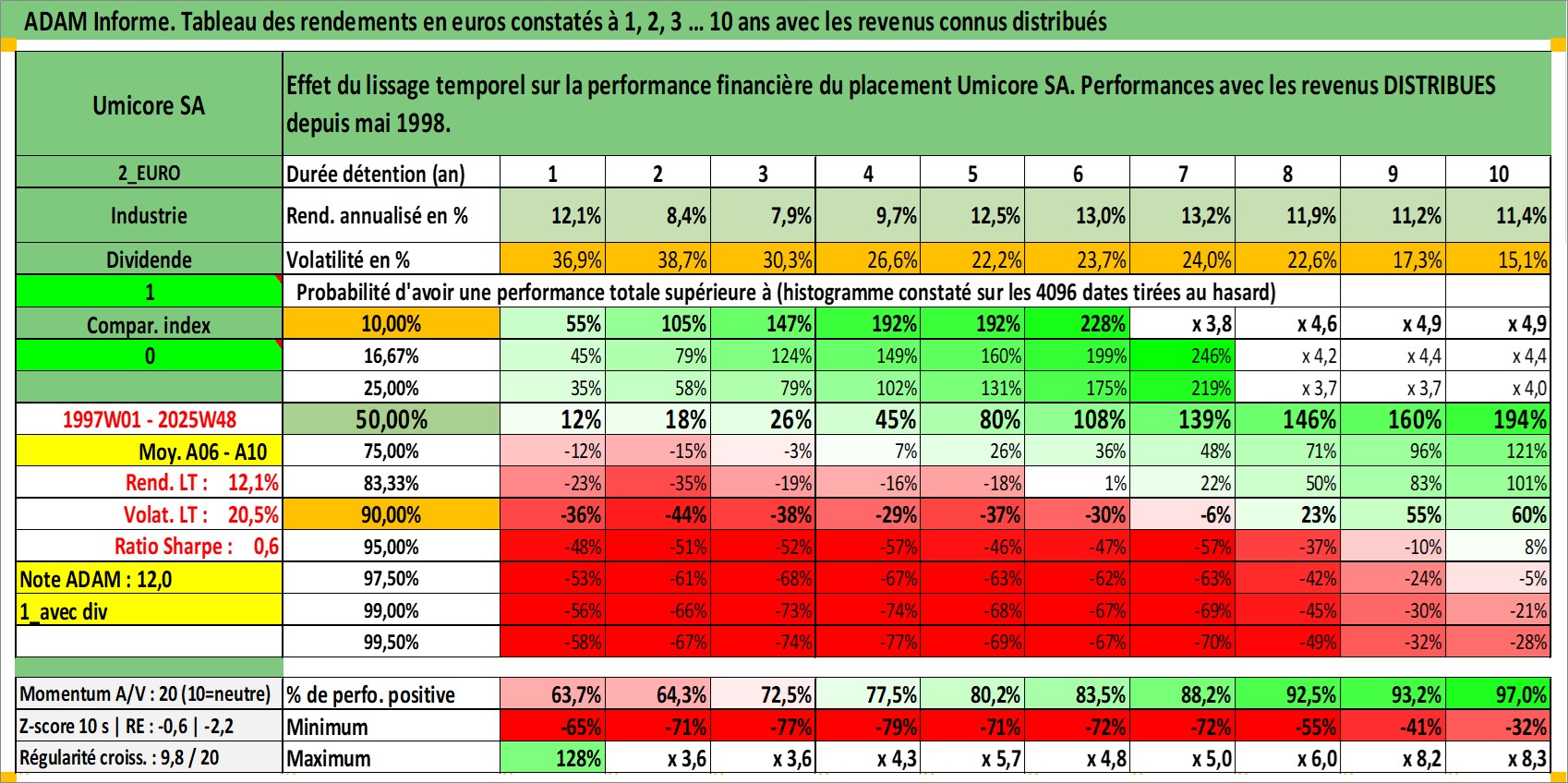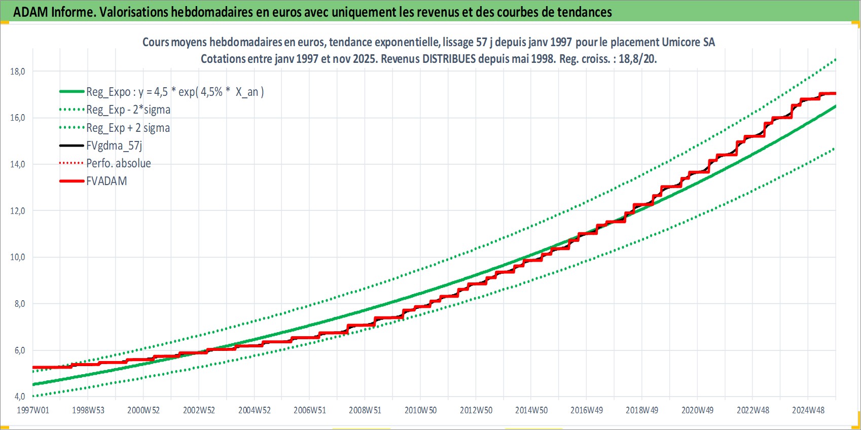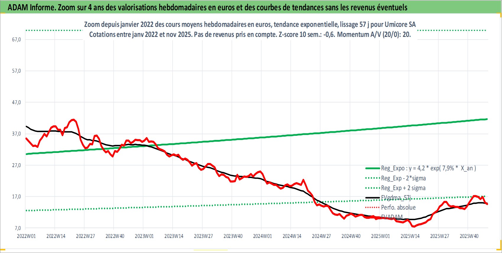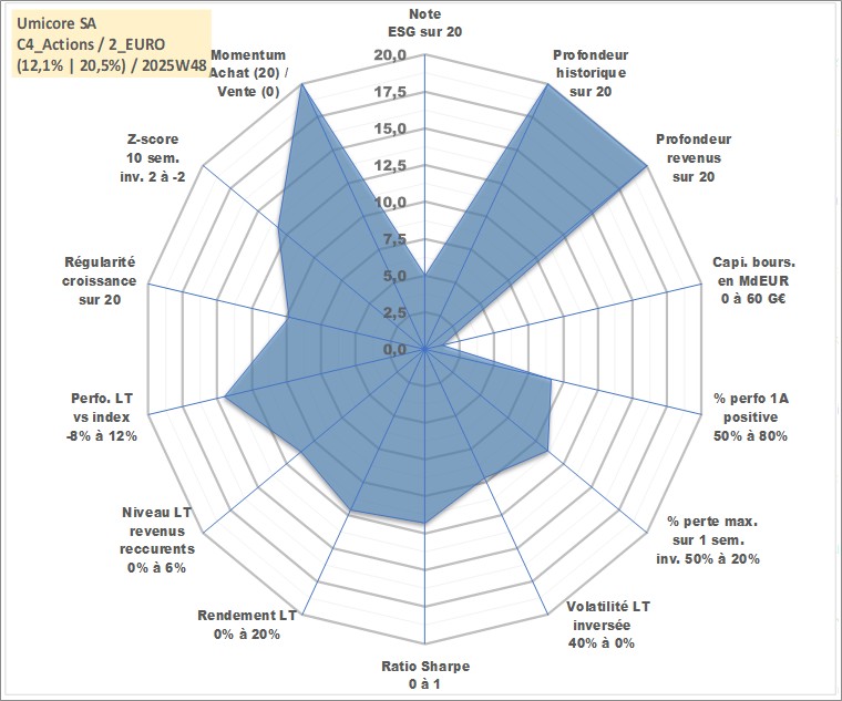 Site dédié aux investisseursPage dédiée sur site financeAnalyse des valorisations hebdomadaires de l'action Umicore SA. Cet actif est cote en EUR. Les valorisations couvrent les semaines 1997W01 a 2025W48. Les revenus de cet actif financier sont pris en compte depuis la semaine 1998W22. La note globale ESG de cet actif est estimee a 5.0 (apres rebasage entre 0 et 20).