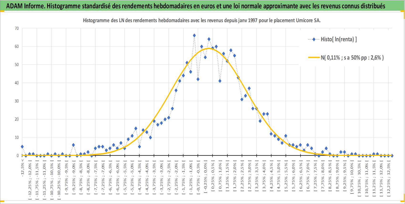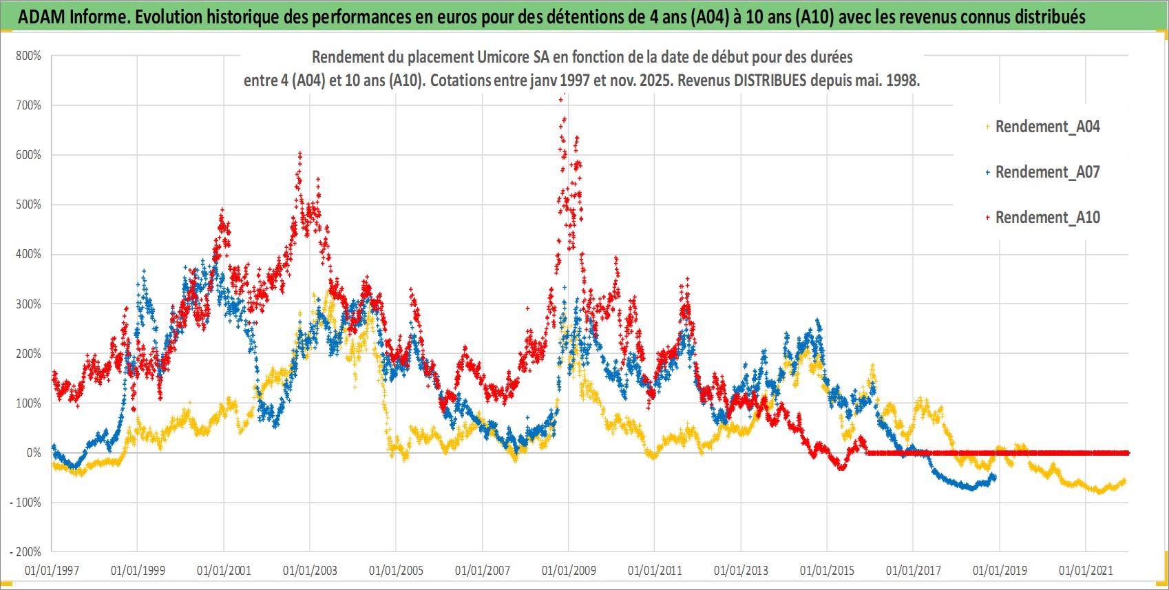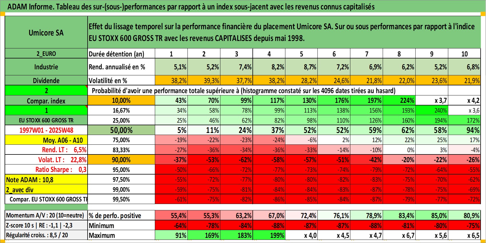 Site dédié aux investisseursPage dédiée sur site financeAnalyse des valorisations hebdomadaires de l'action Umicore SA. Cet actif est cote en EUR. Les valorisations couvrent les semaines 1997W01 a 2025W48. Les revenus de cet actif financier sont pris en compte depuis la semaine 1998W22. La note globale ESG de cet actif est estimee a 5.0 (apres rebasage entre 0 et 20).