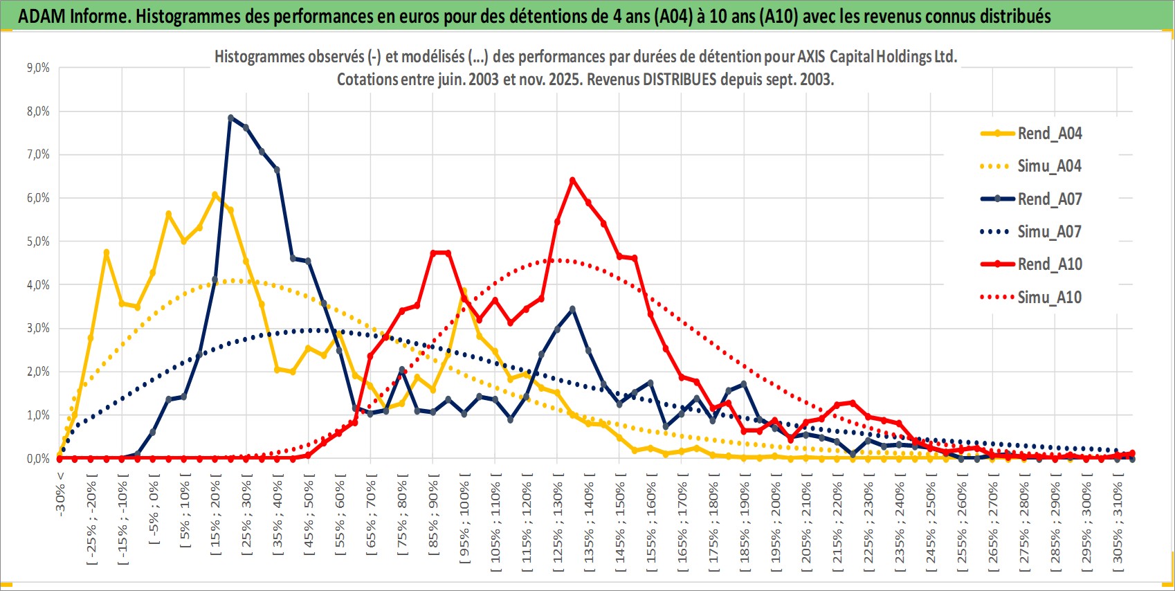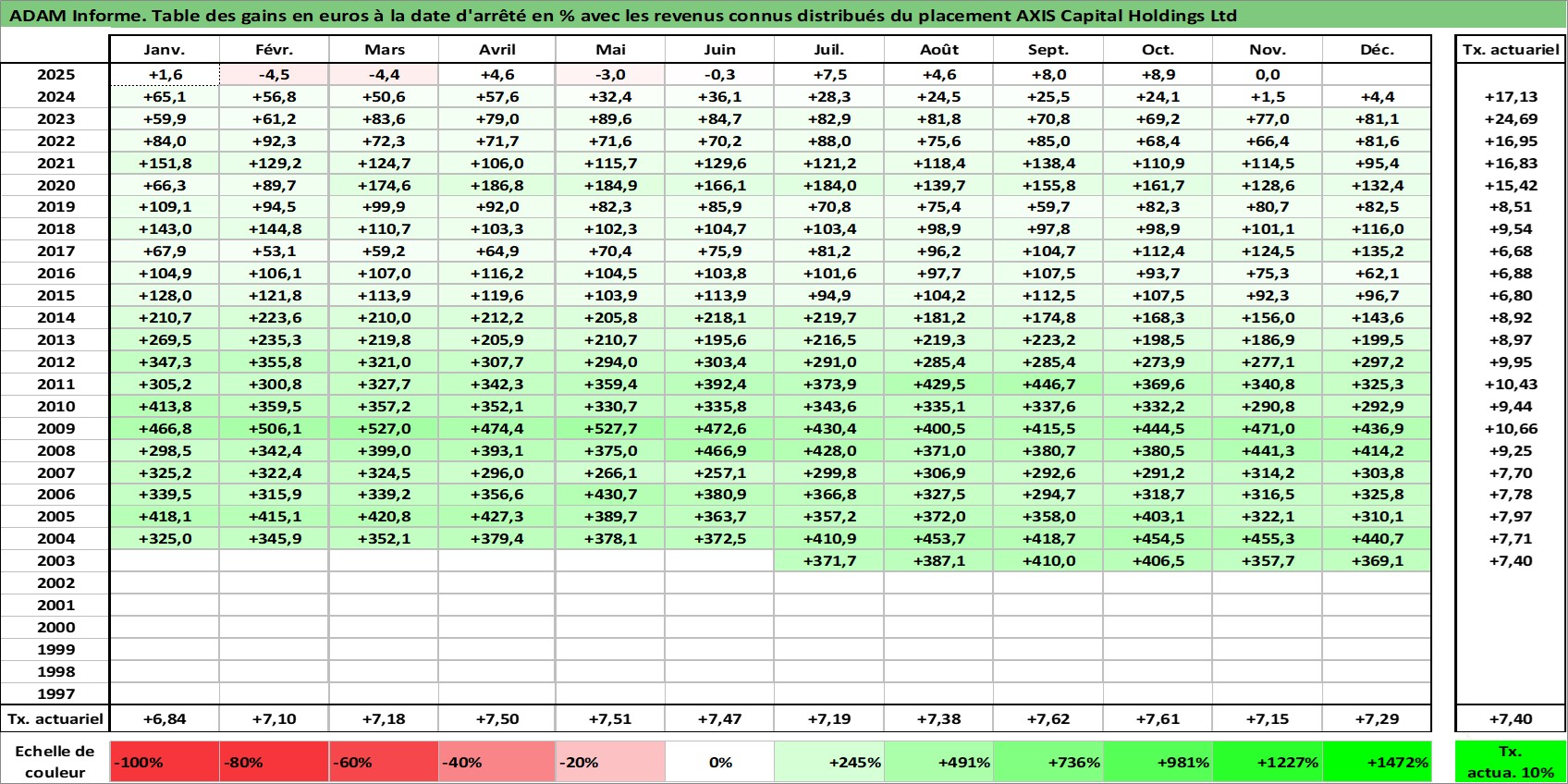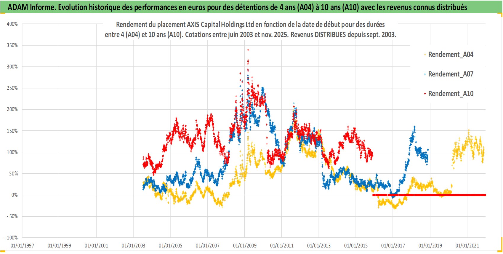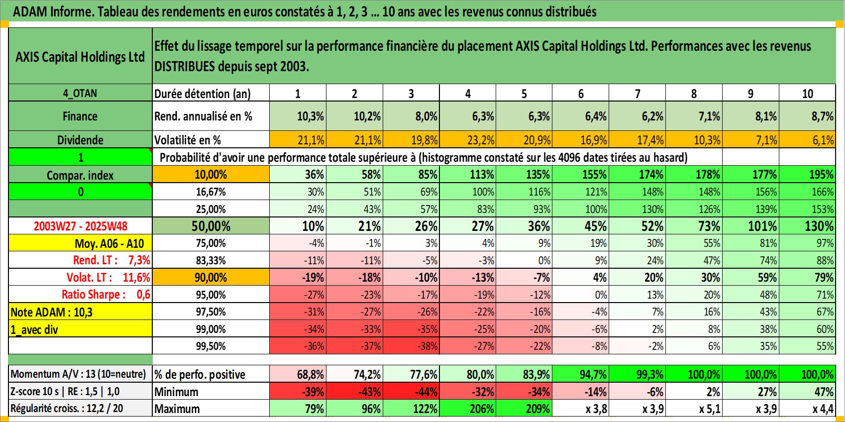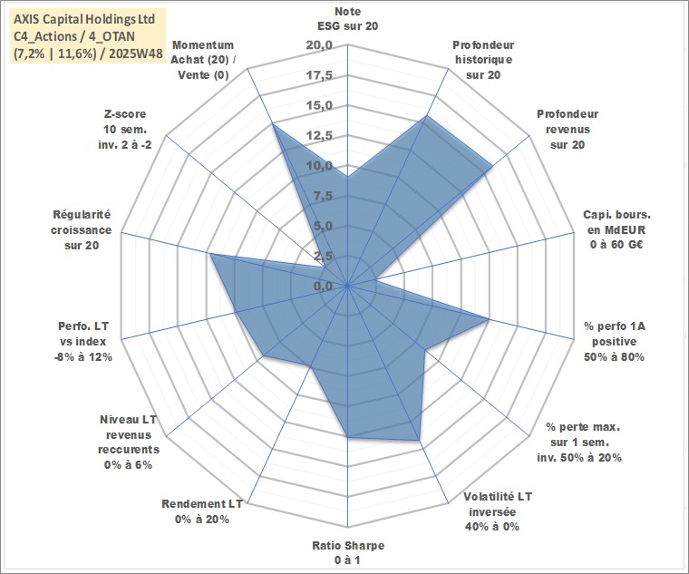 Site dédié aux investisseursPage dédiée sur site financeAnalyse des valorisations hebdomadaires de l'action AXIS Capital Holdings Ltd. Cet actif est cote en USD. Les valorisations sont en contrevaleur EURO et couvrent les semaines 2003W27 a 2025W48. Les revenus de cet actif financier sont pris en compte depuis la semaine 2003W39. La note globale ESG de cet actif est estimee a 9.0 (apres rebasage entre 0 et 20).