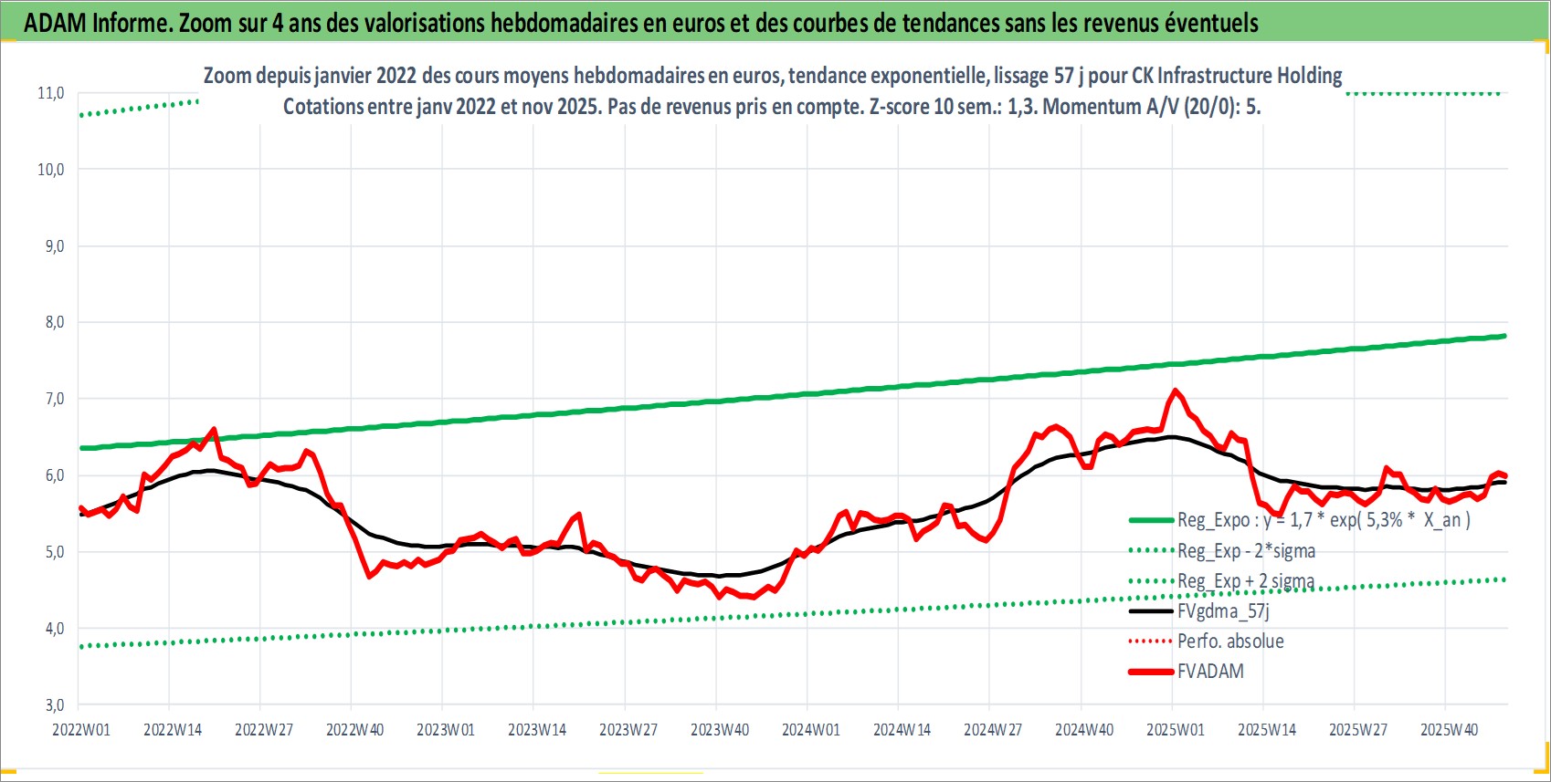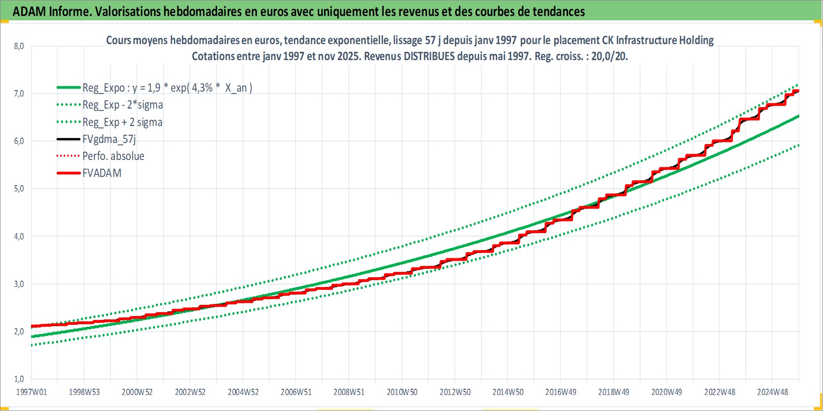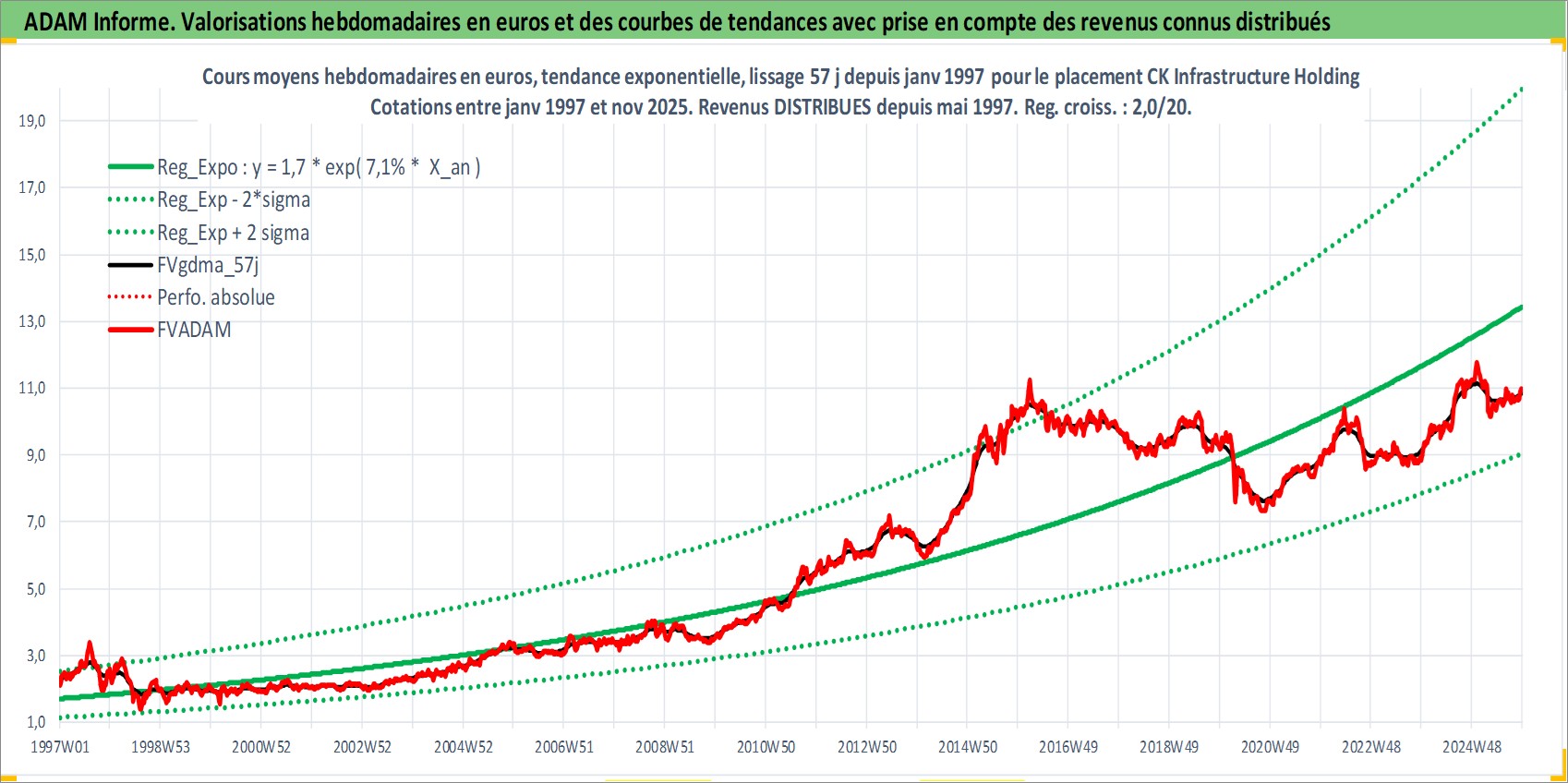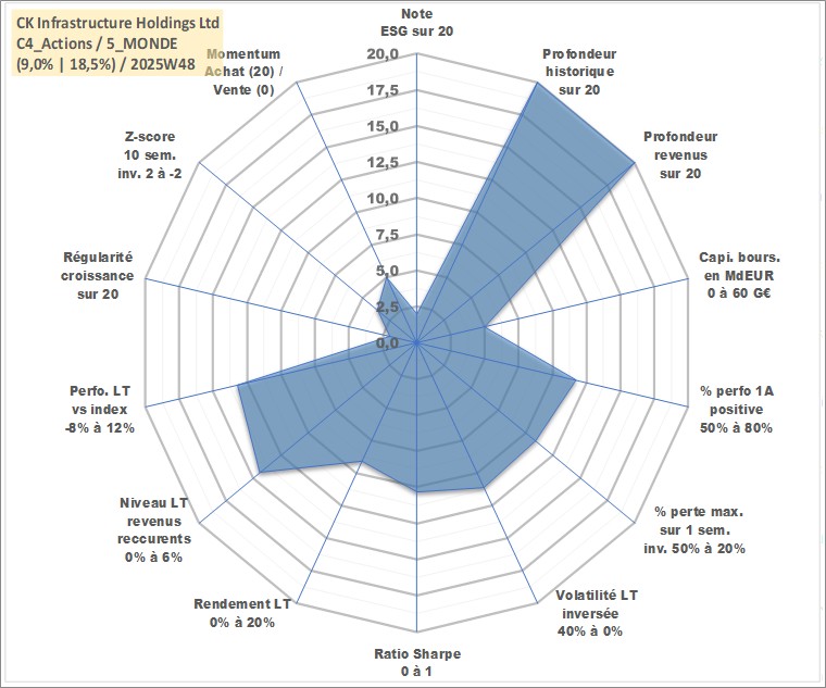 Site dédié aux investisseursPage dédiée sur site financeAnalyse des valorisations hebdomadaires de l'action CK Infrastructure Holdings Ltd. Cet actif est cote en HKD. Les valorisations sont en contrevaleur EURO et couvrent les semaines 1997W01 a 2025W48. Les revenus de cet actif financier sont pris en compte depuis la semaine 1997W19. La note globale ESG de cet actif est estimee a 2.0 (apres rebasage entre 0 et 20).