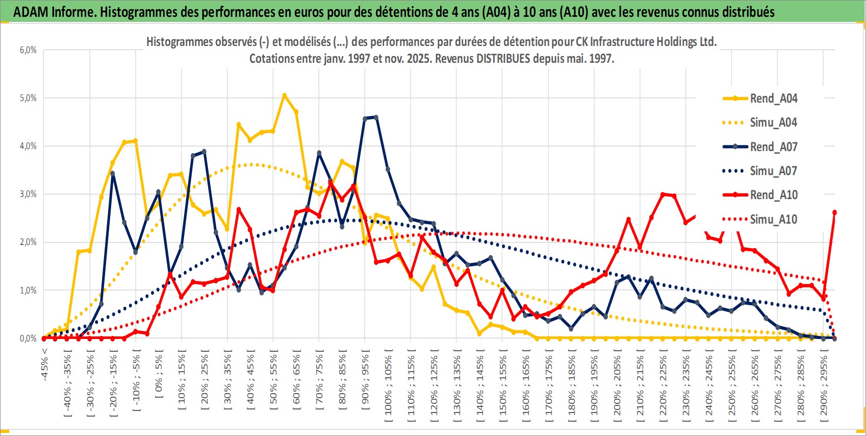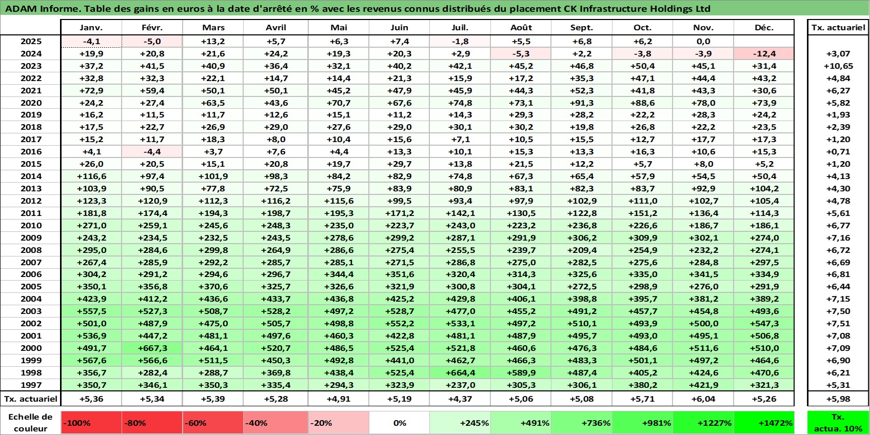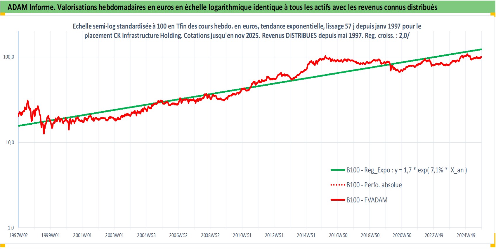 Site dédié aux investisseursPage dédiée sur site financeAnalyse des valorisations hebdomadaires de l'action CK Infrastructure Holdings Ltd. Cet actif est cote en HKD. Les valorisations sont en contrevaleur EURO et couvrent les semaines 1997W01 a 2025W48. Les revenus de cet actif financier sont pris en compte depuis la semaine 1997W19. La note globale ESG de cet actif est estimee a 2.0 (apres rebasage entre 0 et 20).