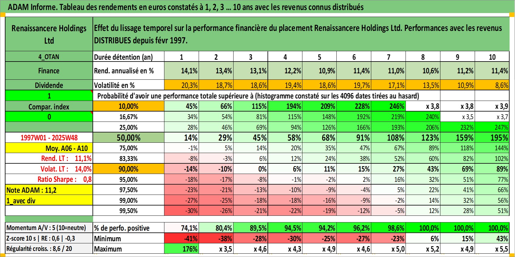 Site dédié aux investisseursPage dédiée sur site financeAnalyse des valorisations hebdomadaires de l'action Renaissancere Holdings Ltd. Cet actif est cote en USD. Les valorisations sont en contrevaleur EURO et couvrent les semaines 1997W01 a 2025W48. Les revenus de cet actif financier sont pris en compte depuis la semaine 1997W07. La note globale ESG de cet actif est estimee a 7.0 (apres rebasage entre 0 et 20).