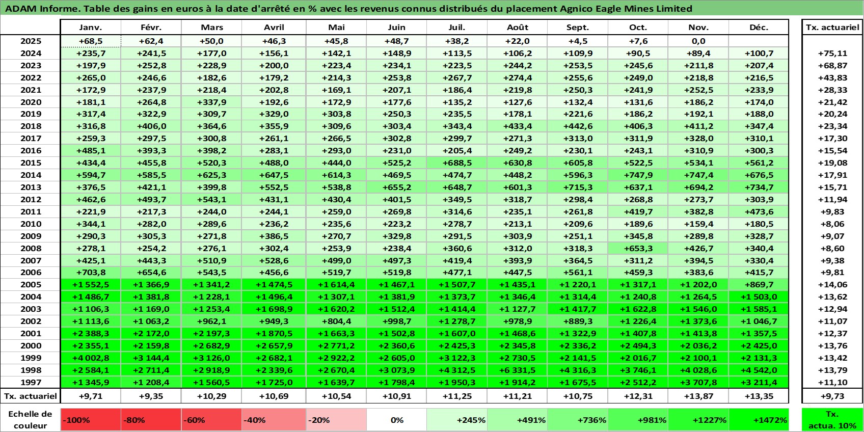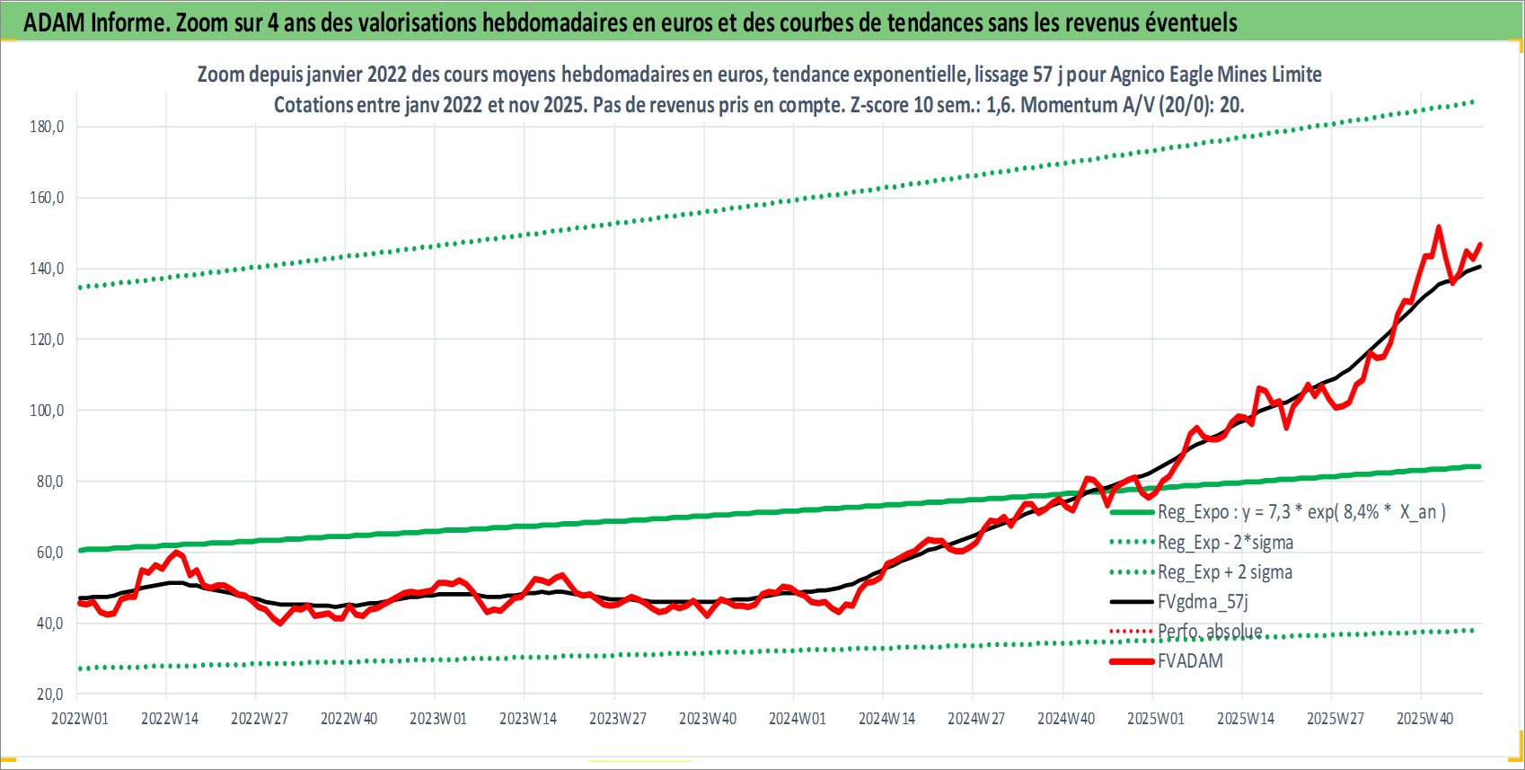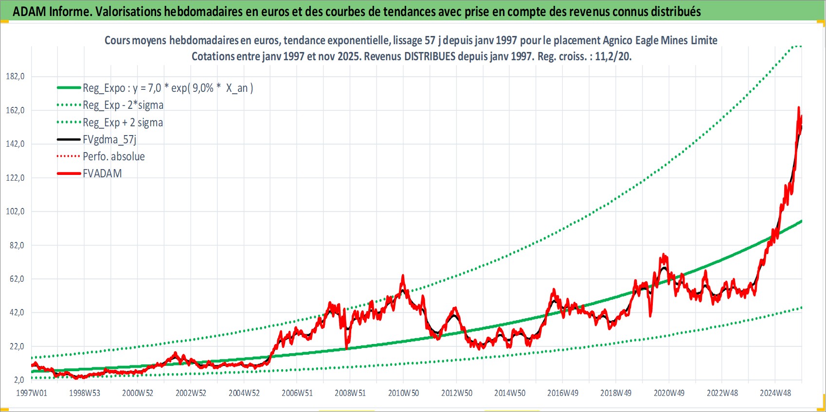 Site dédié aux investisseursPage dédiée sur site financeAnalyse des valorisations hebdomadaires de l'action Agnico Eagle Mines Limited. Cet actif est cote en CAD. Les valorisations sont en contrevaleur EURO et couvrent les semaines 1997W01 a 2025W48. Les revenus de cet actif financier sont pris en compte depuis la semaine 1997W01. La note globale ESG de cet actif est estimee a 9.0 (apres rebasage entre 0 et 20).