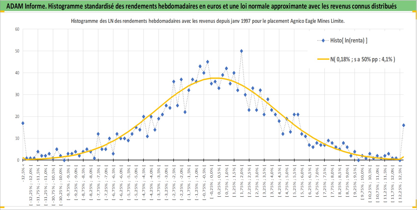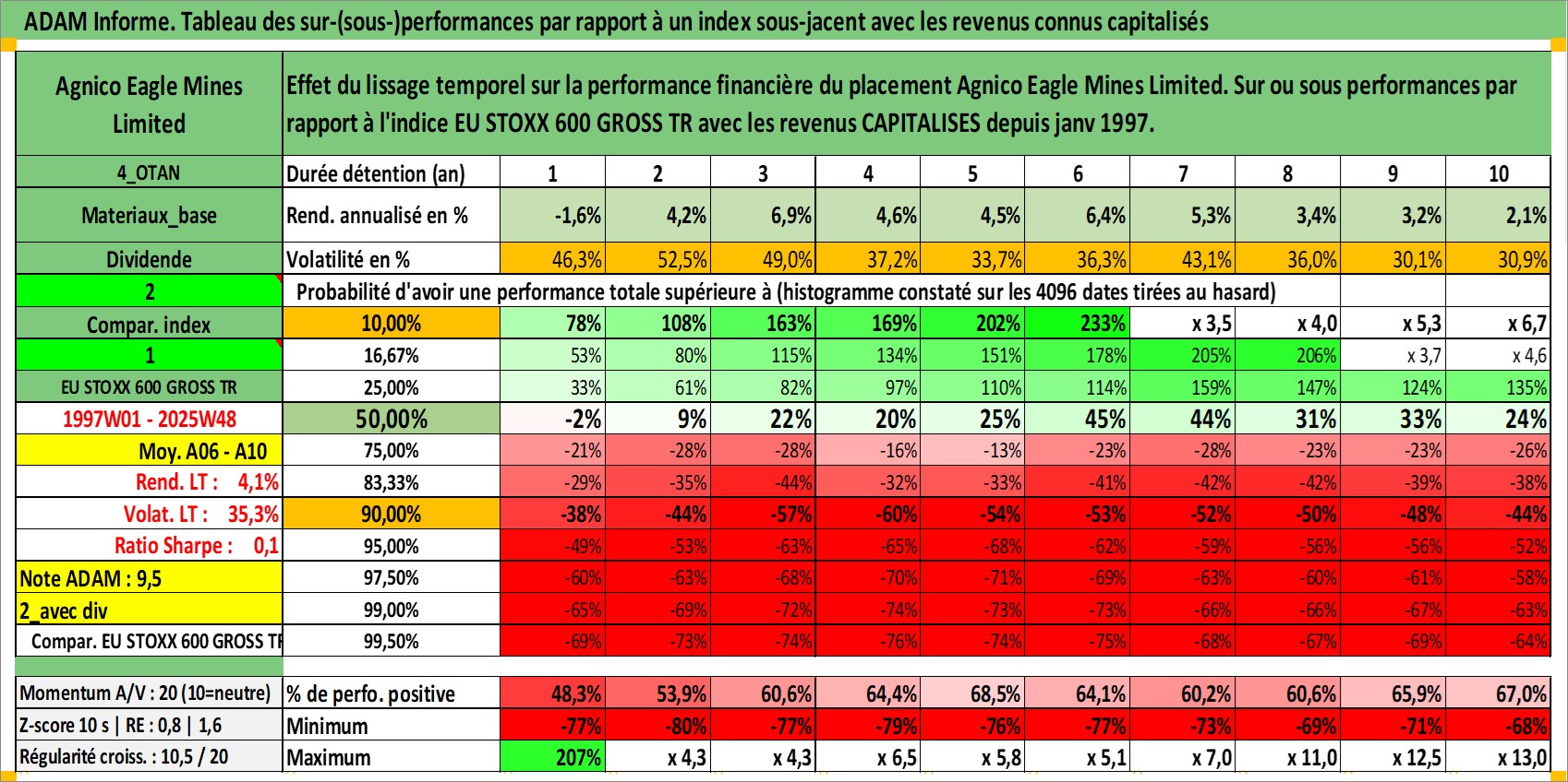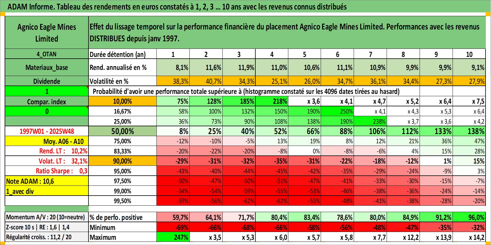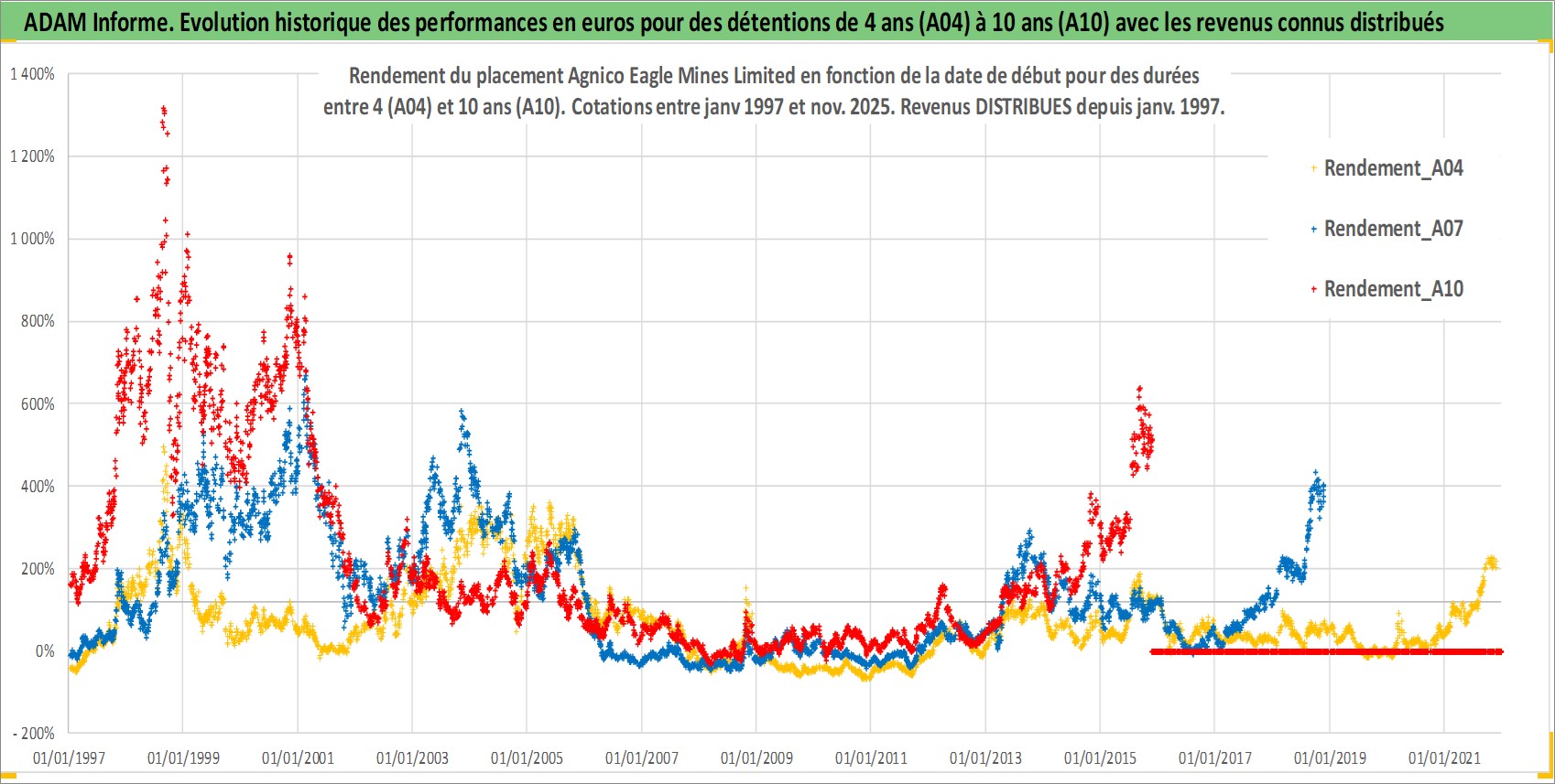 Site dédié aux investisseursPage dédiée sur site financeAnalyse des valorisations hebdomadaires de l'action Agnico Eagle Mines Limited. Cet actif est cote en CAD. Les valorisations sont en contrevaleur EURO et couvrent les semaines 1997W01 a 2025W48. Les revenus de cet actif financier sont pris en compte depuis la semaine 1997W01. La note globale ESG de cet actif est estimee a 9.0 (apres rebasage entre 0 et 20).