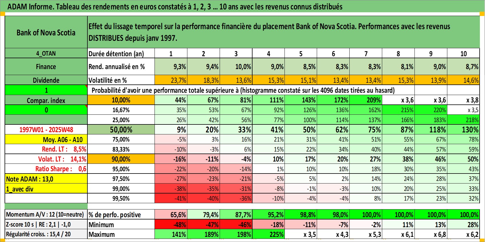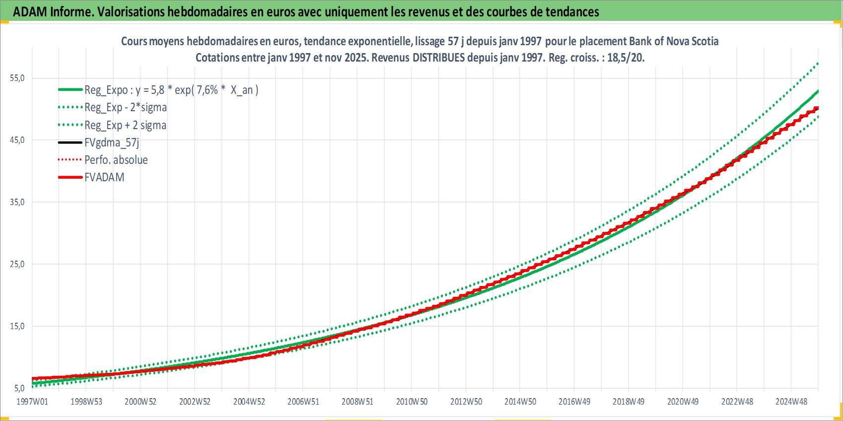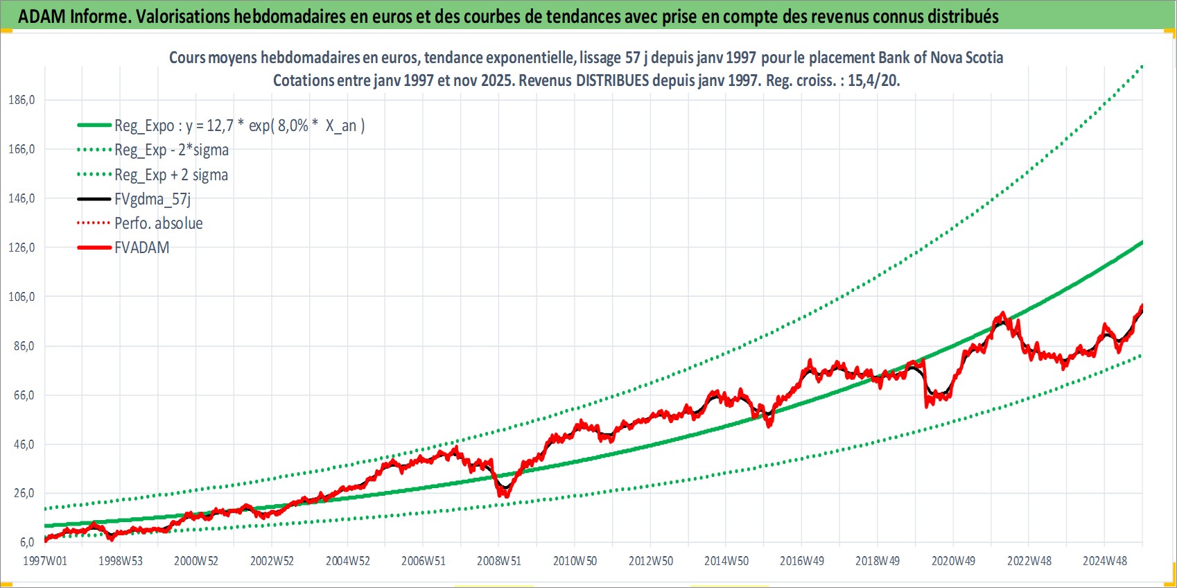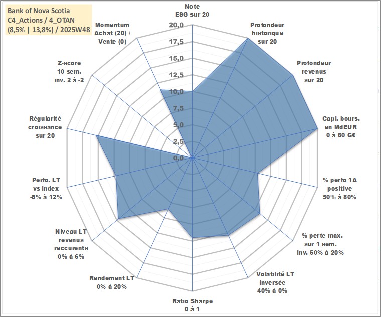 Site dédié aux investisseursPage dédiée sur site financeAnalyse des valorisations hebdomadaires de l'action Bank of Nova Scotia. Cet actif est cote en CAD. Les valorisations sont en contrevaleur EURO et couvrent les semaines 1997W01 a 2025W48. Les revenus de cet actif financier sont pris en compte depuis la semaine 1997W01. La note globale ESG de cet actif est estimee a 10.0 (apres rebasage entre 0 et 20).