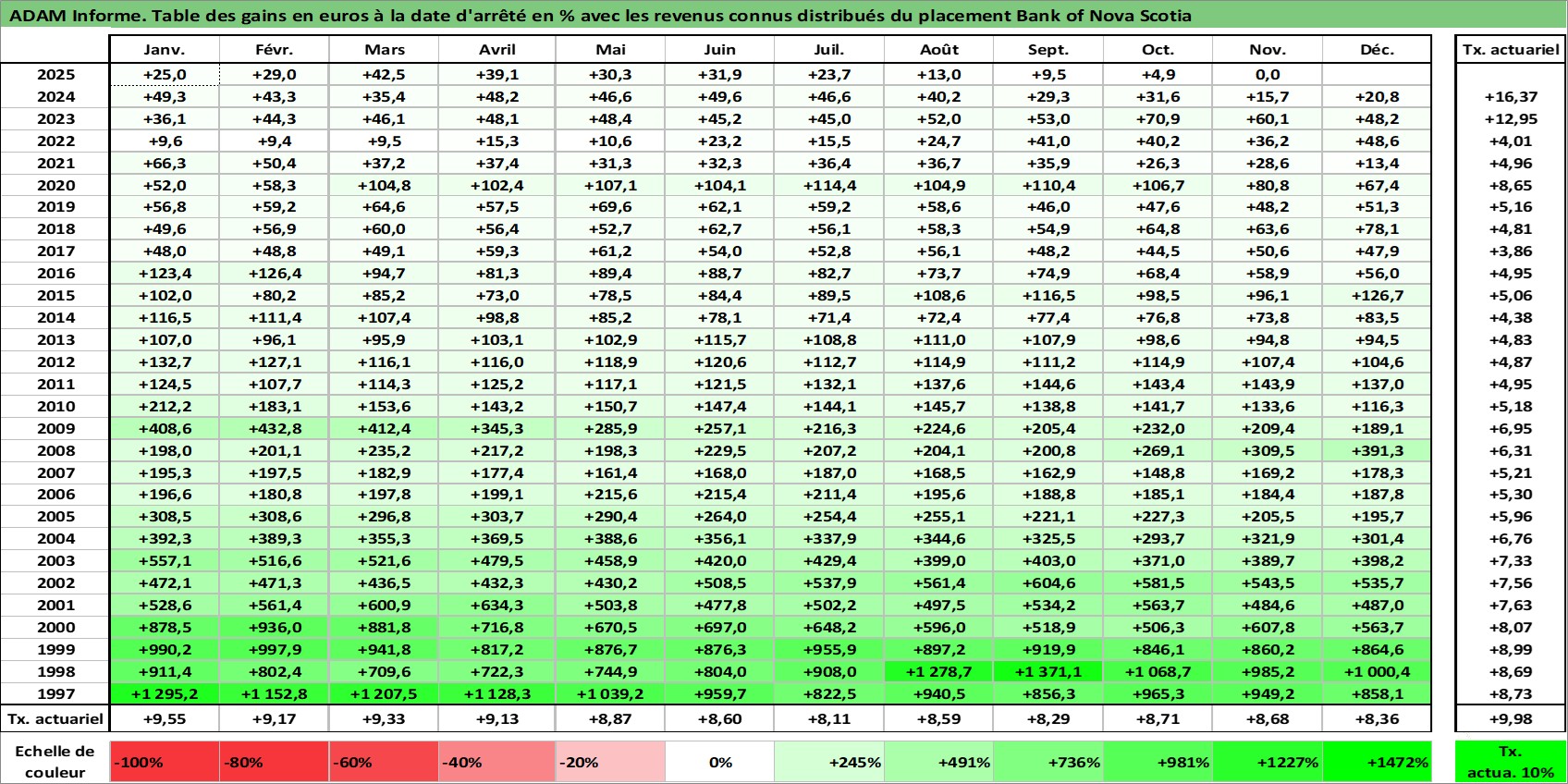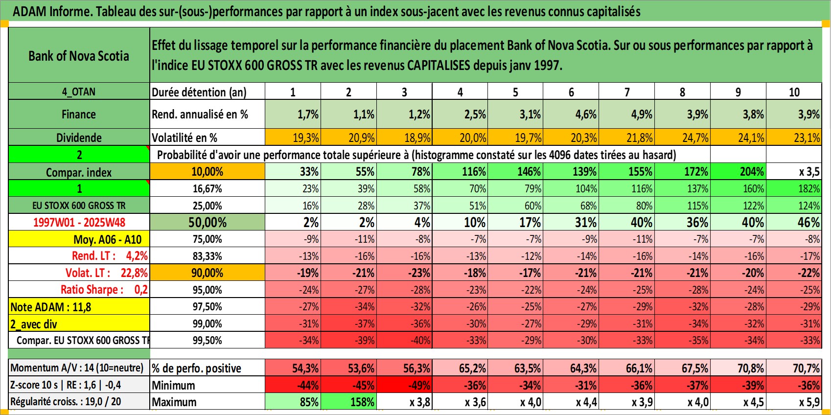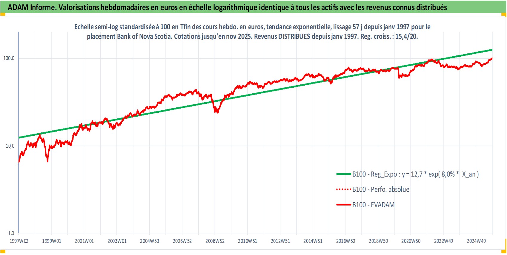 Site dédié aux investisseursPage dédiée sur site financeAnalyse des valorisations hebdomadaires de l'action Bank of Nova Scotia. Cet actif est cote en CAD. Les valorisations sont en contrevaleur EURO et couvrent les semaines 1997W01 a 2025W48. Les revenus de cet actif financier sont pris en compte depuis la semaine 1997W01. La note globale ESG de cet actif est estimee a 10.0 (apres rebasage entre 0 et 20).