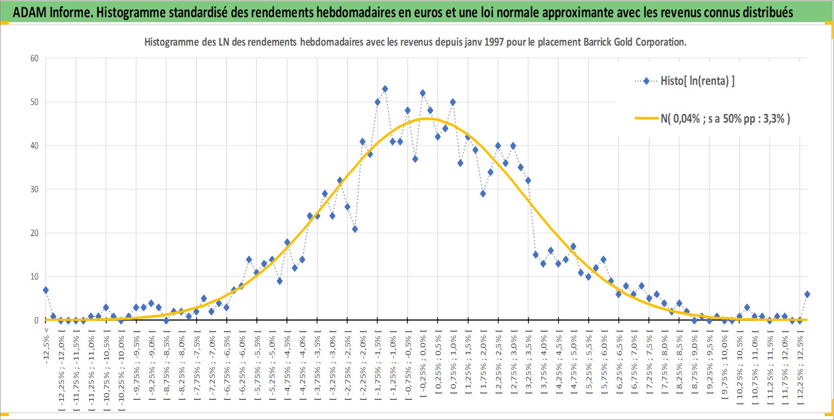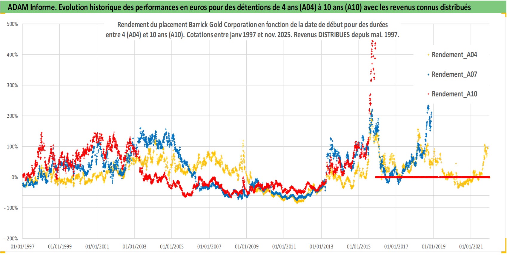 Site dédié aux investisseursPage dédiée sur site financeAnalyse des valorisations hebdomadaires de l'action Barrick Gold Corporation. Cet actif est cote en CAD. Les valorisations sont en contrevaleur EURO et couvrent les semaines 1997W01 a 2025W48. Les revenus de cet actif financier sont pris en compte depuis la semaine 1997W22. La note globale ESG de cet actif est estimee a 4.0 (apres rebasage entre 0 et 20).