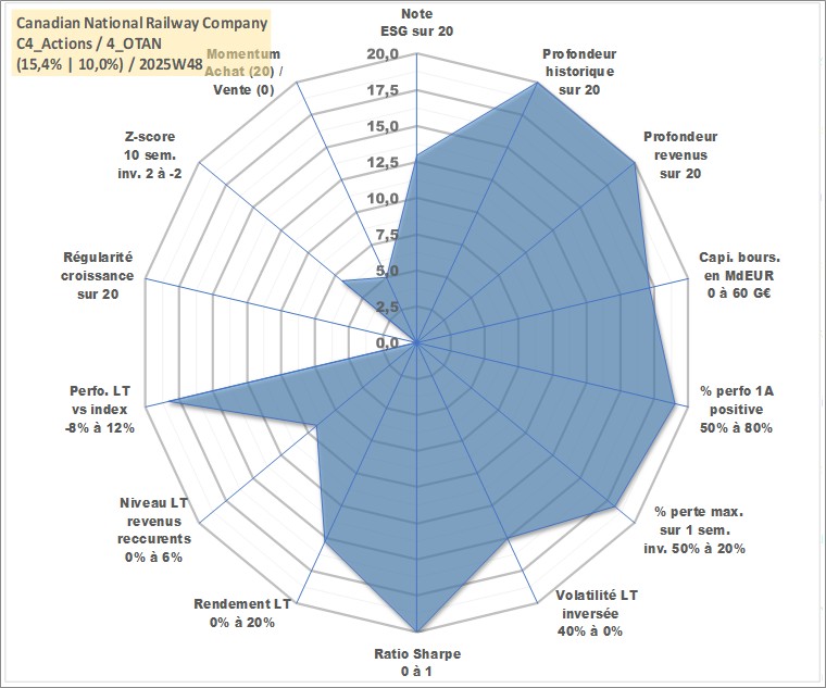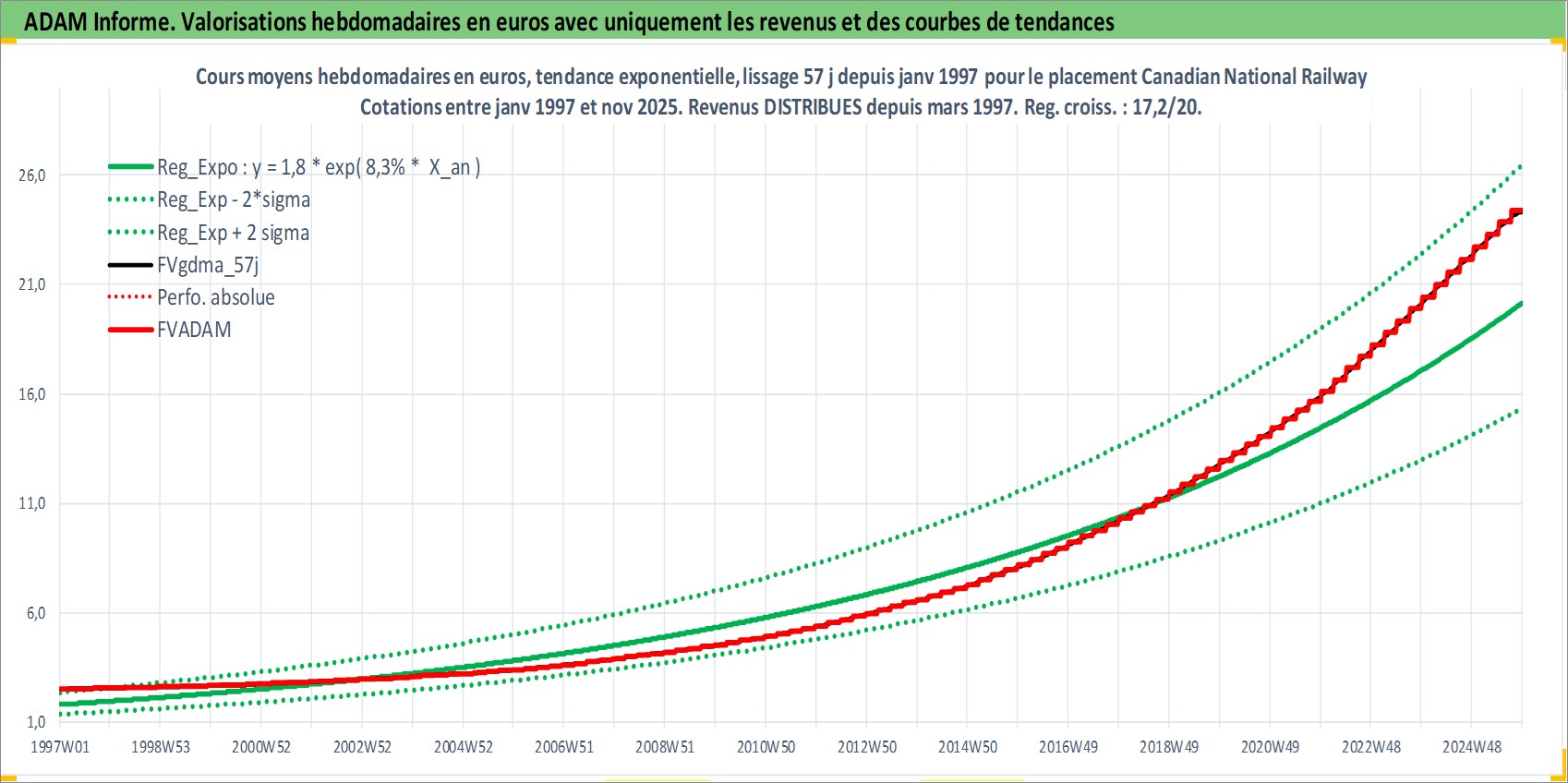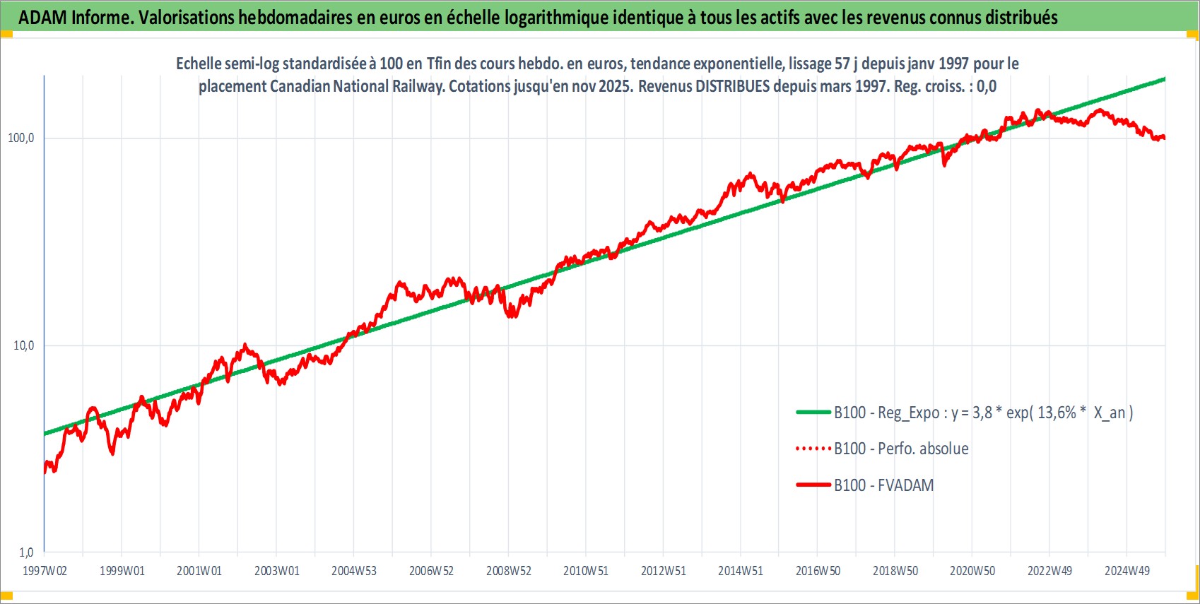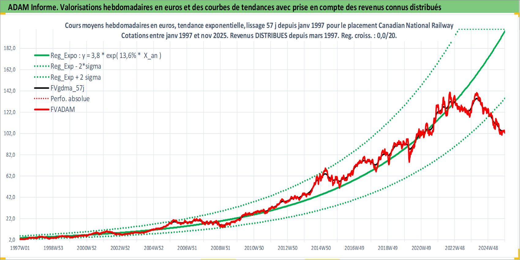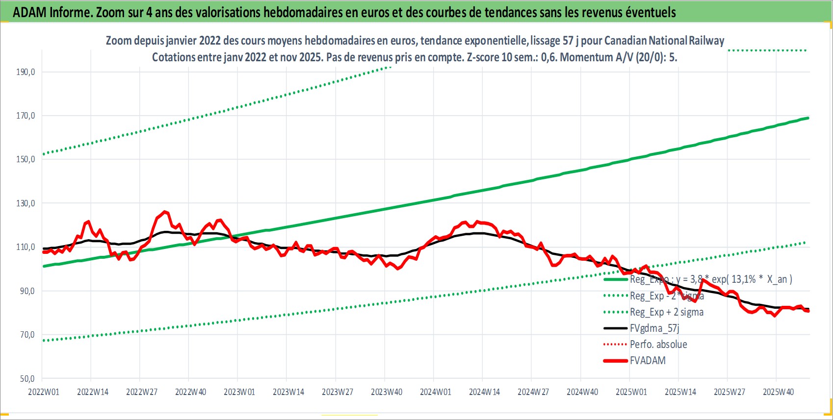 Site dédié aux investisseursPage dédiée sur site financeAnalyse des valorisations hebdomadaires de l'action Canadian National Railway Company. Cet actif est cote en CAD. Les valorisations sont en contrevaleur EURO et couvrent les semaines 1997W01 a 2025W48. Les revenus de cet actif financier sont pris en compte depuis la semaine 1997W10. La note globale ESG de cet actif est estimee a 13.0 (apres rebasage entre 0 et 20).