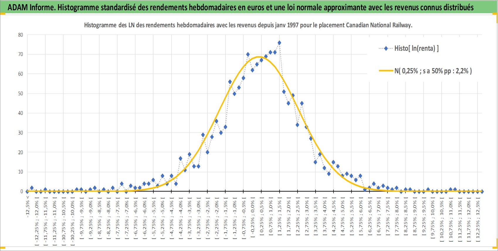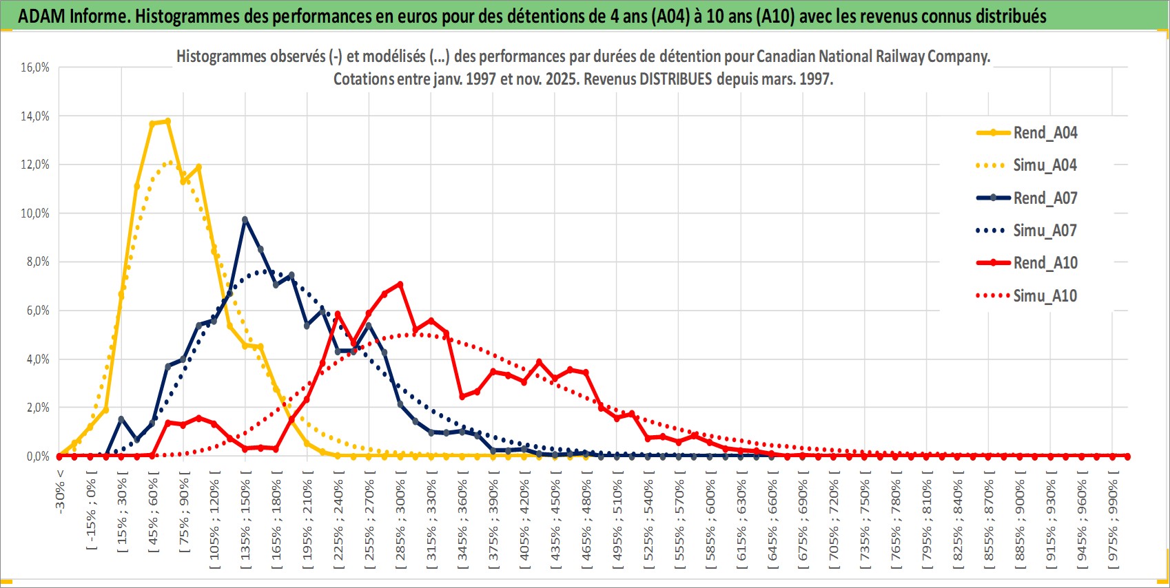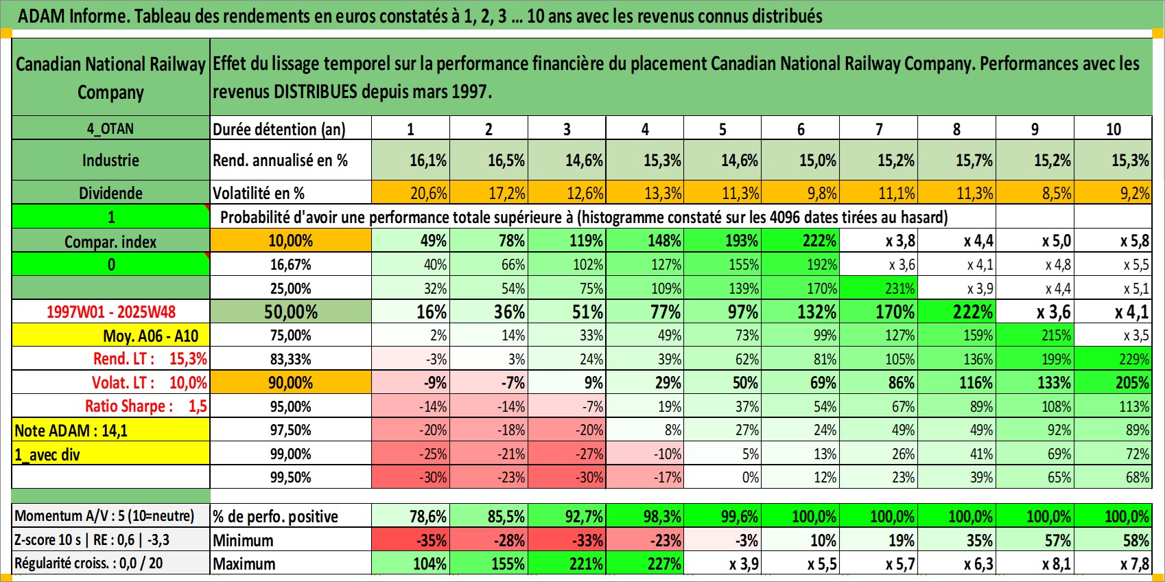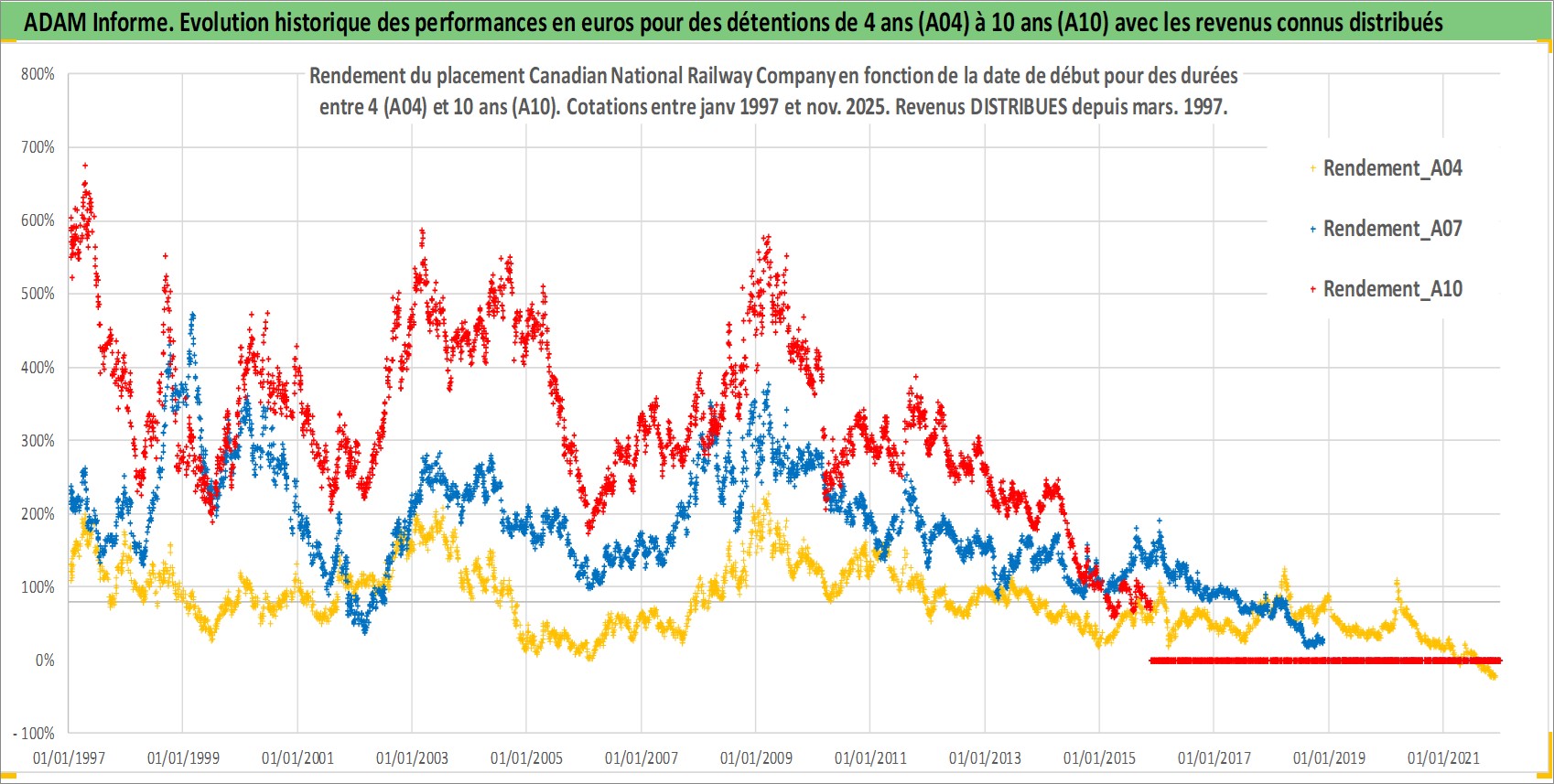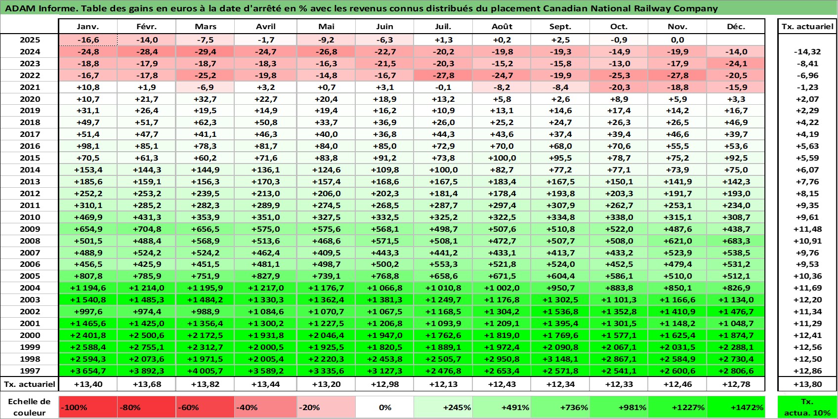 Site dédié aux investisseursPage dédiée sur site financeAnalyse des valorisations hebdomadaires de l'action Canadian National Railway Company. Cet actif est cote en CAD. Les valorisations sont en contrevaleur EURO et couvrent les semaines 1997W01 a 2025W48. Les revenus de cet actif financier sont pris en compte depuis la semaine 1997W10. La note globale ESG de cet actif est estimee a 13.0 (apres rebasage entre 0 et 20).