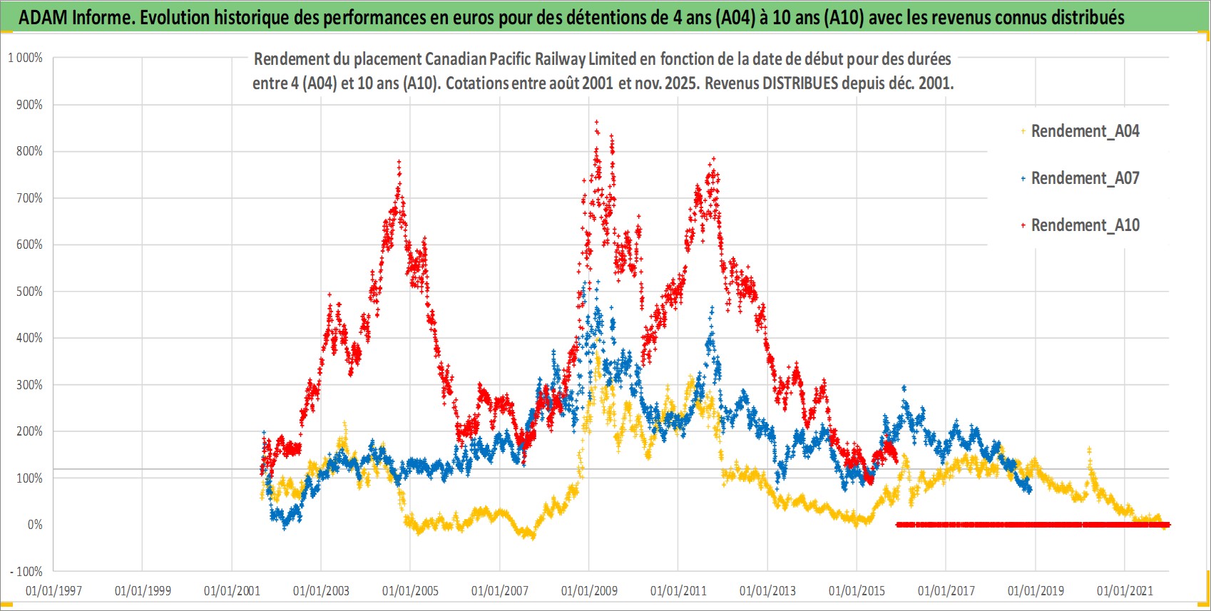 Site dédié aux investisseursPage dédiée sur site financeAnalyse des valorisations hebdomadaires de l'action Canadian Pacific Railway Limited. Cet actif est cote en CAD. Les valorisations sont en contrevaleur EURO et couvrent les semaines 2001W34 a 2025W48. Les revenus de cet actif financier sont pris en compte depuis la semaine 2001W51. La note globale ESG de cet actif est estimee a 12.0 (apres rebasage entre 0 et 20).