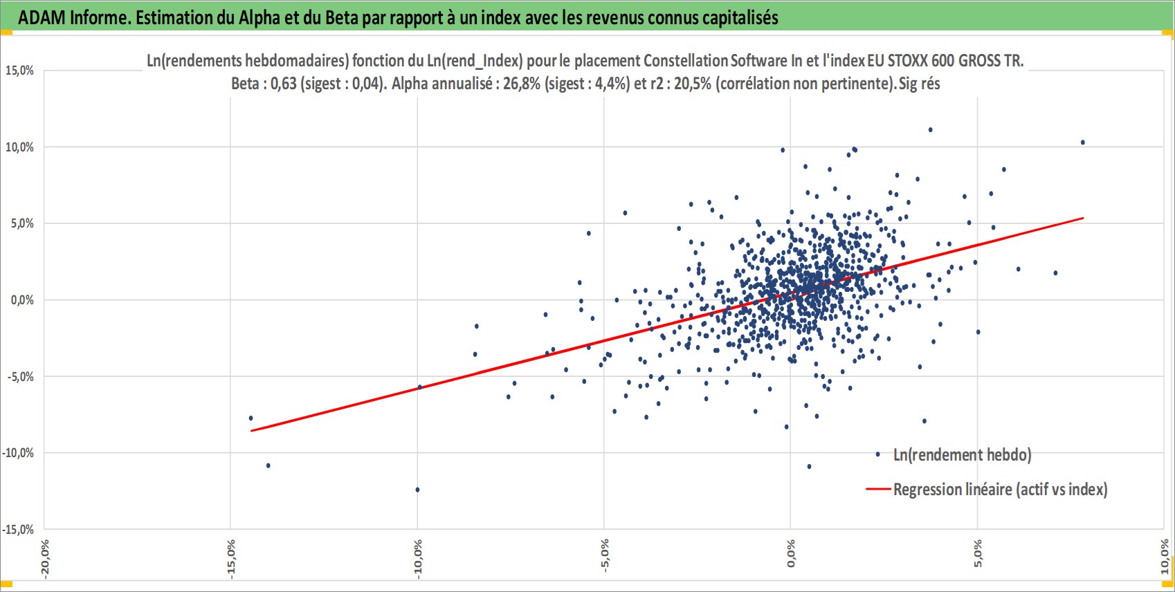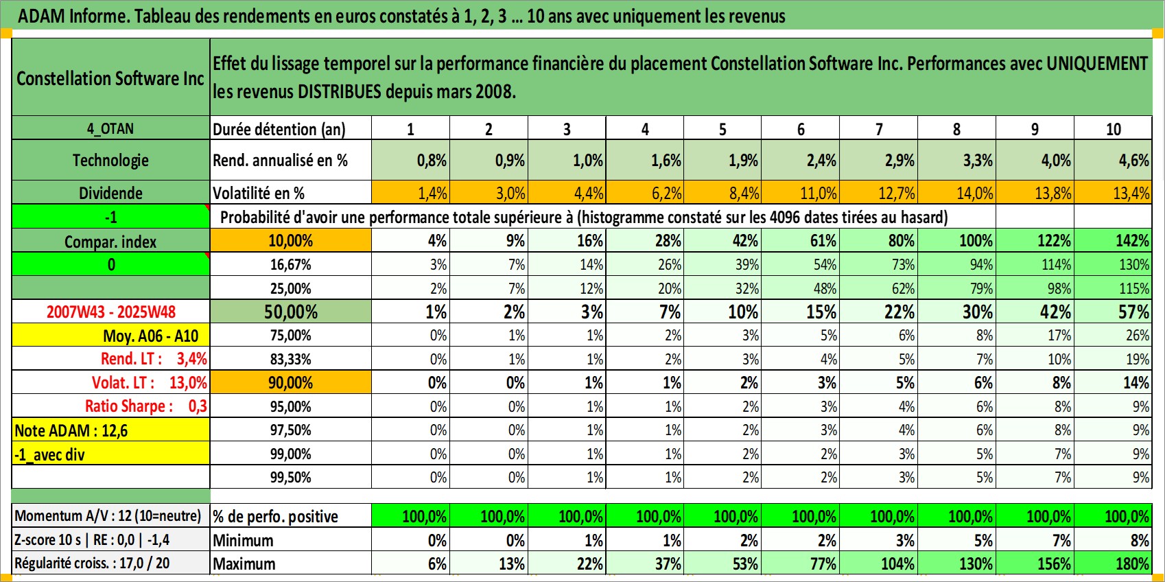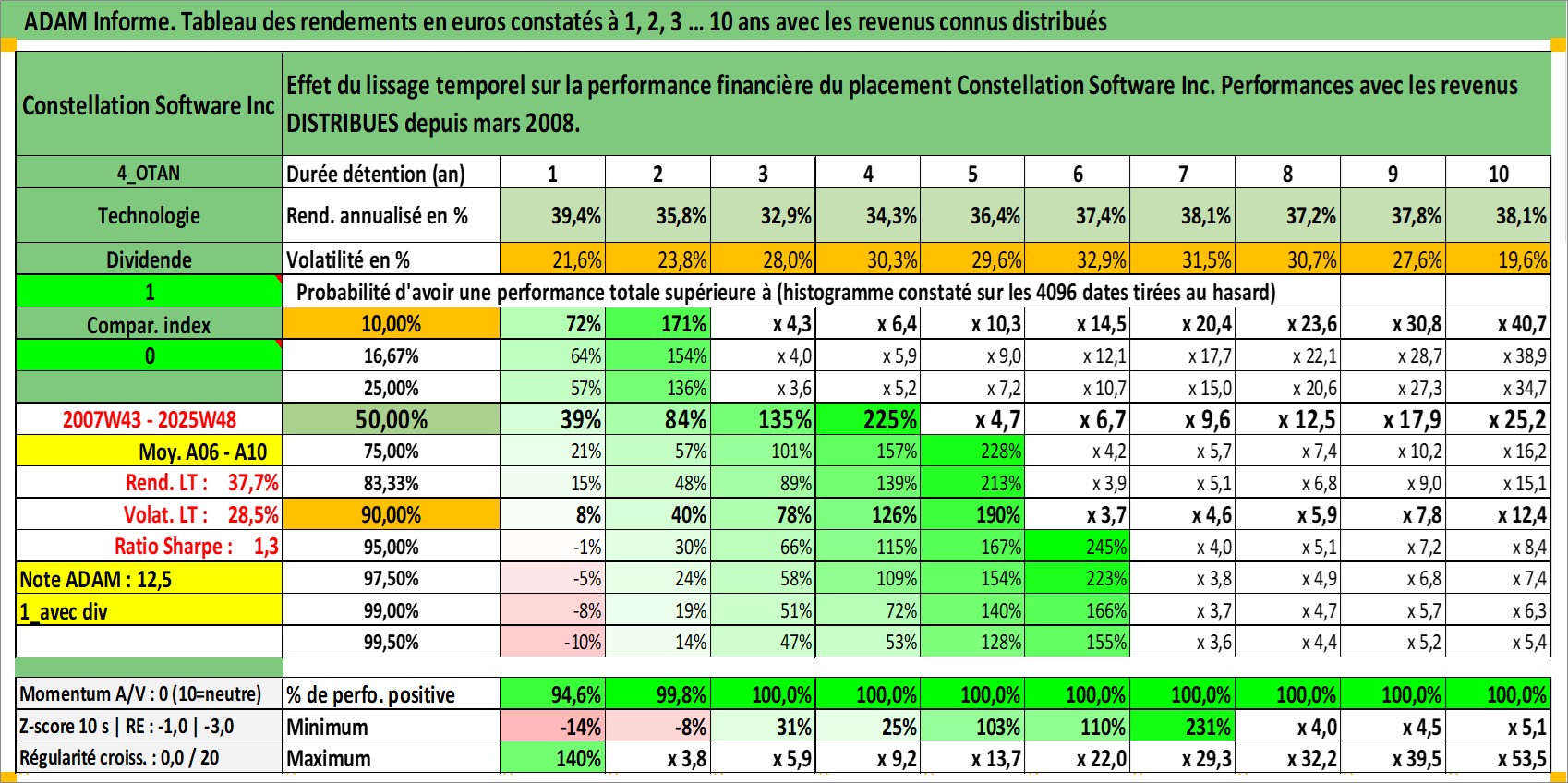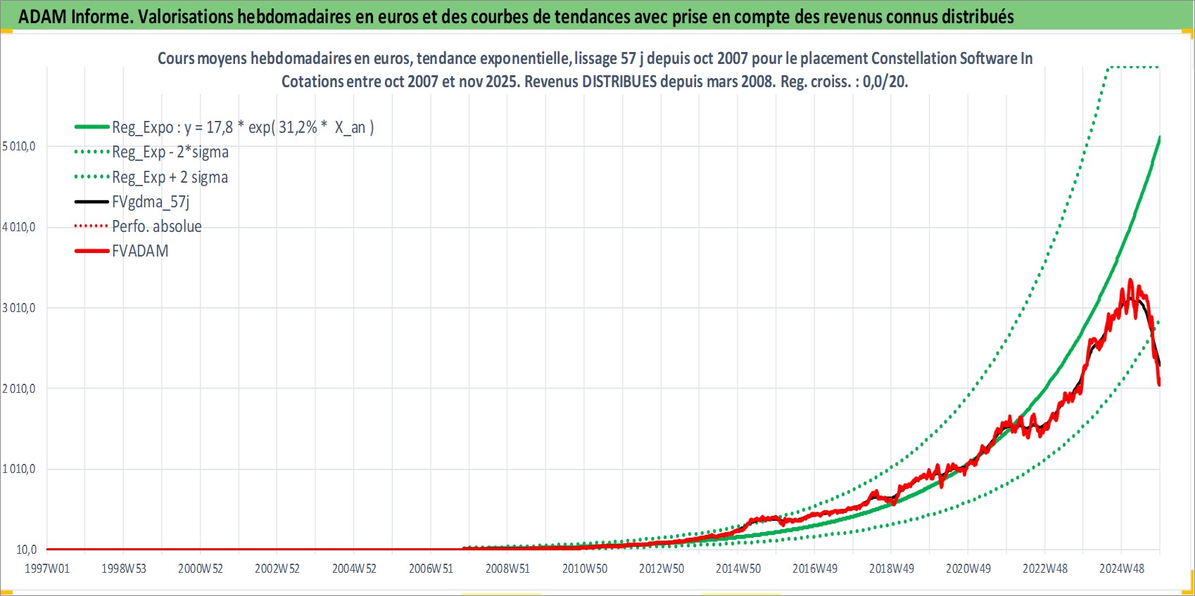Site dédié aux investisseursPage dédiée sur site financeAnalyse des valorisations hebdomadaires de l'action Constellation Software Inc. Cet actif est cote en CAD. Les valorisations sont en contrevaleur EURO et couvrent les semaines 2007W43 a 2025W48. Les revenus de cet actif financier sont pris en compte depuis la semaine 2008W12. La note globale ESG de cet actif est estimee a 6.0 (apres rebasage entre 0 et 20).