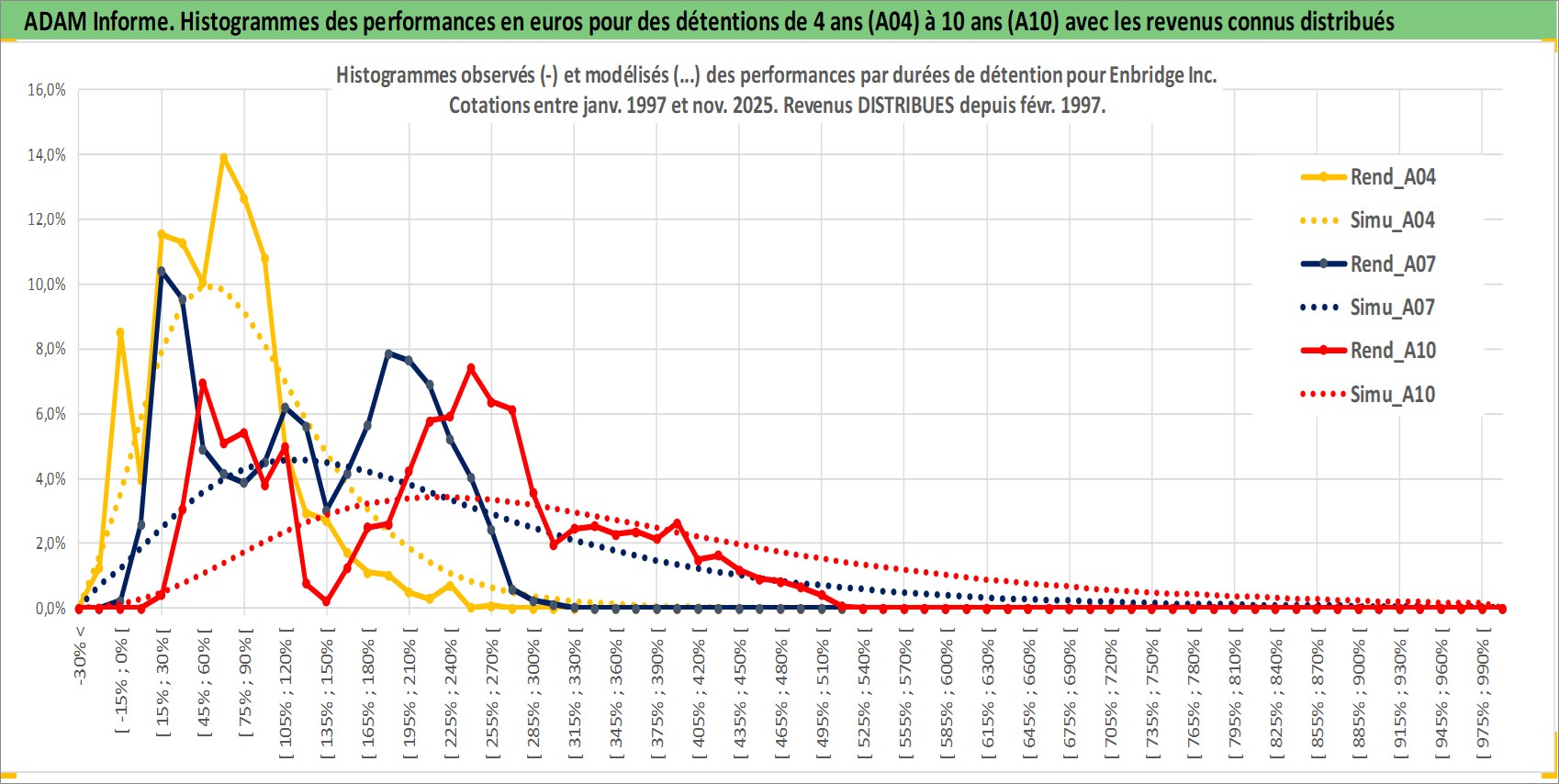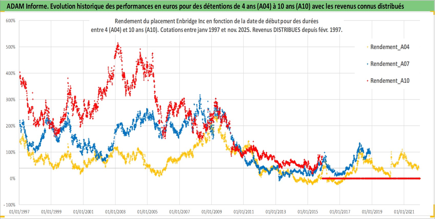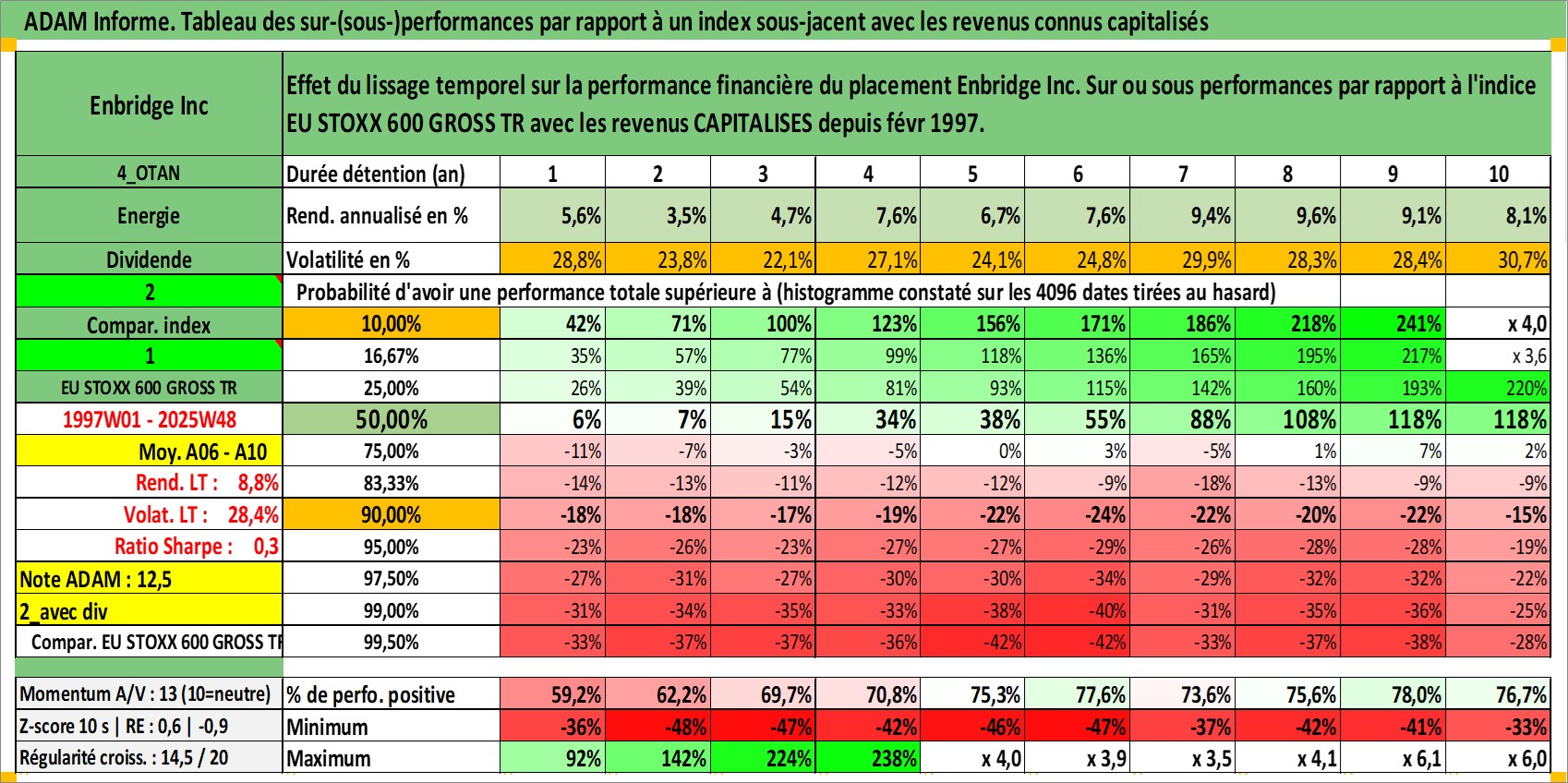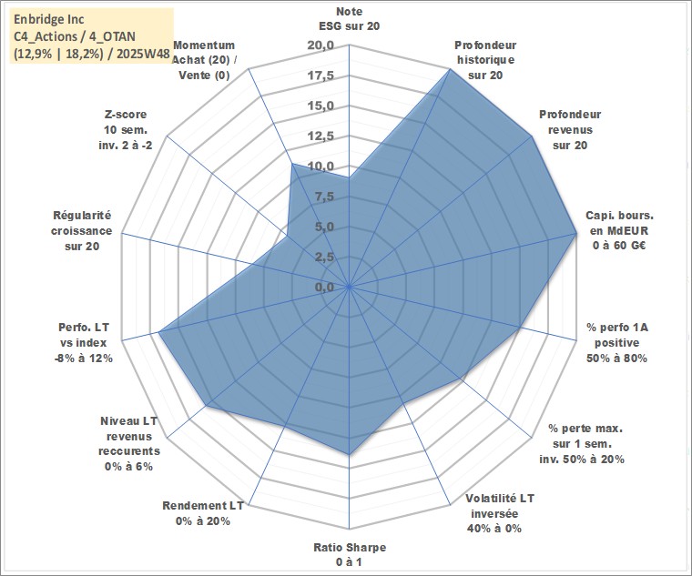 Site dédié aux investisseursPage dédiée sur site financeAnalyse des valorisations hebdomadaires de l'action Enbridge Inc. Cet actif est cote en CAD. Les valorisations sont en contrevaleur EURO et couvrent les semaines 1997W01 a 2025W48. Les revenus de cet actif financier sont pris en compte depuis la semaine 1997W07. La note globale ESG de cet actif est estimee a 9.0 (apres rebasage entre 0 et 20).