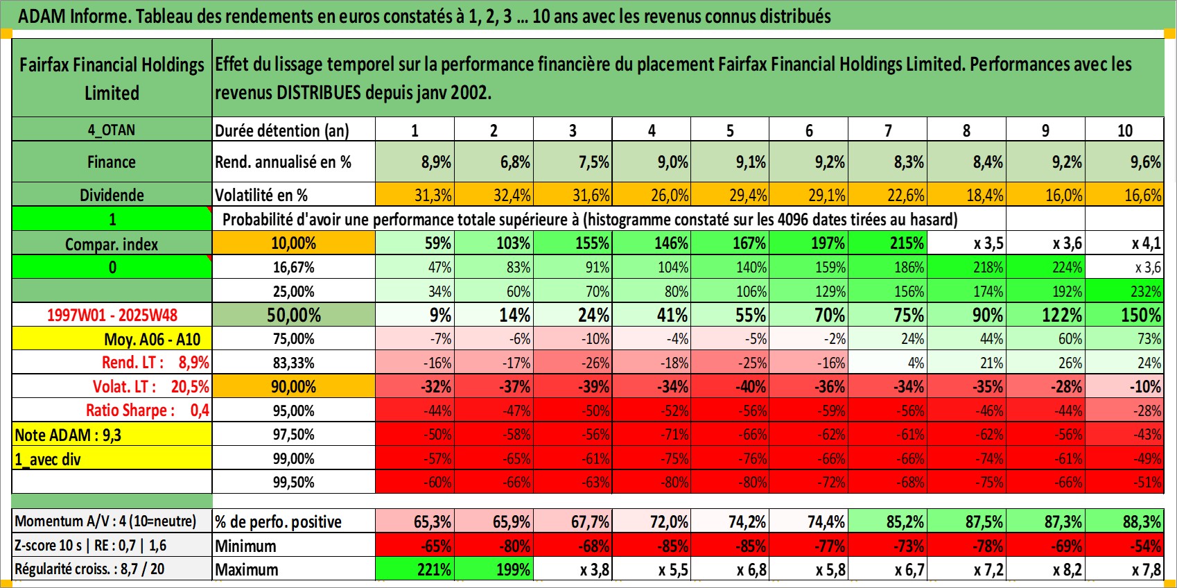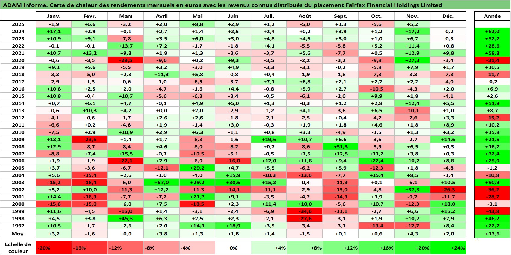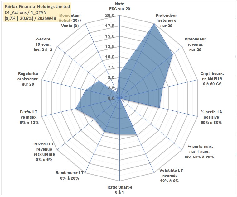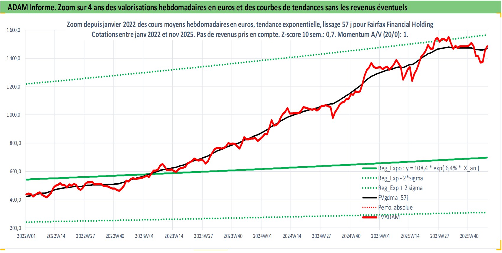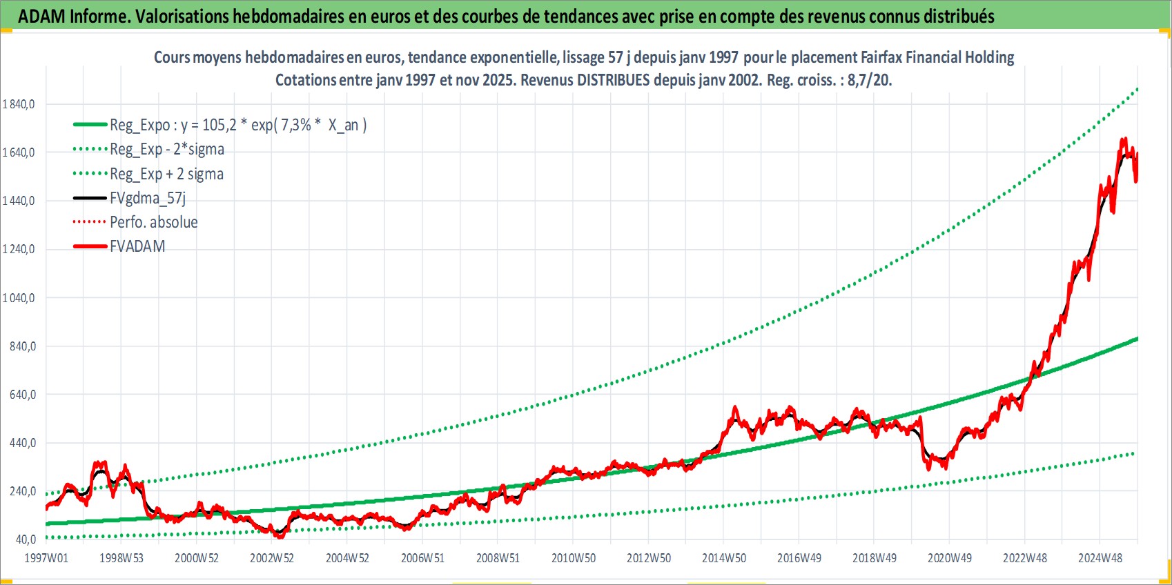 Site dédié aux investisseursPage dédiée sur site financeAnalyse des valorisations hebdomadaires de l'action Fairfax Financial Holdings Limited. Cet actif est cote en CAD. Les valorisations sont en contrevaleur EURO et couvrent les semaines 1997W01 a 2025W48. Les revenus de cet actif financier sont pris en compte depuis la semaine 2002W02. La note globale ESG de cet actif est estimee a 6.0 (apres rebasage entre 0 et 20).